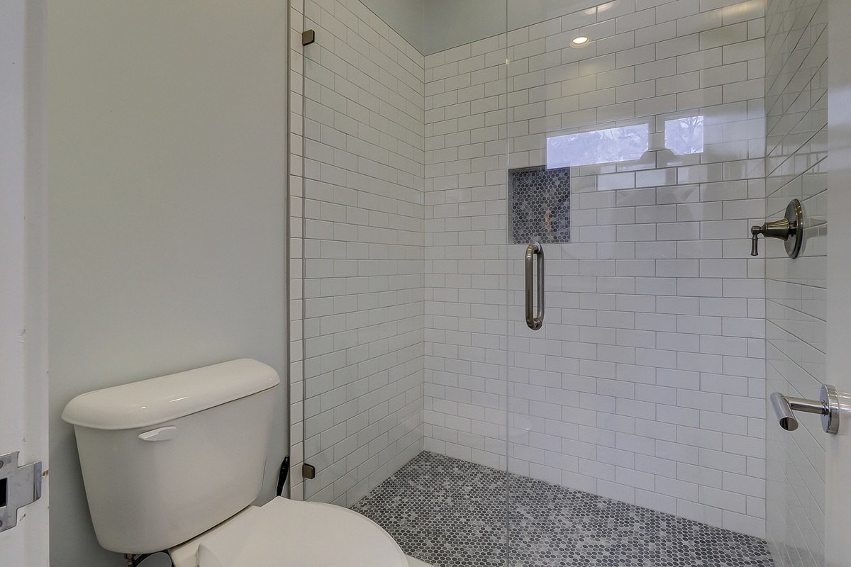 Heading upstairs, we find three more bedrooms rife with luxurious charm. The first, set off from the main living space by a set of stairs, surrounds two double beds with windows bathing the room in natural light. This guest room enjoys a flat-screen TV and access to a private bath with spacious walk-in shower.
