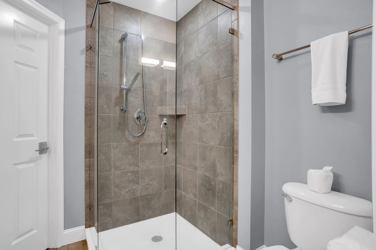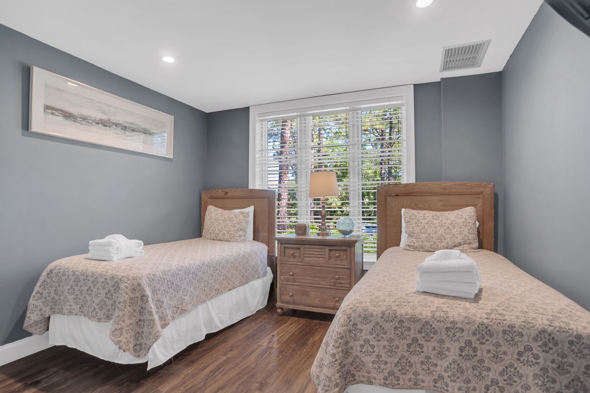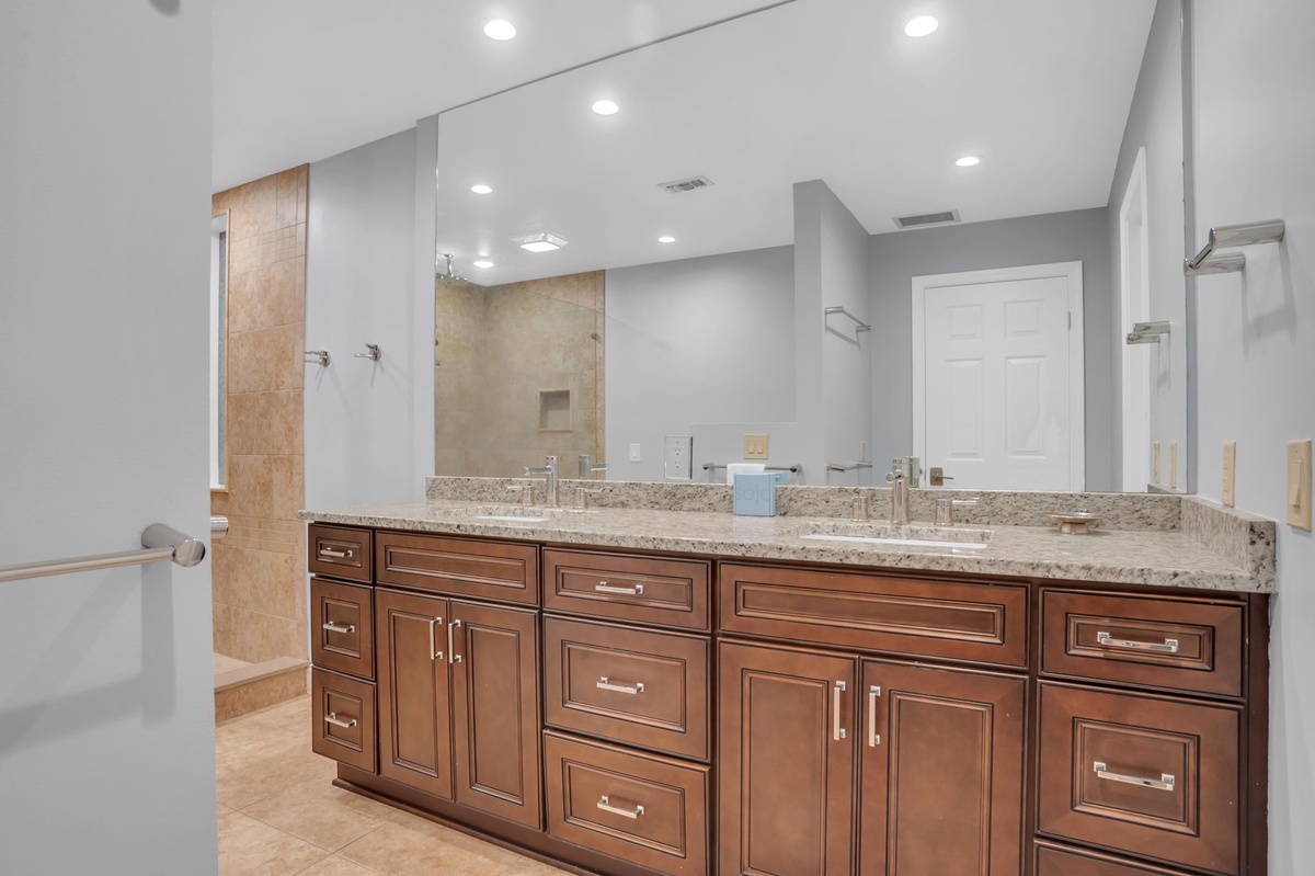 Three bedrooms can be found throughout this sprawling footprint. The first pairs two twin beds in lime green linens that contrast beautifully with a rich neutral color scheme. This room enjoys a wall-mounted flat-screen TV, plus private bath with granite-topped single basin vanity and walk-in corner shower with multi-function showerhead.