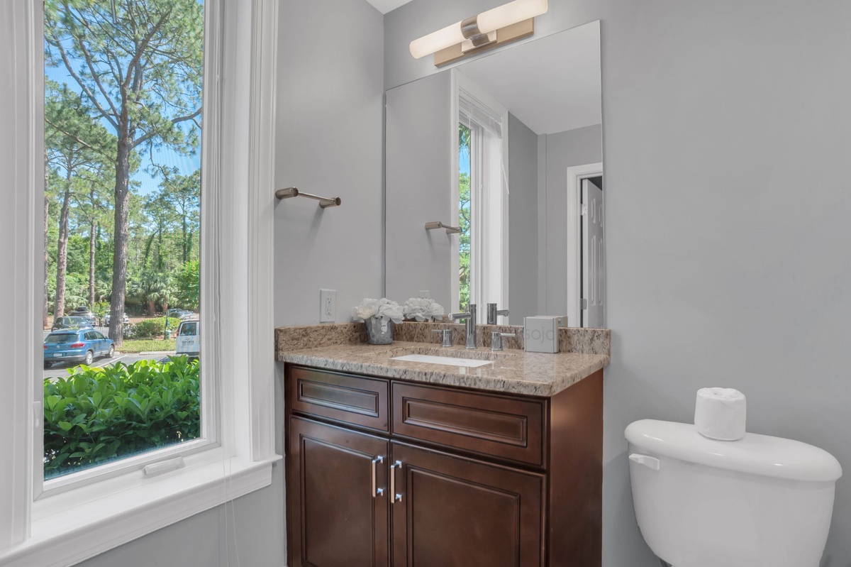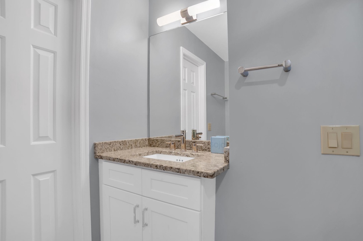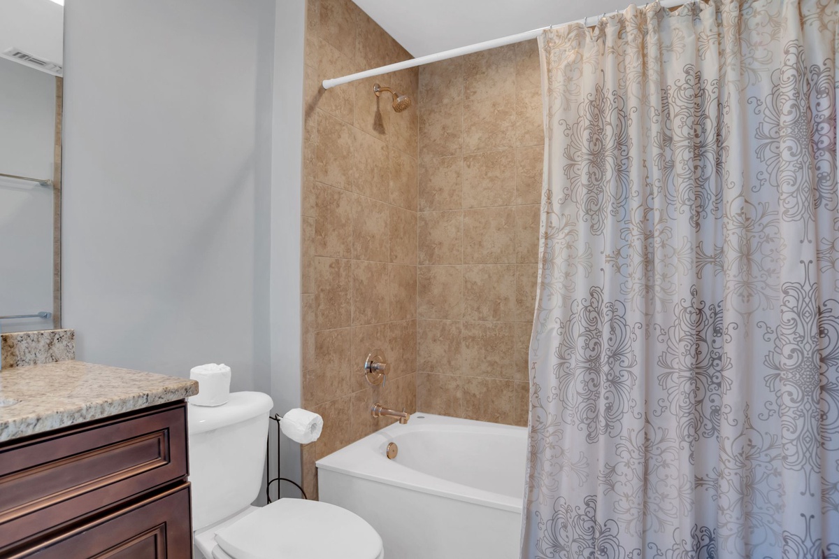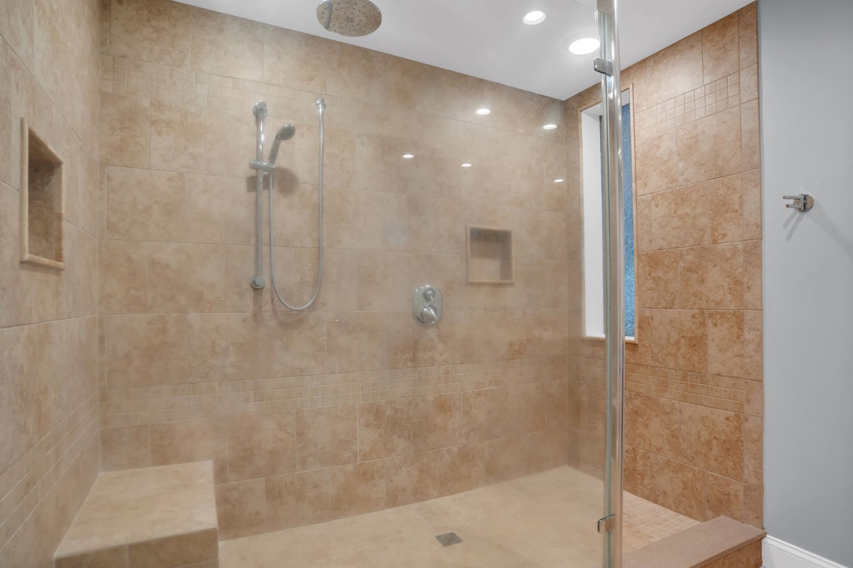 Three bedrooms can be found throughout this sprawling footprint. The first pairs two twin beds in lime green linens that contrast beautifully with a rich neutral color scheme. This room enjoys a wall-mounted flat-screen TV, plus private bath with granite-topped single basin vanity and walk-in corner shower with multi-function showerhead.