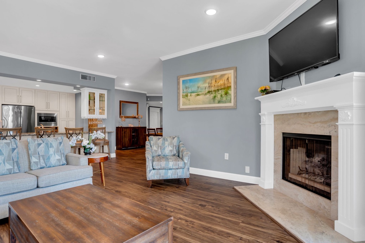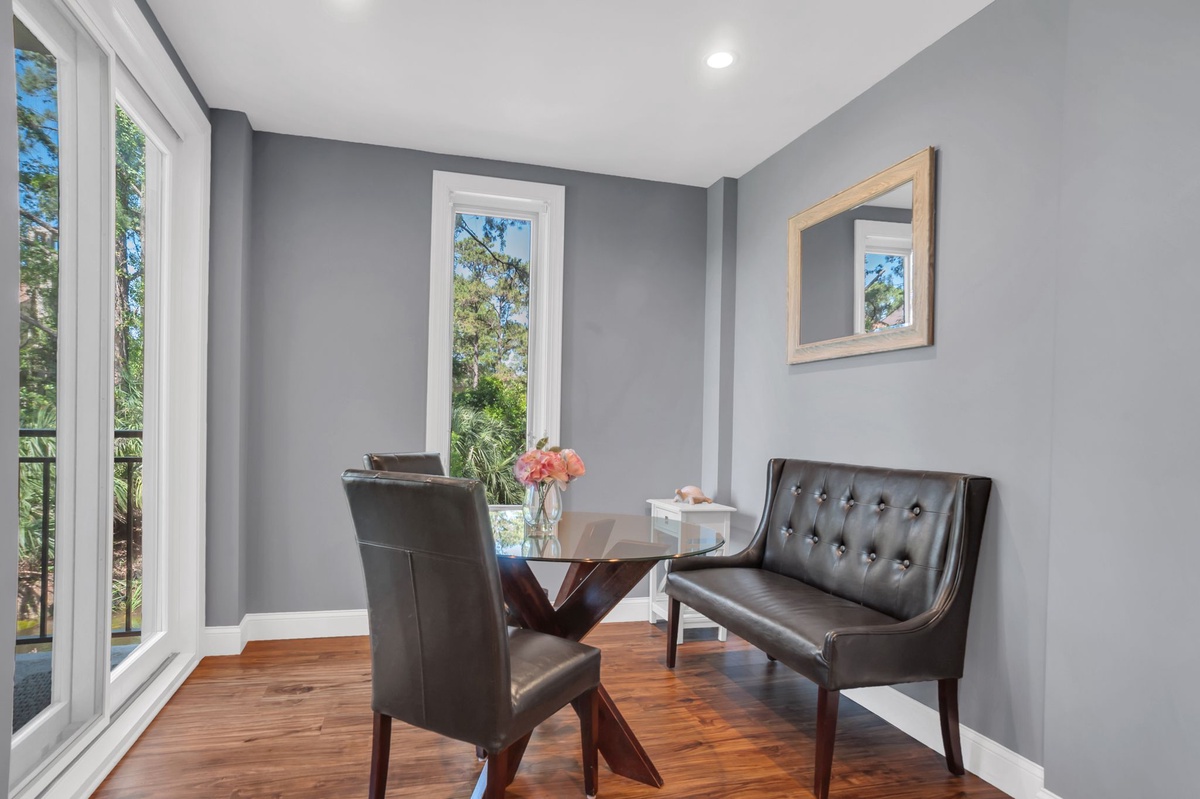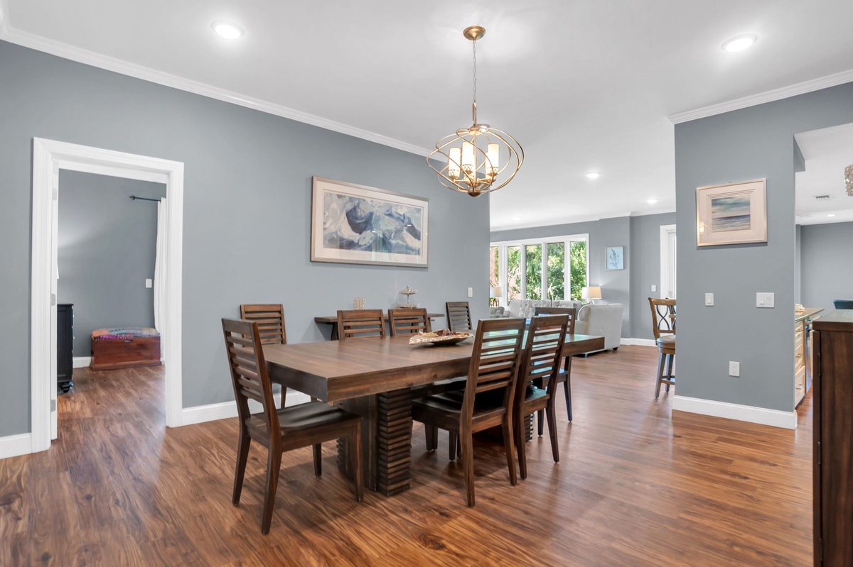 Rich dark hardwood floors invite you into an open floor plan that allows for an airy sense of space while neatly giving every area its own character. In the spacious dining room, seating for eight under a delightfully modern chandelier provides an elegant introduction to the rest of the house.