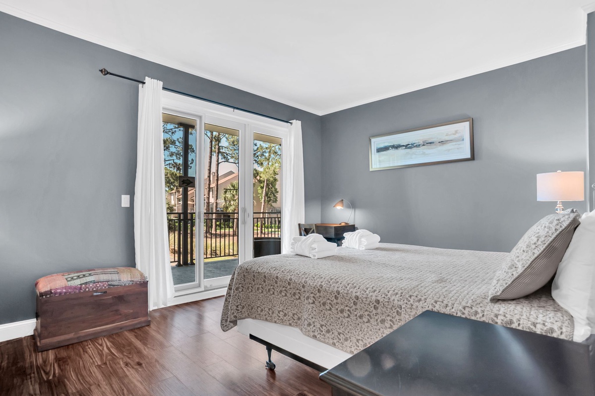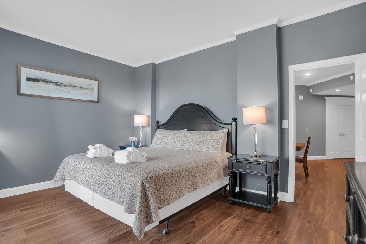 The property’s third bedroom, set apart from the main living spaces enjoys ample privacy for solitude and relaxation. Here a wide king-size bed in attractively artistic linens in blue and green with coastal-inspired headboard and footboard enjoys views of a wall-mounted flat-screen TV, light streaming in through ample windows, and en suite with single basin vanity tub and shower set with wide block tiles.
