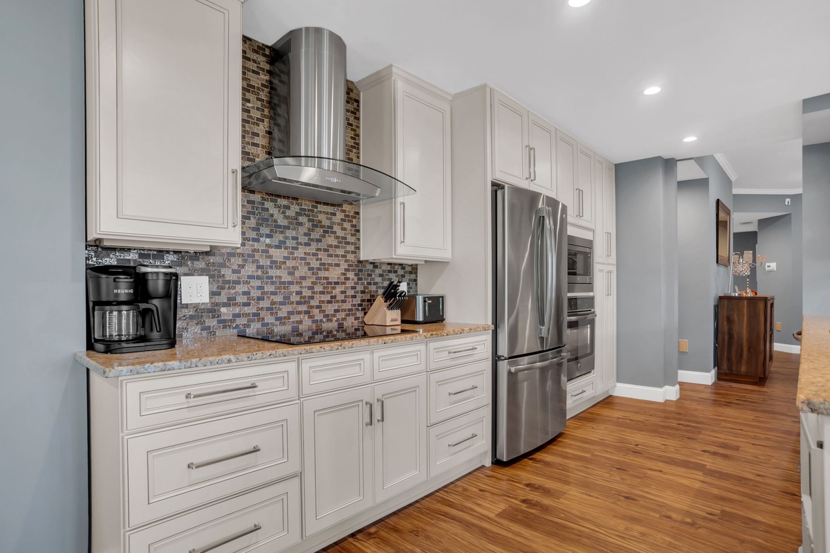 The kitchen carries the modern theme beautifully thanks to expansive counters set in monochromatic speckled granite and a steel gray and black glass tile backsplash. High-end GE Profile appliances like a French door refrigerator, spacious oven and flat cooktop create a playground for the gourmet, while the striking rounded Zephy range hood exudes modern elegance.
