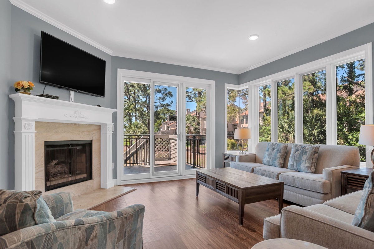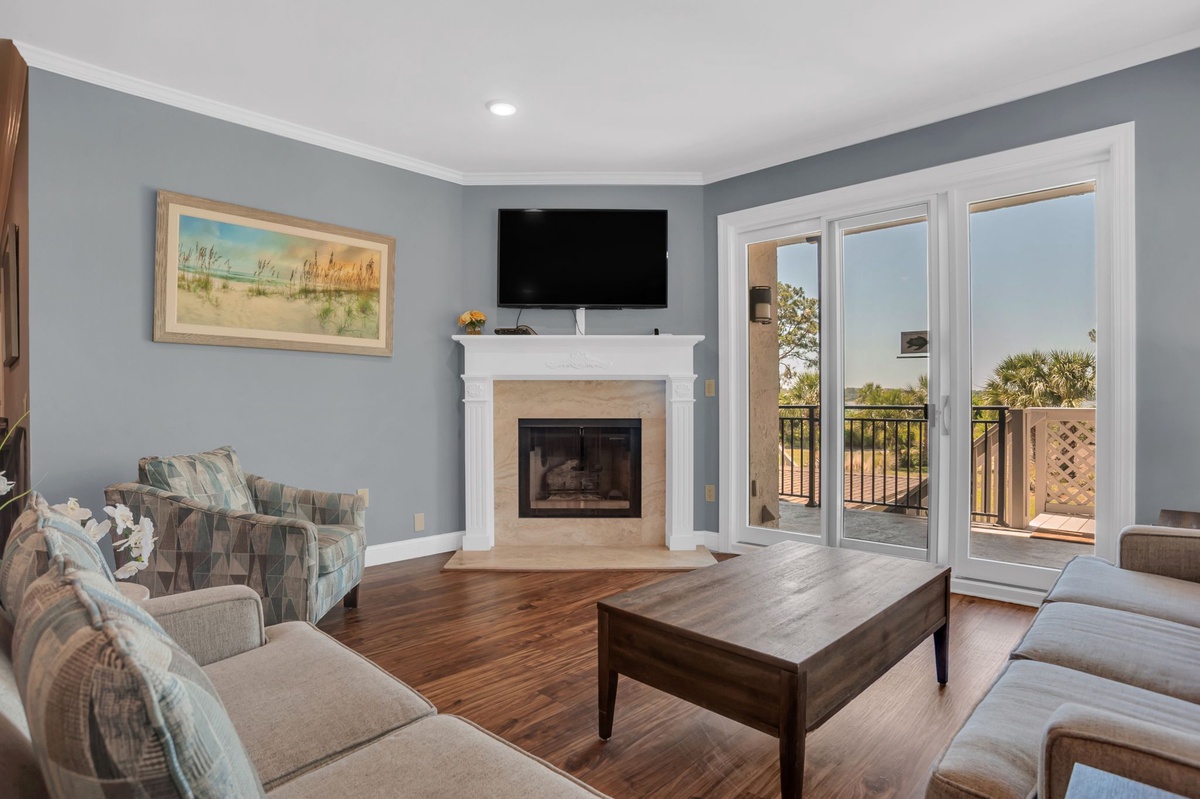 Just beyond, natural light streams in from a panorama of window to an open and airy living room. Here, creamy linens on a plush loveseat, armchair and sofa contrast beautifully against a rich dark hardwood coffee table. A massive wall-mounted flat-screen TV set above an ornate fireplace anchors one wall, while jaw-dropping beach views carry the rest. Sliding glass doors lead out to a wide wooden deck with unhampered views of the rolling dunes and the waves beyond.