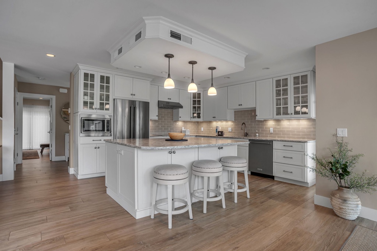 The open flow of the villa guides you into the magnificently spacious kitchen, with bar seating for three at a wide granite center island facing a full suite of updated stainless steel appliances. Nearby, the full laundry offers a washer and dryer for convenience. The layout of the kitchen lets you cook while enjoying lagoon views through the panorama of windows surrounding the formal dining room with seating for six. Those windows open to a sun-dappled rear patio at the water’s edge, with rockers and outdoor seating.
