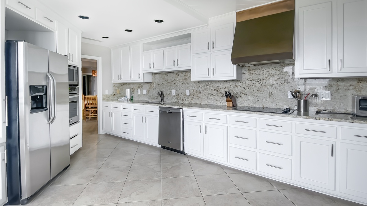 And the kitchen, is inspired place for an informal meal or for the family to gather in homey comfort. Drawing inspiration from both coastal and country kitchen décor, the kitchen provides plenty of room to dine via a charming metal-topped butcher block table. For the chef, plenty of prep space can be found in a dazzling granite countertop that runs the whole length of the kitchen and up the backsplash to the inspired custom cabinetry. A glass-top range and top of the line stainless steel appliances round out the many attractions in the kitchen.