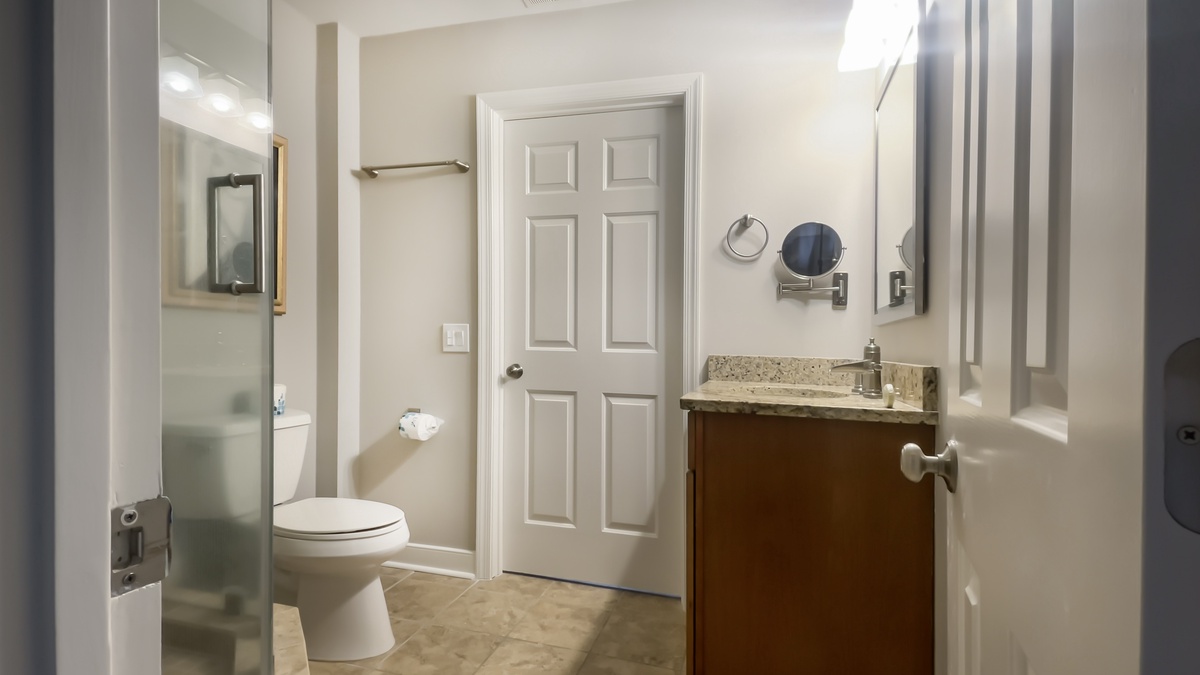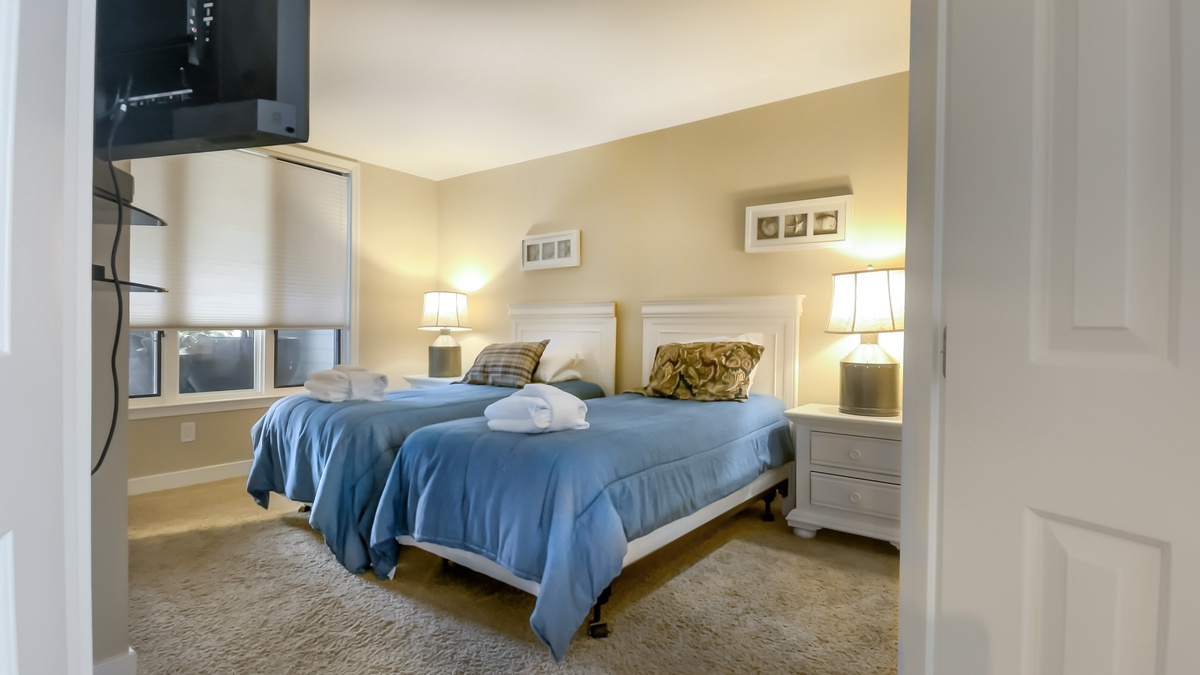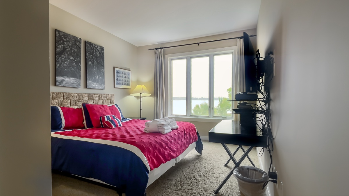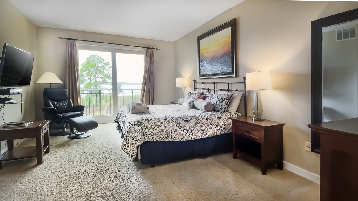 The master suite enjoys a real sense of serenity thanks to a private hallway that provides the privacy of a foyer and a sense of spaciousness. A wide king size is positioned for incredible views of the setting sun over the Sound through large sliding glass doors. Through those doors, guests can get up close and personal with the water views on a spacious private balcony. A recliner just next to the balcony doors provides the ultimate spot to unwind and watch the views, or turn to enjoy the wall-mounted flat-panel TV.