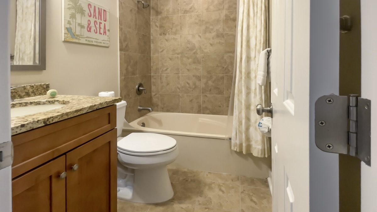 That view takes center stage as soon as you walk in, beautifully framed by an open living space. The spacious foyer with tile flooring sweeps toward the wide wrap-around view through a dining space featuring a beautiful oak dining table with seating for four. A nearby granite-topped wet bar allows for elegant entertaining for you and your guests. Just off the dining area, the living space with its massive flat-screen TV exults in the wraparound views, with a full sofa and love seat providing the best seats to watch the surf.