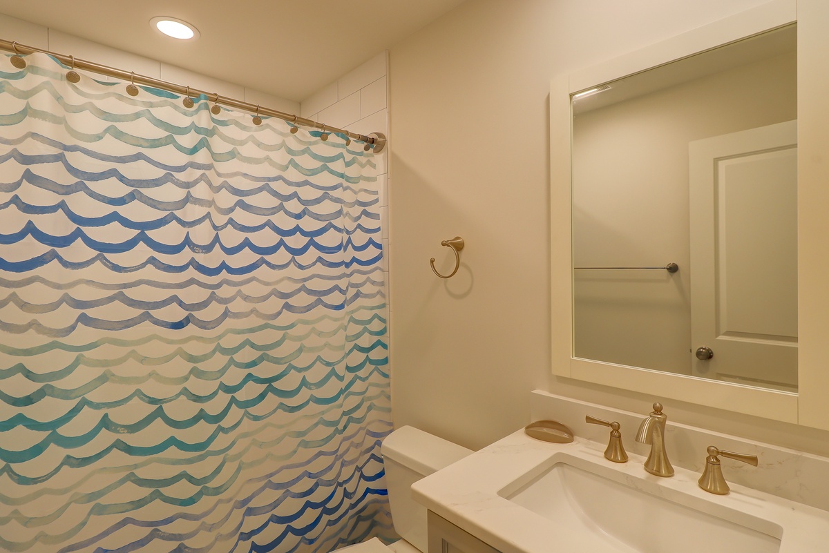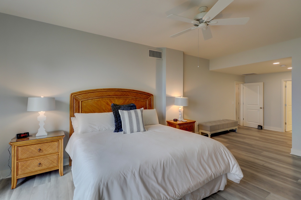 The master bedroom is quite large with a quaint terrace, views of the beach and Calibogue Sound and an oversized master bathroom with a double vanity. The room is furnished with a king-sized bed, double bureau, flat screen TV and a large desk.