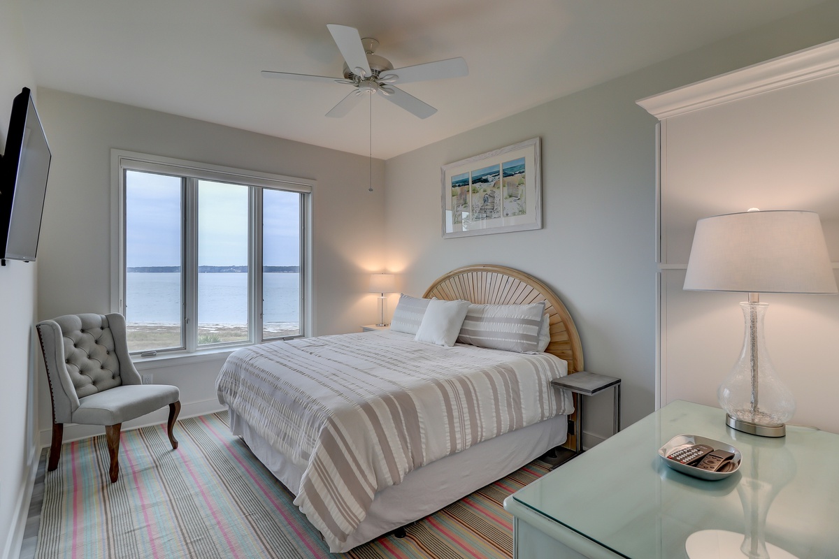 The second bedroom has views of the beach and sound, king-sized bed, bureau, nightstands, flat screen TV and a private bath.
