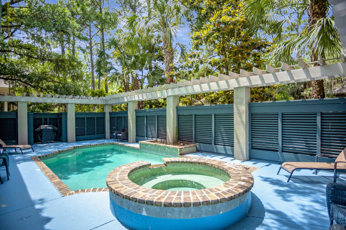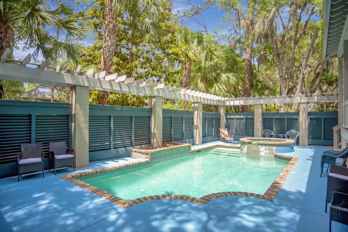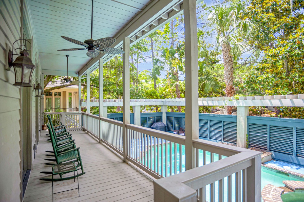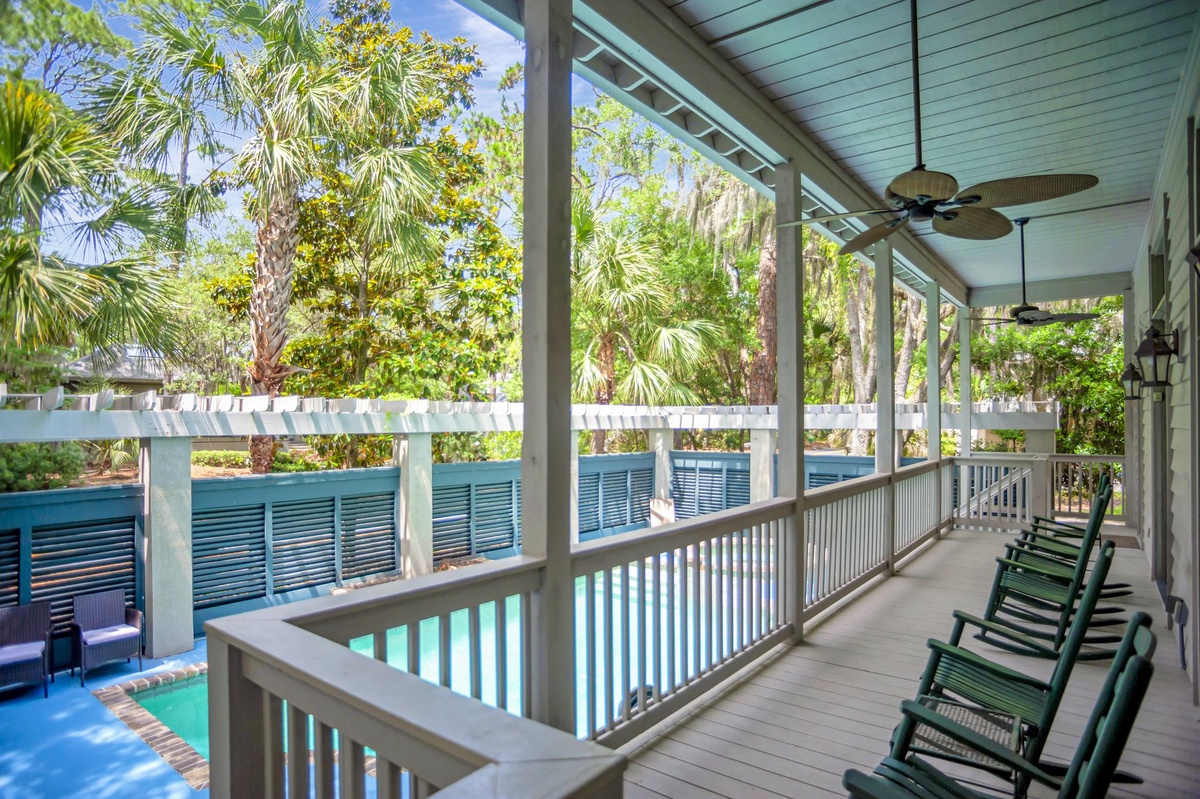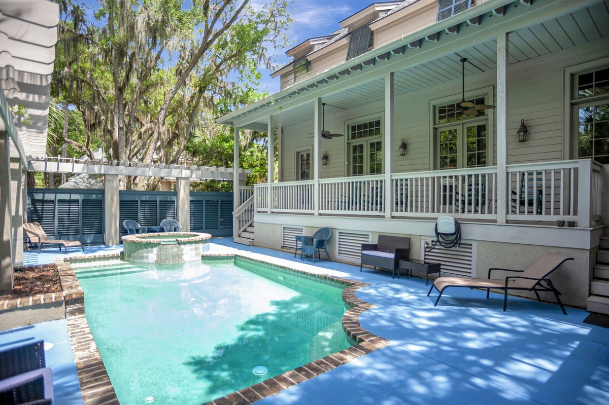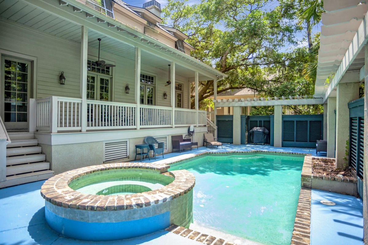 Three sets of French doors off the main living room showcase the brick-edged swimming pool and spa. A covered outdoor patio with rocking chairs views the pool and welcomes refreshing sea breezes.