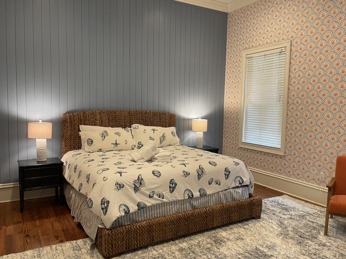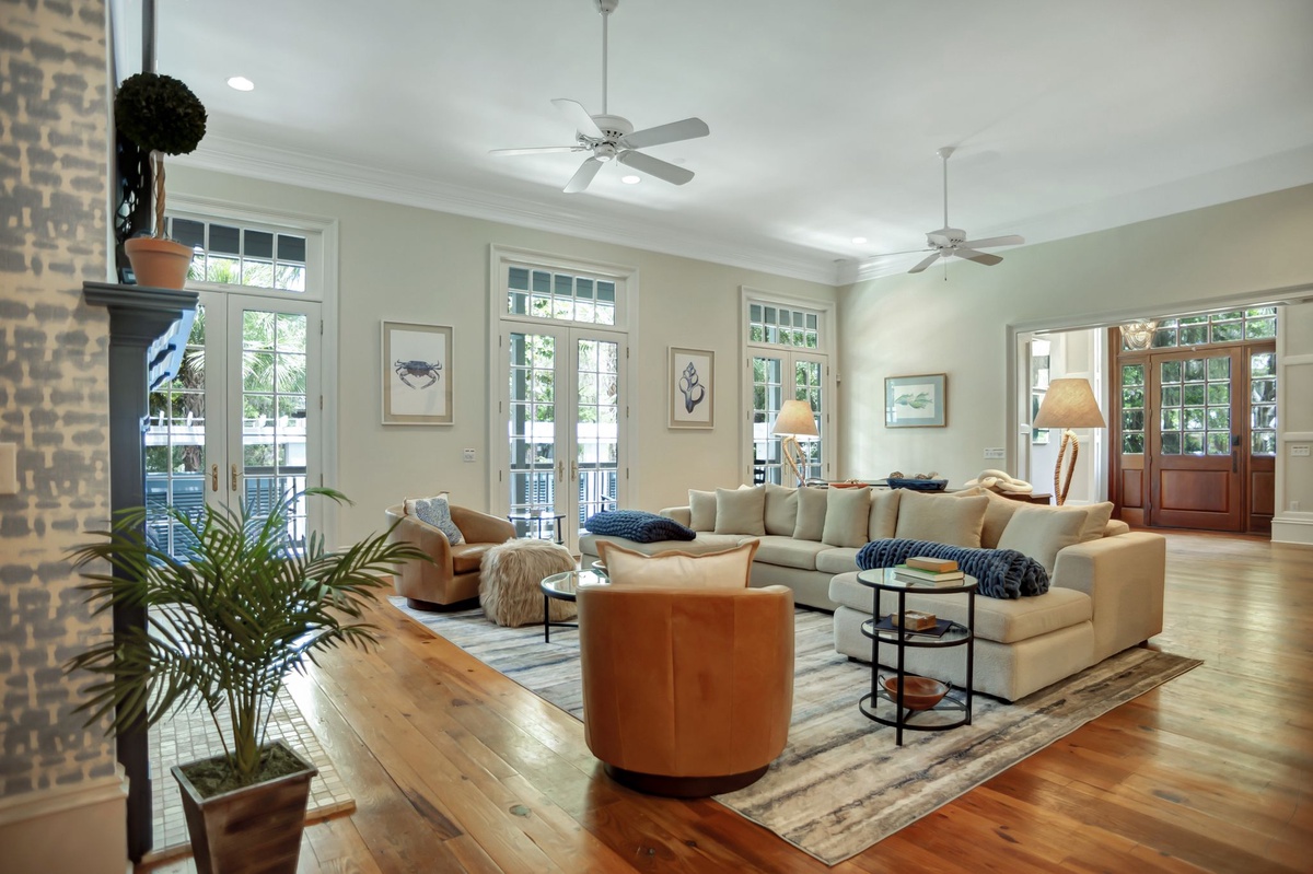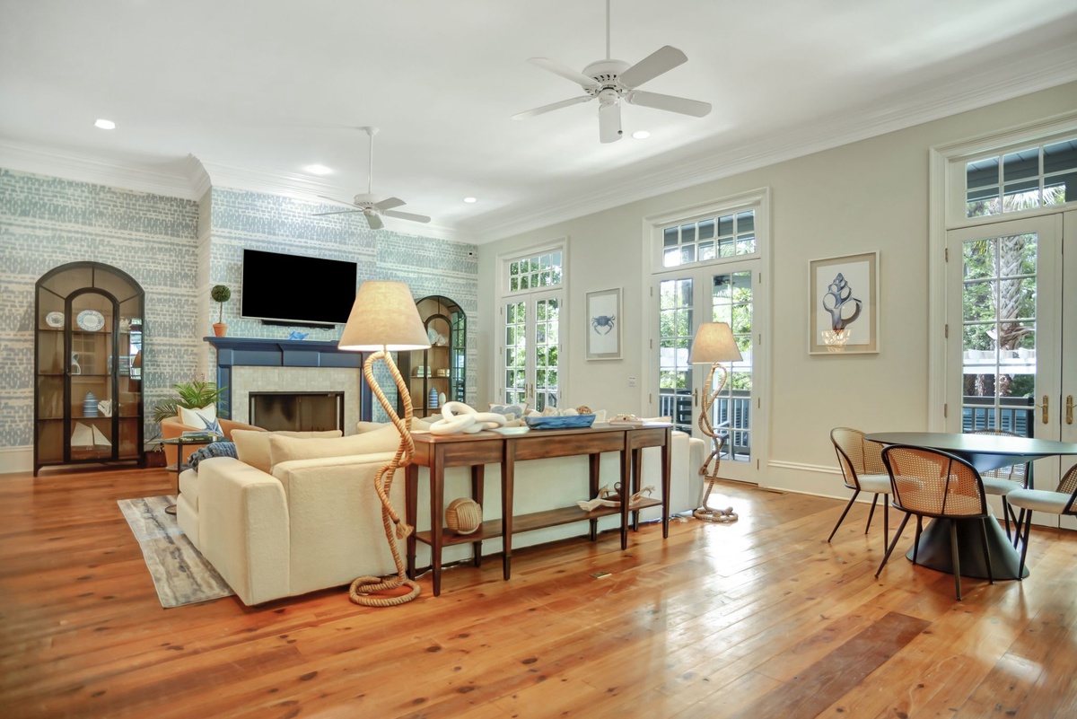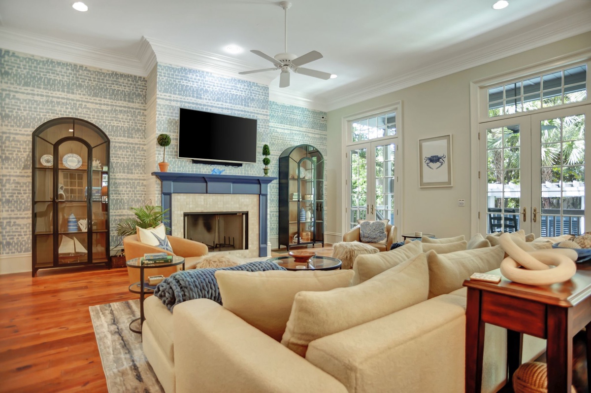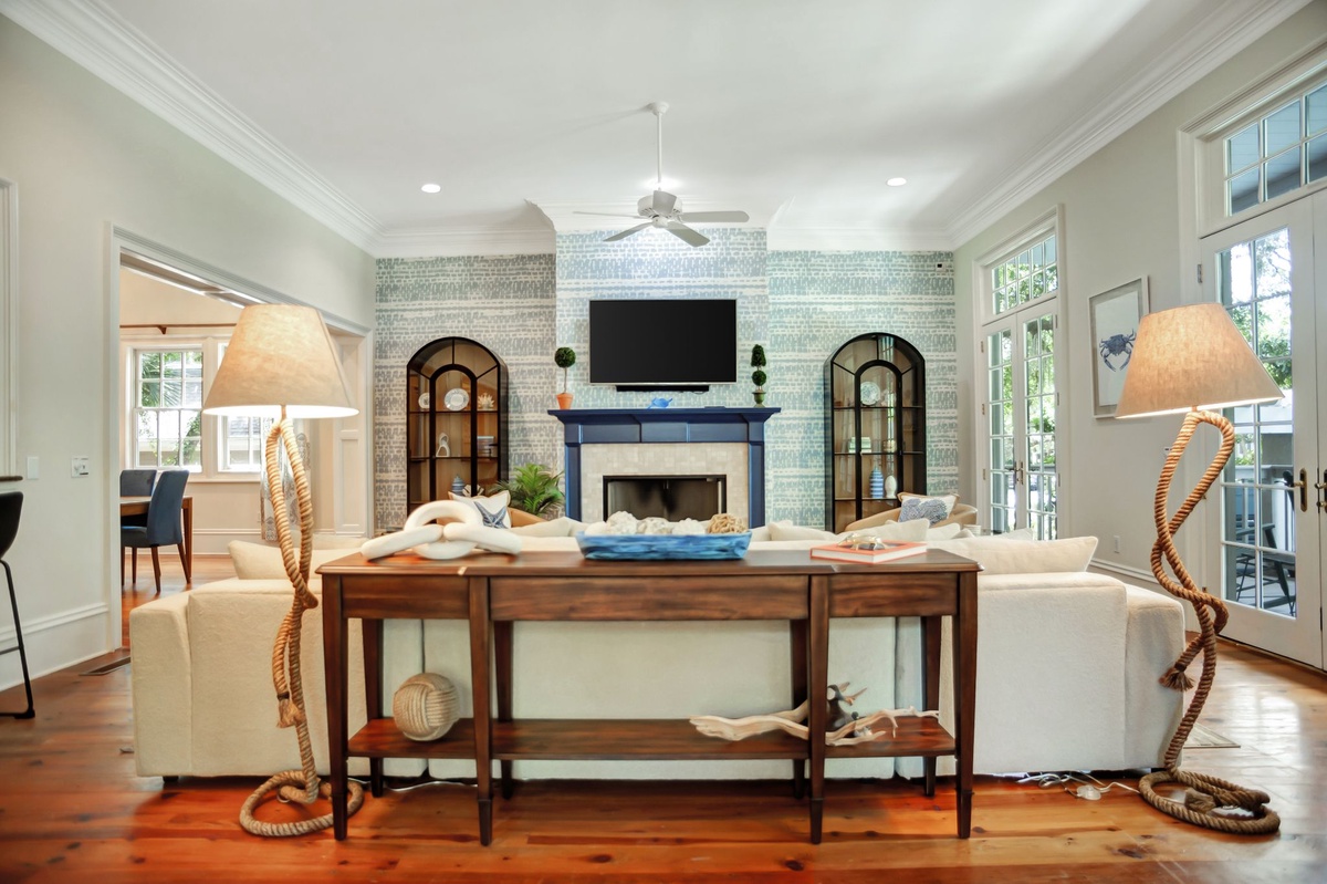 This is a true Southern home, graced with beautiful wide plank hardwood floors and wide-open spaces. Recently redecorated, there are new furnishings throughout this expansive home. A neutral sectional sofa anchors the main living space, flanked by two cozy barrel chairs and matching ottomans. An inviting decorative fireplace trimmed in blue with a large flat screen TV serves as the focal point for this relaxing retreat. There is an accent wall with water like wallpaper to add to the coastal vibe. Two glass storage cases, each housing coastal themed décor, are on either side of the fireplace, balancing out this room.