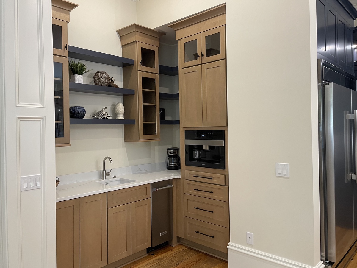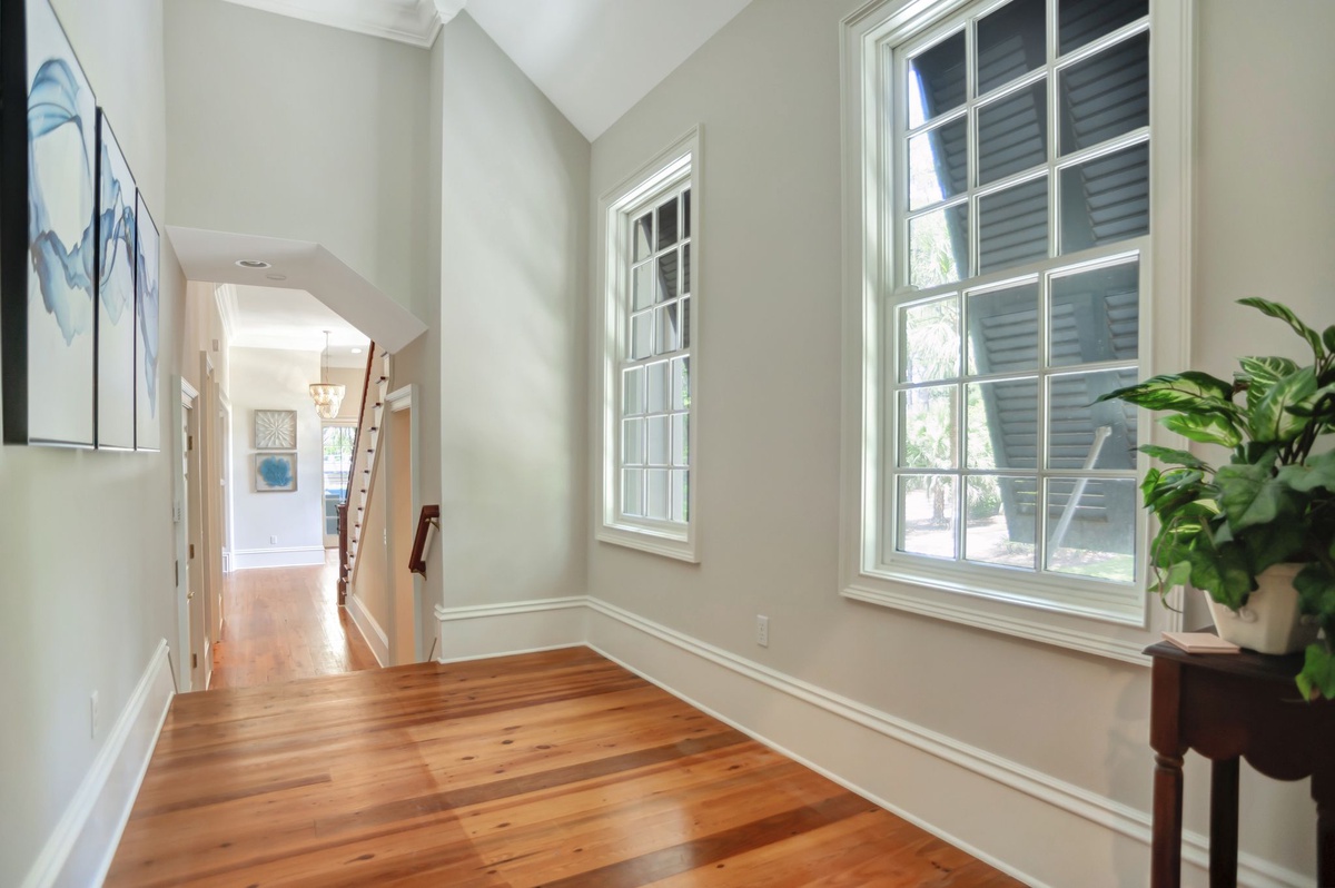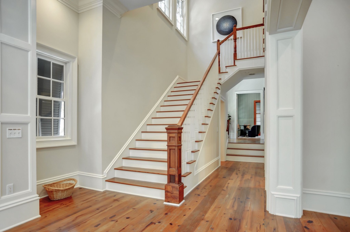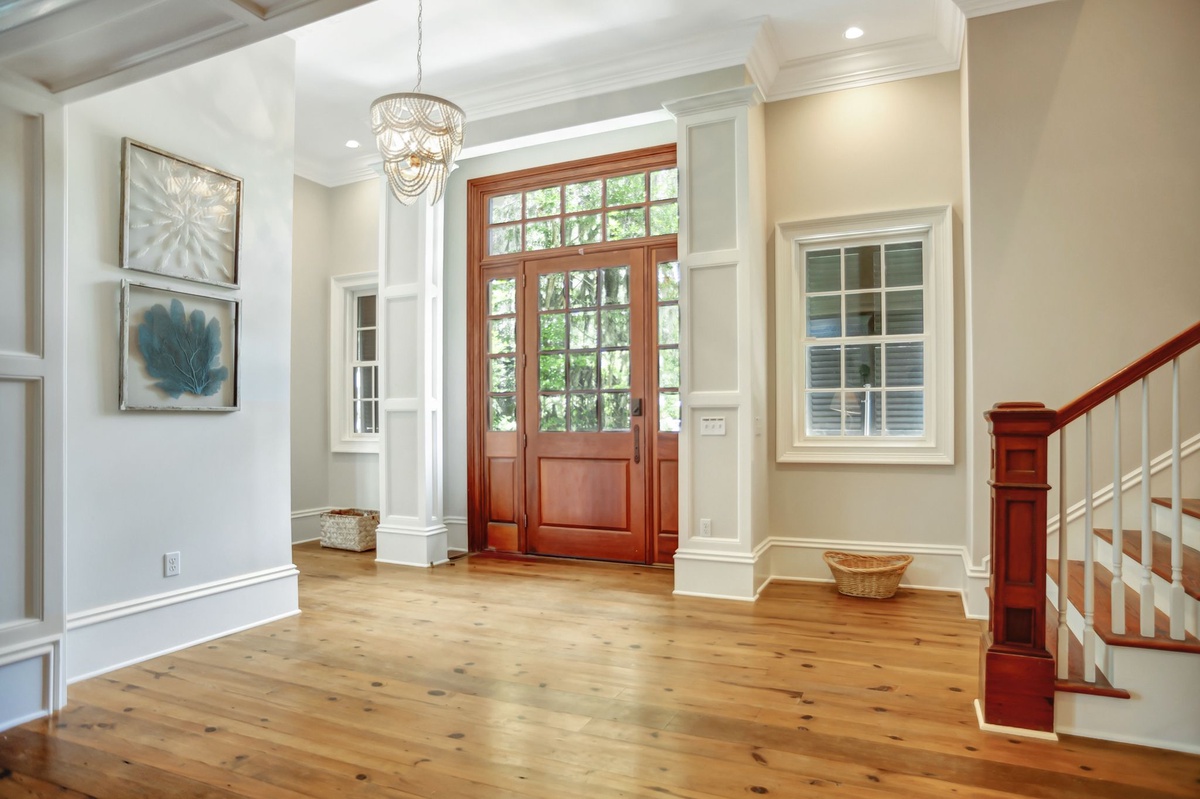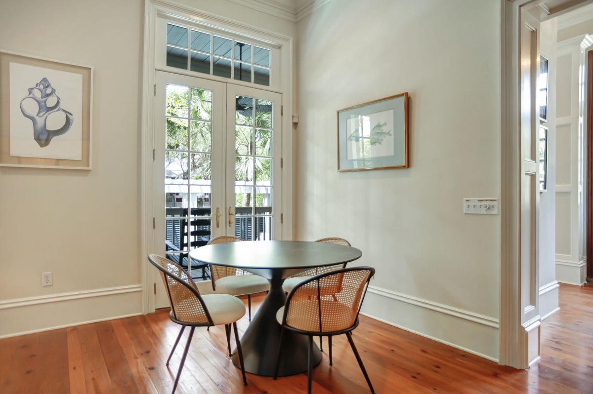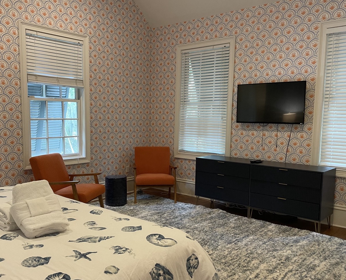 This is a true Southern home, graced with beautiful wide plank hardwood floors and wide-open spaces. Recently redecorated, there are new furnishings throughout this expansive home. A neutral sectional sofa anchors the main living space, flanked by two cozy barrel chairs and matching ottomans. An inviting decorative fireplace trimmed in blue with a large flat screen TV serves as the focal point for this relaxing retreat. There is an accent wall with water like wallpaper to add to the coastal vibe. Two glass storage cases, each housing coastal themed décor, are on either side of the fireplace, balancing out this room.