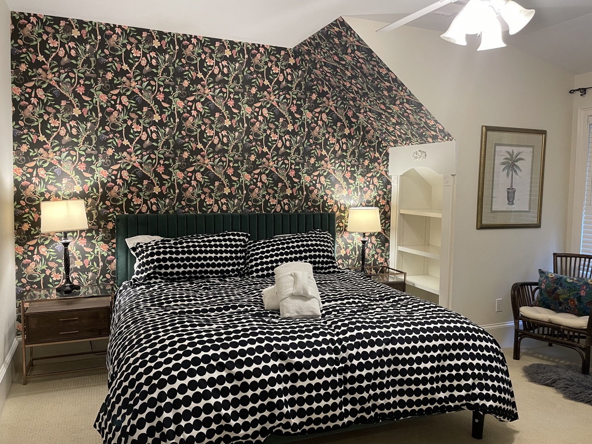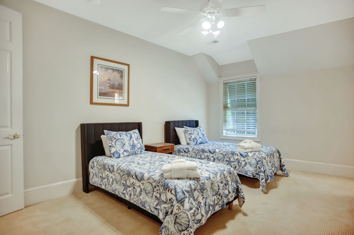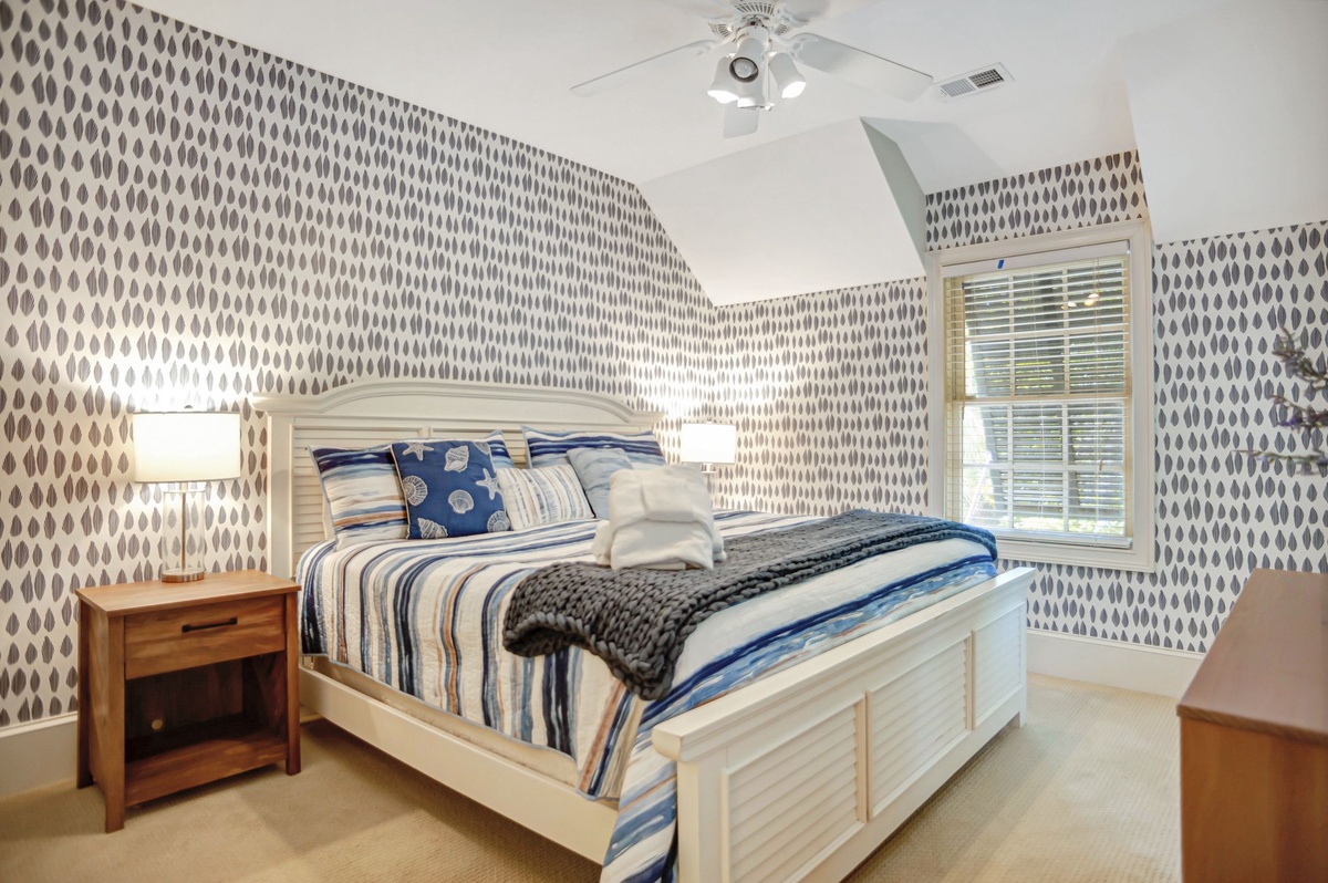 On the second level is each of the four remaining bedrooms, A king sized bed is at the top of the stairs, decked in coastal blues and neutrals. At the end of the hallway, the primary bedroom, featuring a jungle themed accent wall, has a king-sized bed with a separate tub and walk in shower. The bedroom across from the primary bedroom has a king-sized bed. The remaining guest bedroom has two twin beds. Each bedroom offers a private bathroom and flat screen TV. Additionally, the second floor includes a laundry room for added vacation convenience.