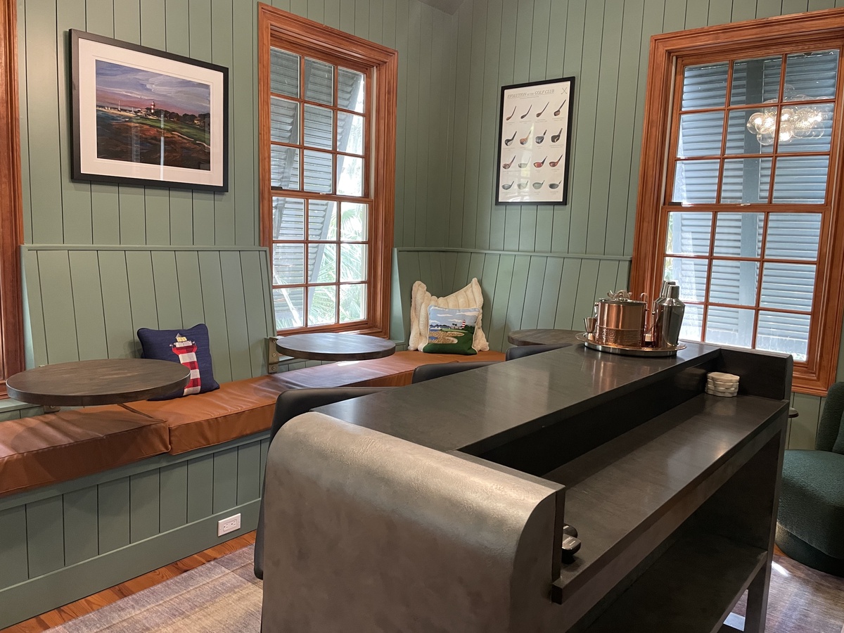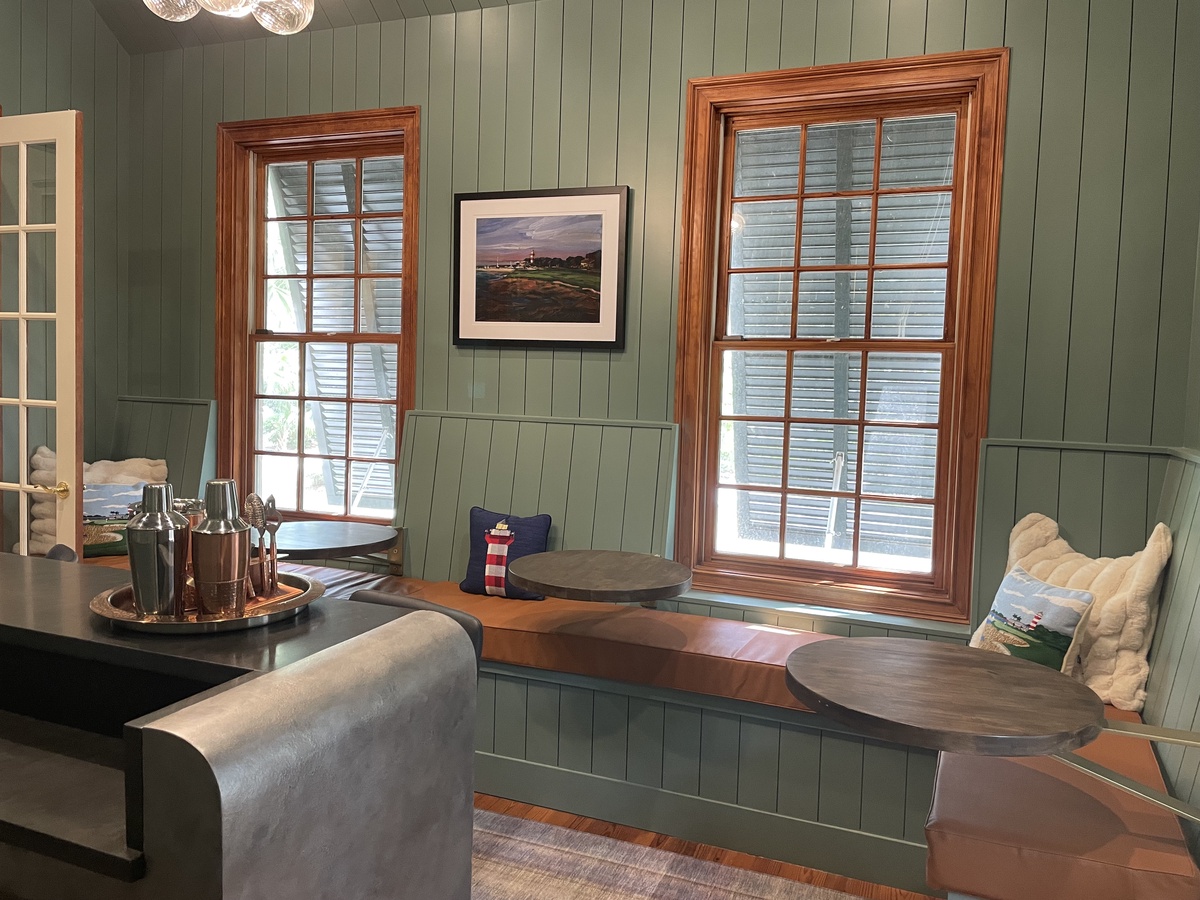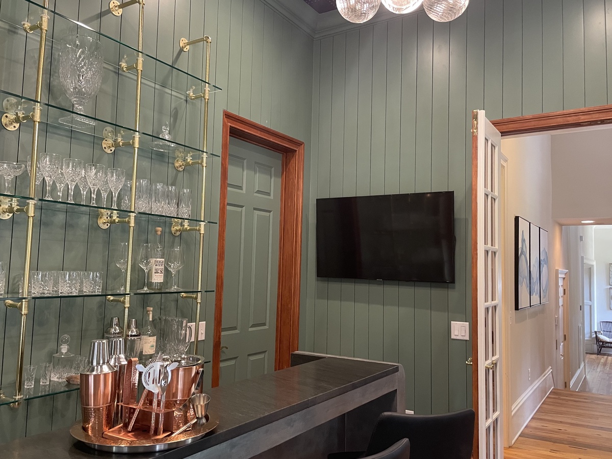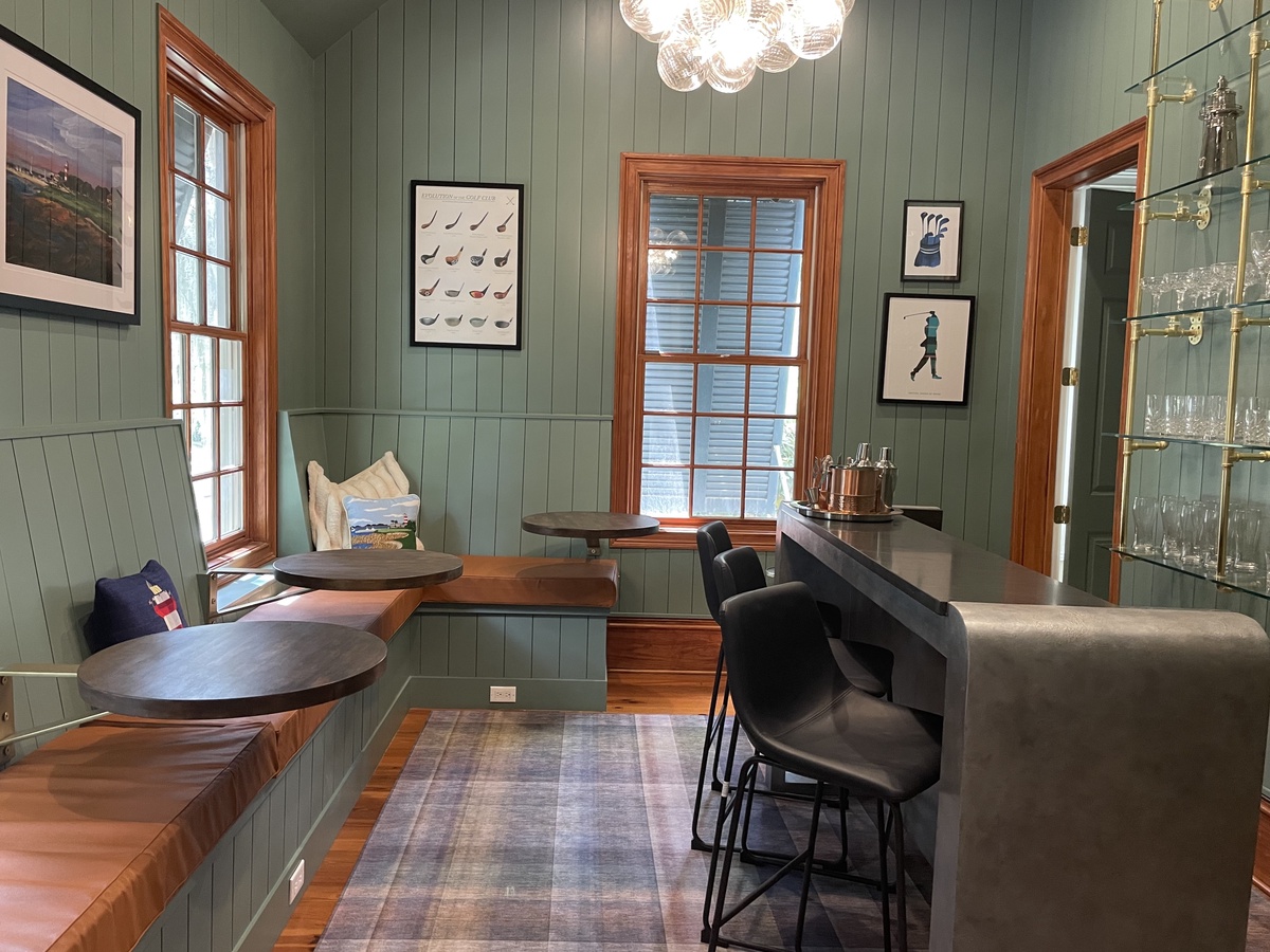 Just down the hall from the 1st floor primary suite, there’s a Speak-Easy finished in a luxurious deep blue-green with bench seating and round tables to sit and relax and enjoy a drink after a long day of activities. A full bath is adjacent to the Speak-Easy.