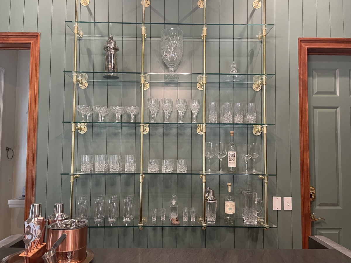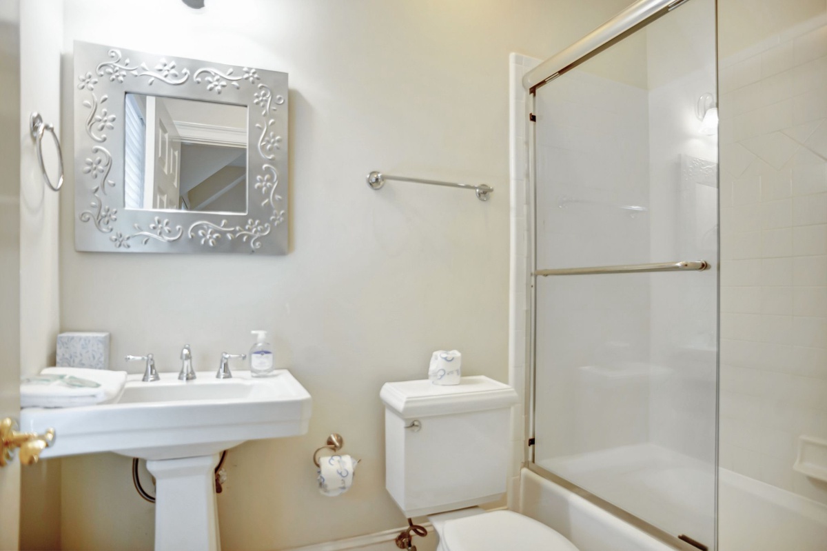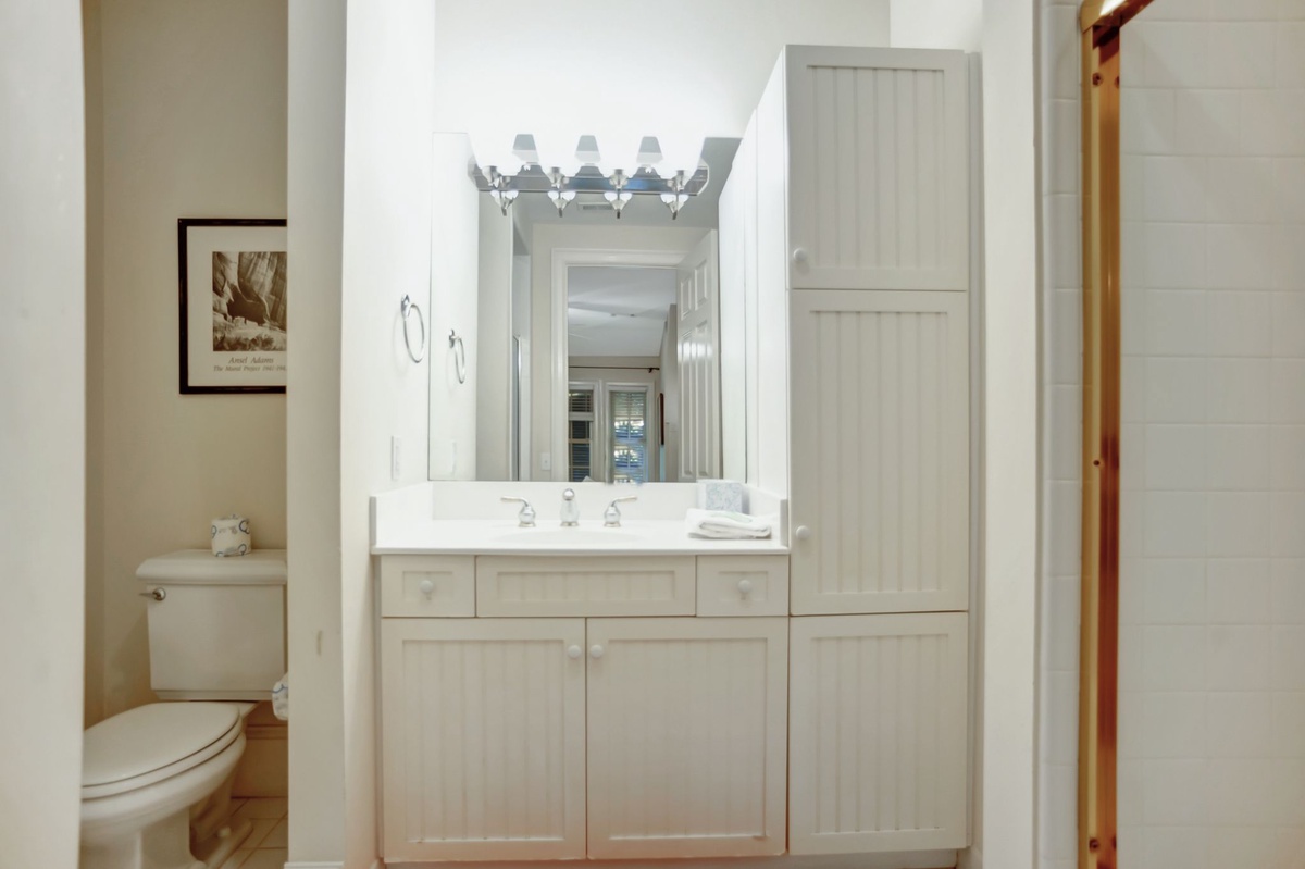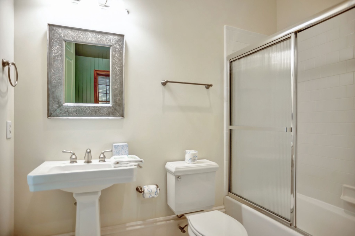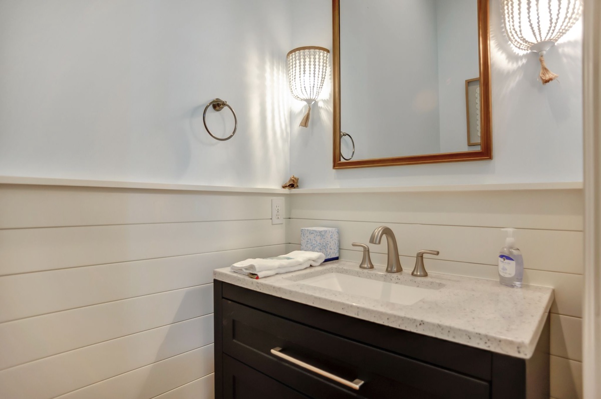 Just down the hall from the 1st floor primary suite, there’s a Speak-Easy finished in a luxurious deep blue-green with bench seating and round tables to sit and relax and enjoy a drink after a long day of activities. A full bath is adjacent to the Speak-Easy.