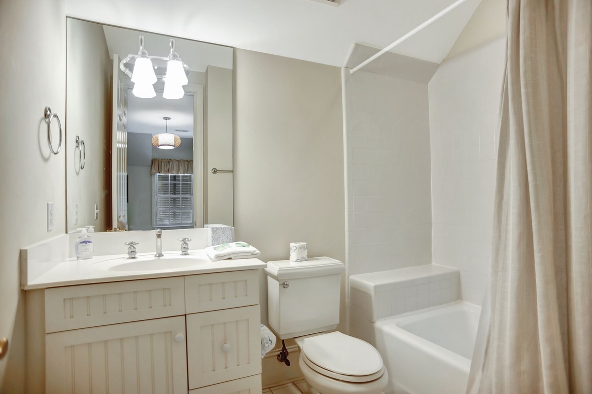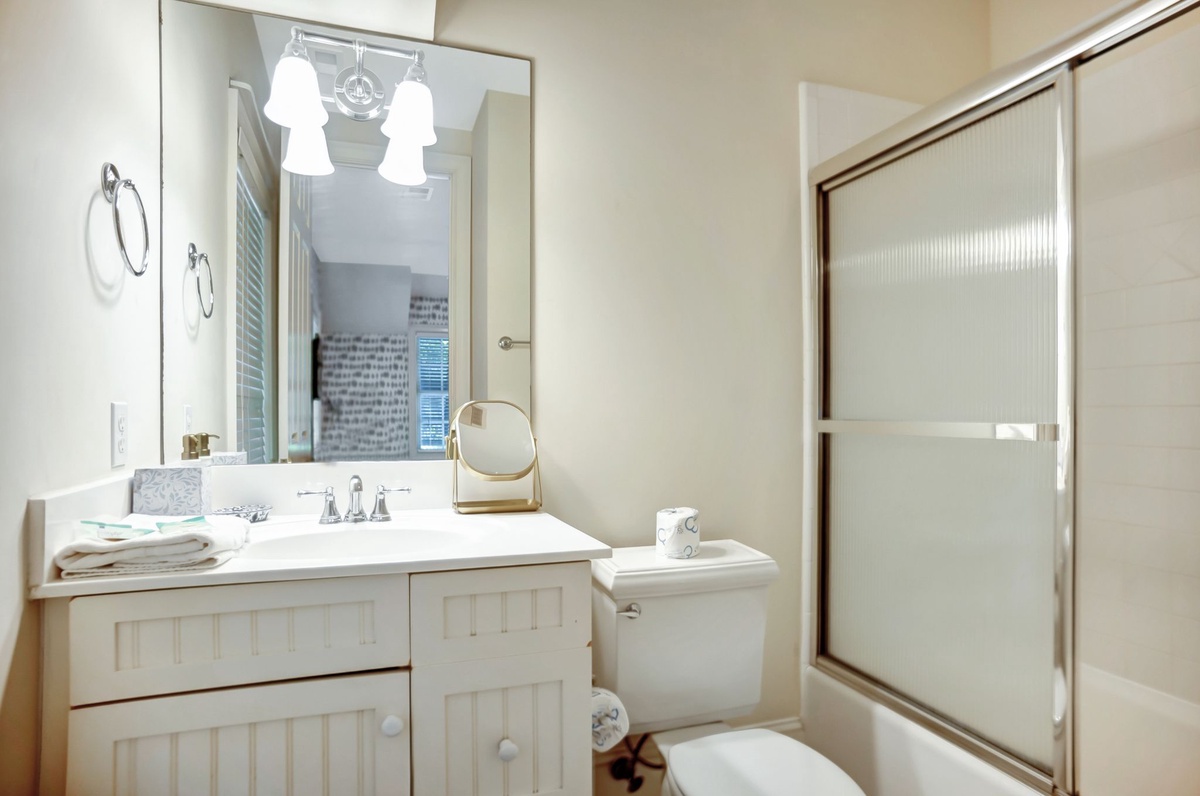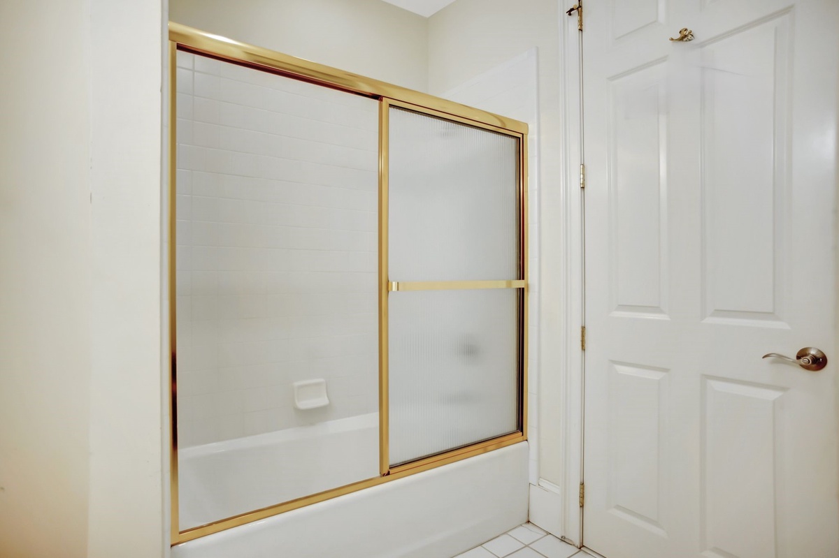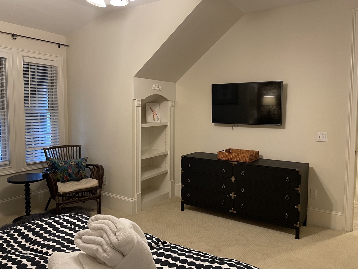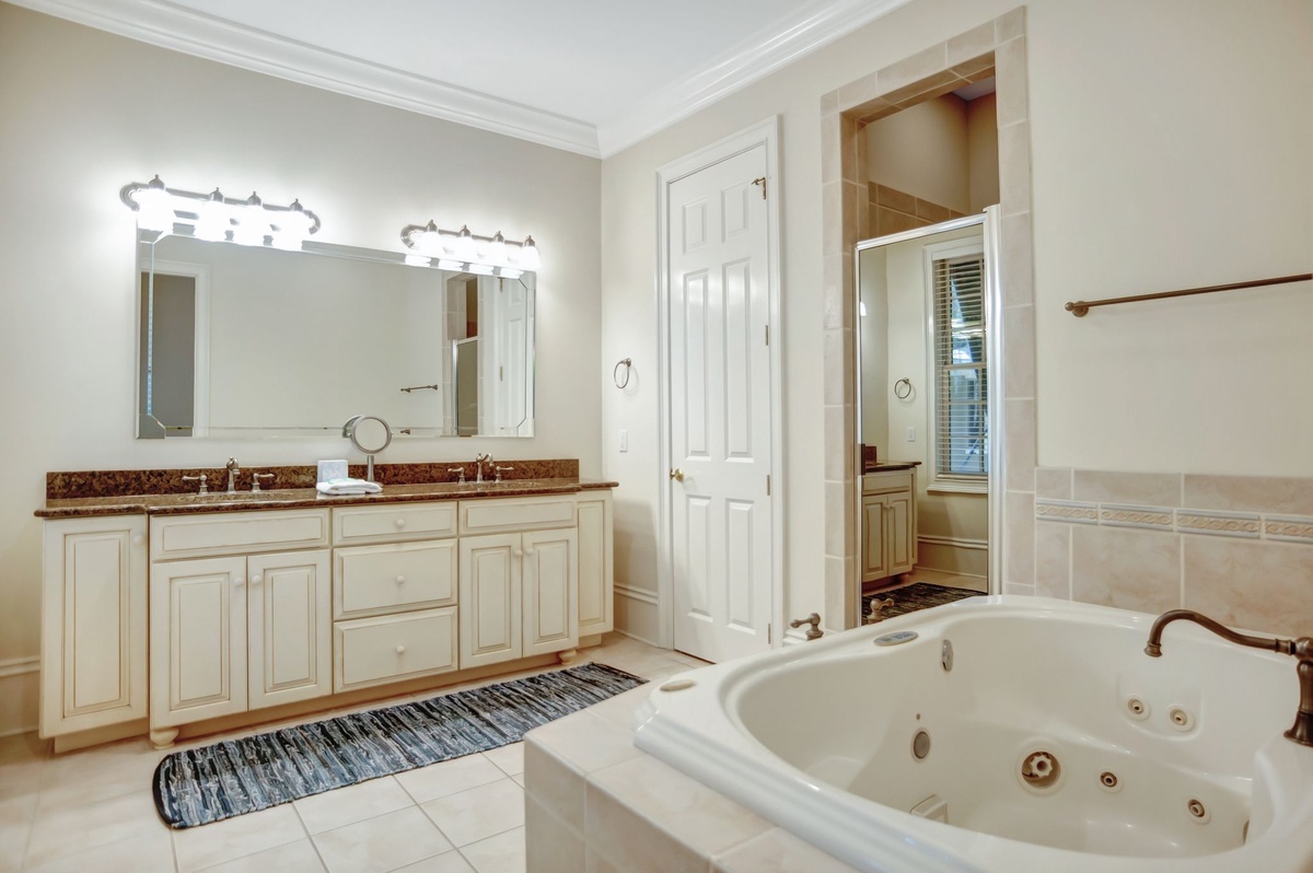 The first-floor primary suite includes a king-sized bed, flat screen TV and wide plank hardwood floors. Two cushioned chairs and a cushioned bench allow for plenty of seating in this room. Its spacious primary bath features a double granite vanity and a tile-surround glass door shower, as well as a jacuzzi tub.