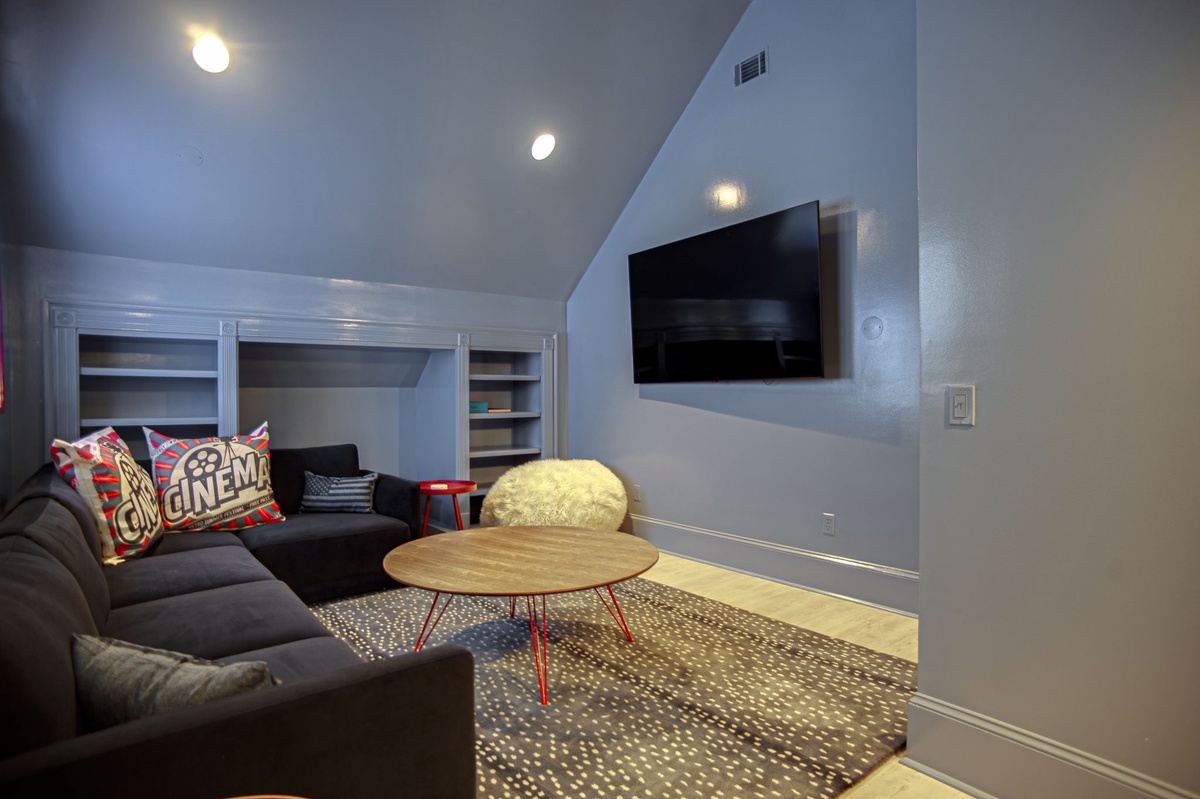 On the split-level – between the first and second floor -- is the media room. With a deep blue sectional sofa, oversized flat screen TV, mini refrigerator, and movie-quality popcorn machine, it’s the perfect gathering spot for movie-night!