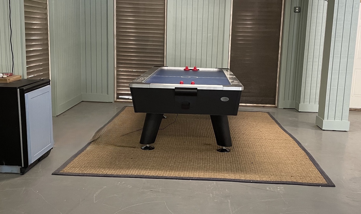The garage has a full-sized electronic foosball table with a ping pong overlay so you can choose your activity. There’s also a mini refrigerator to store beverages and snacks.