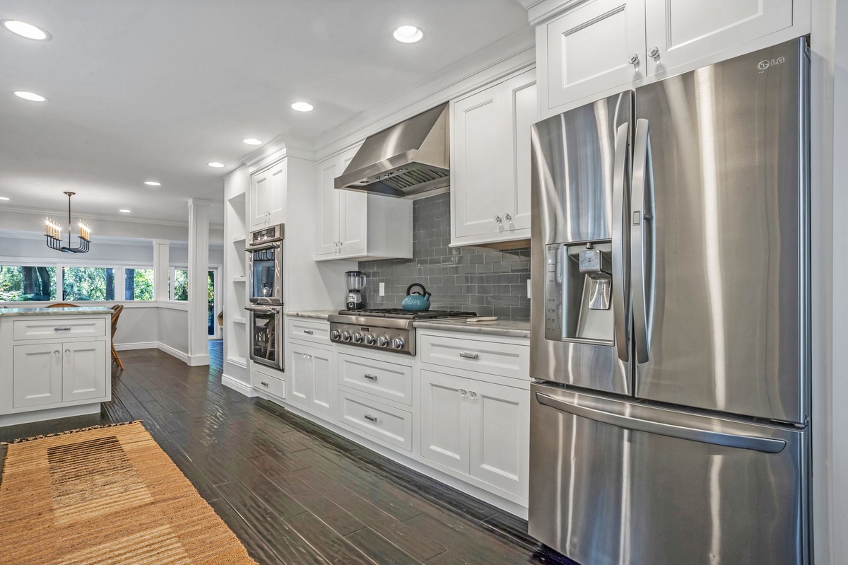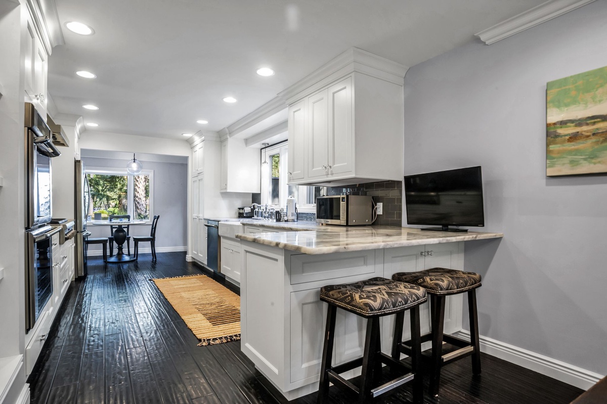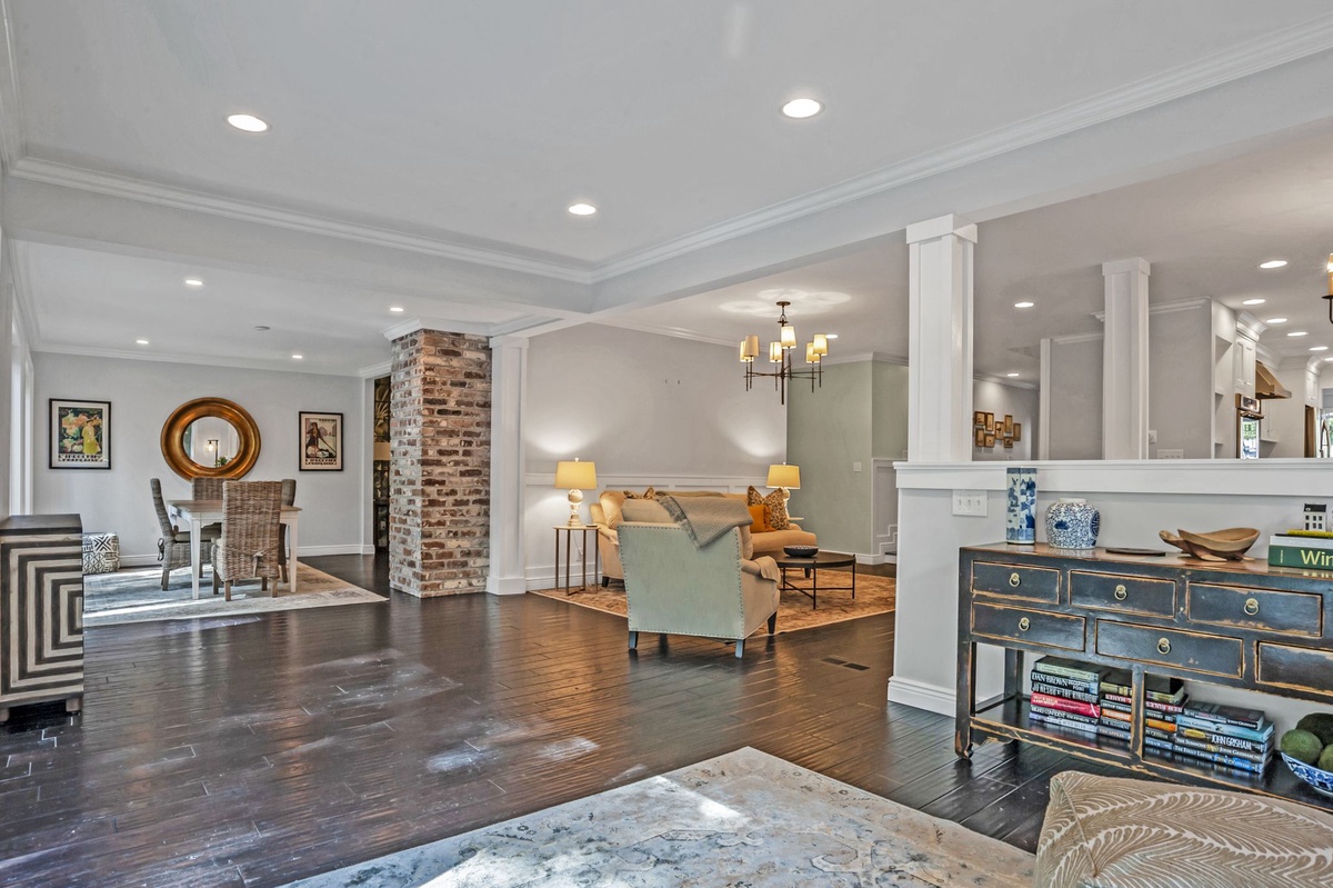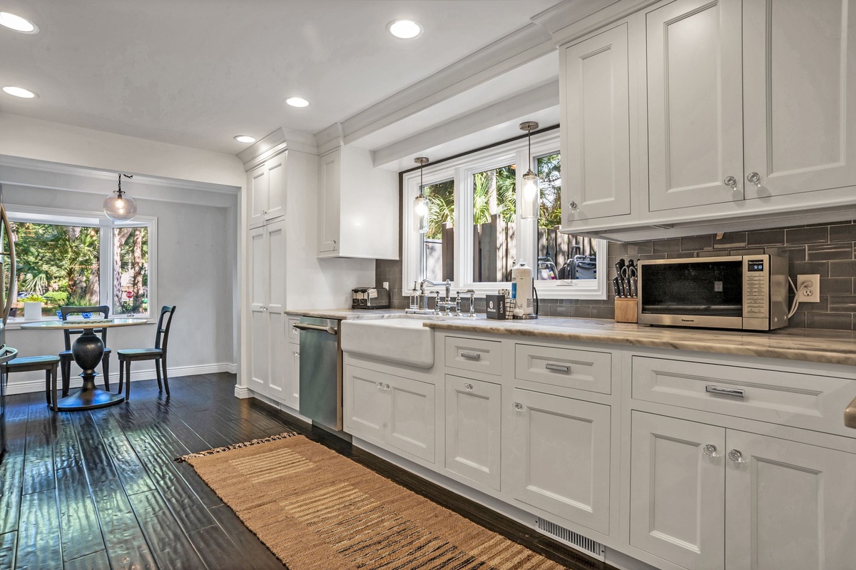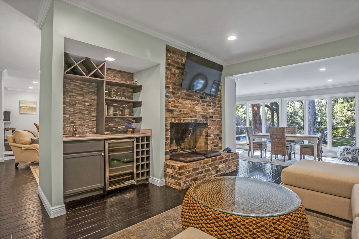 Inside, the cozy den features a wet bar and a stunning exposed brick decorative fireplace with a raised hearth—perfect for relaxing after a day at the beach. The gourmet kitchen is a chef’s dream, showcasing Carrera marble countertops, premium cabinetry, a farm sink, 6-burner gas range, tile backsplash, and elegant pendant lighting.