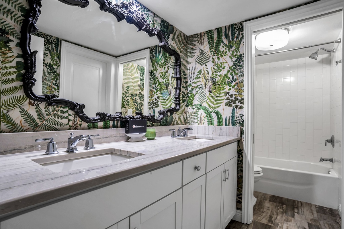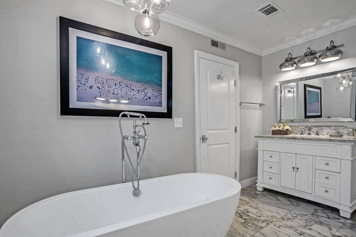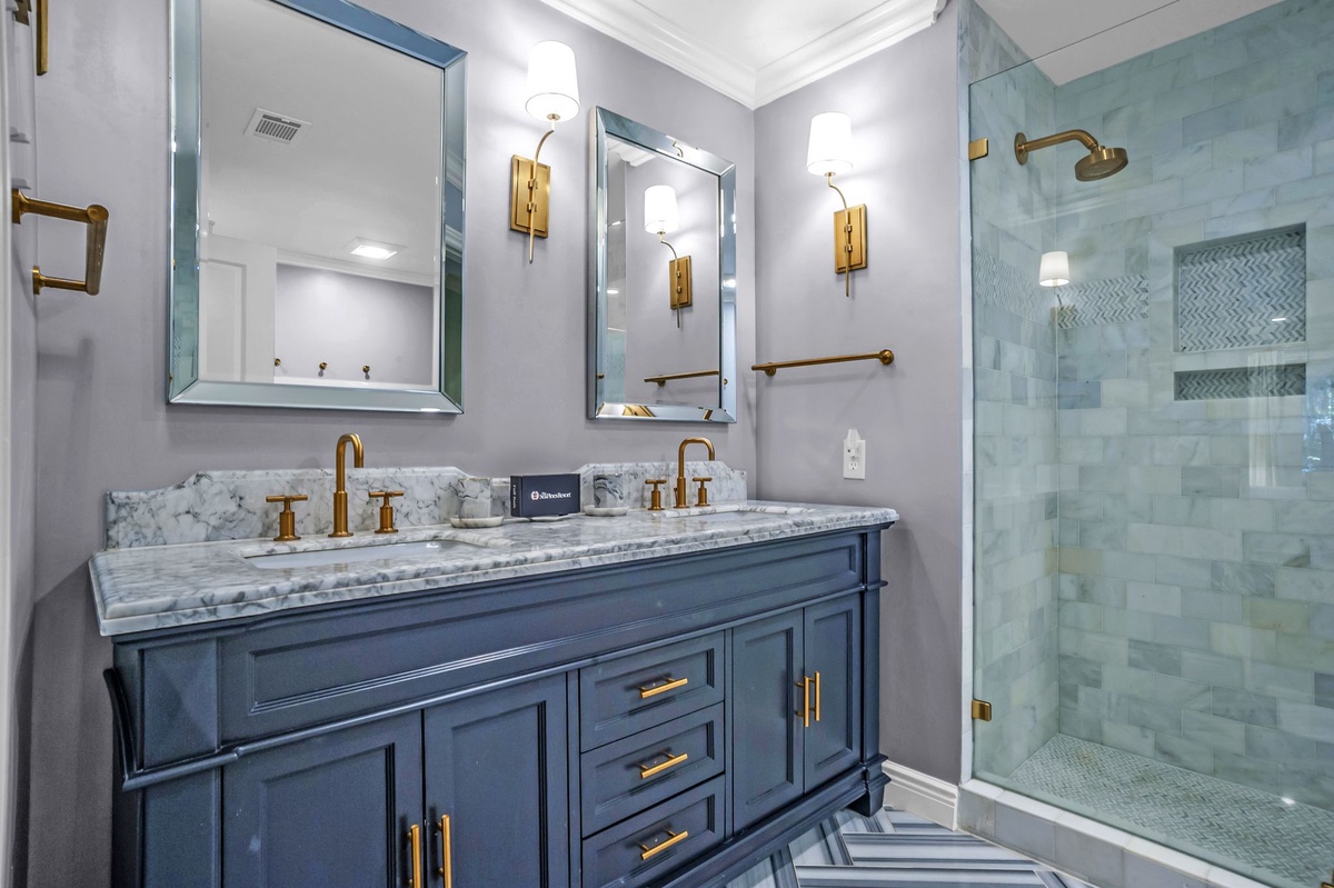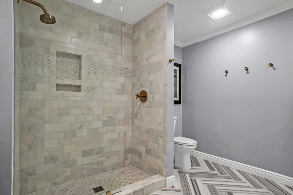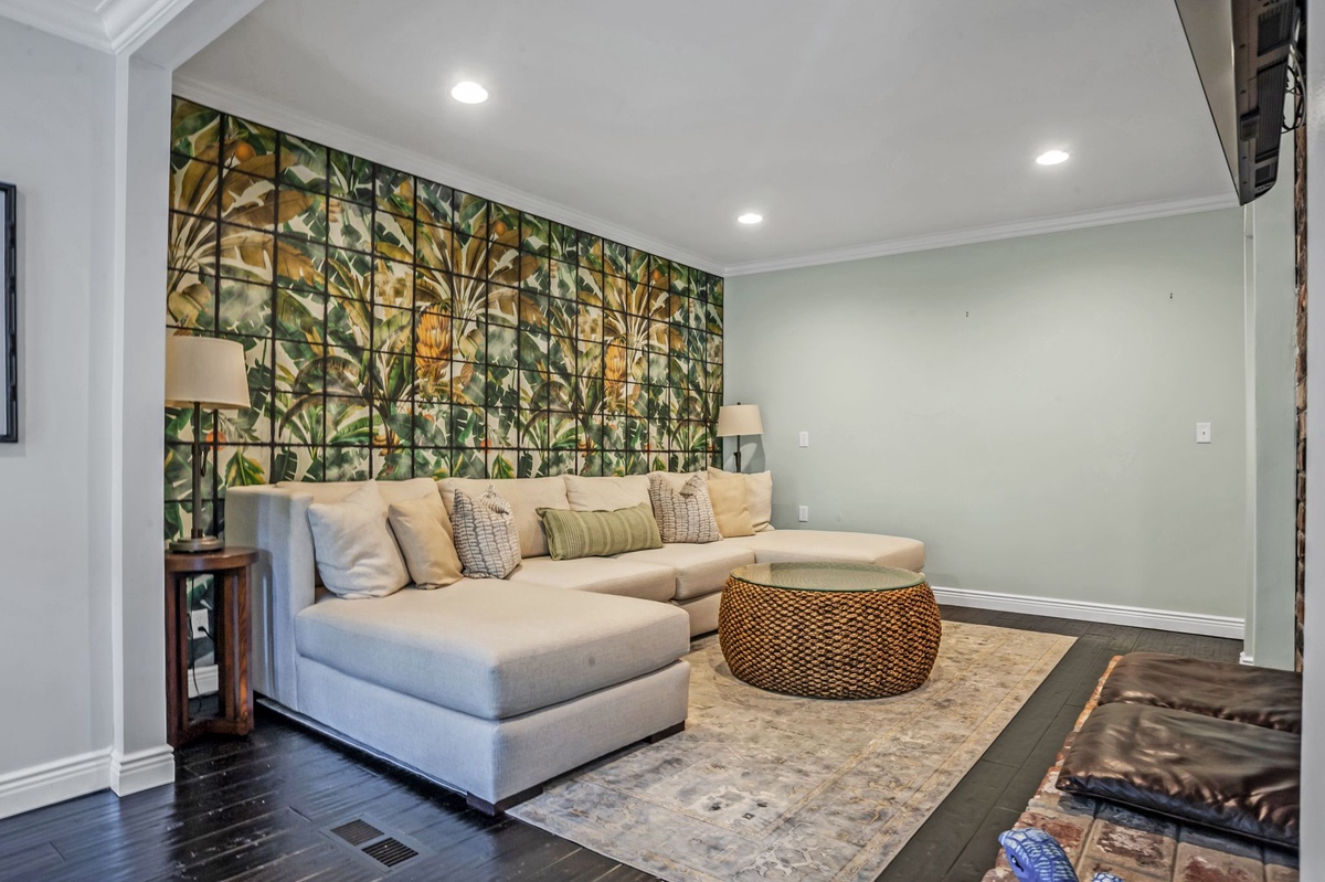 Inside, the cozy den features a wet bar and a stunning exposed brick decorative fireplace with a raised hearth—perfect for relaxing after a day at the beach. The gourmet kitchen is a chef’s dream, showcasing Carrera marble countertops, premium cabinetry, a farm sink, 6-burner gas range, tile backsplash, and elegant pendant lighting.