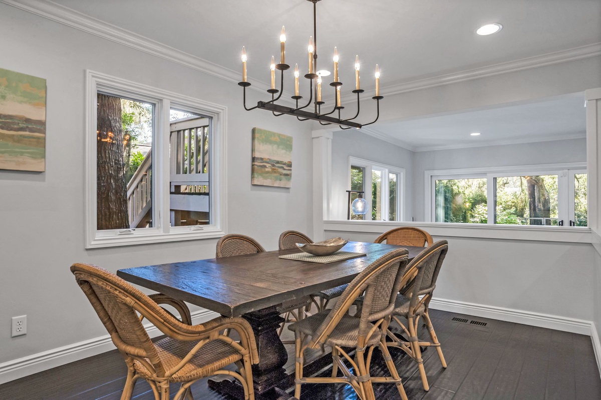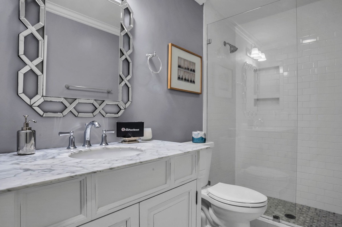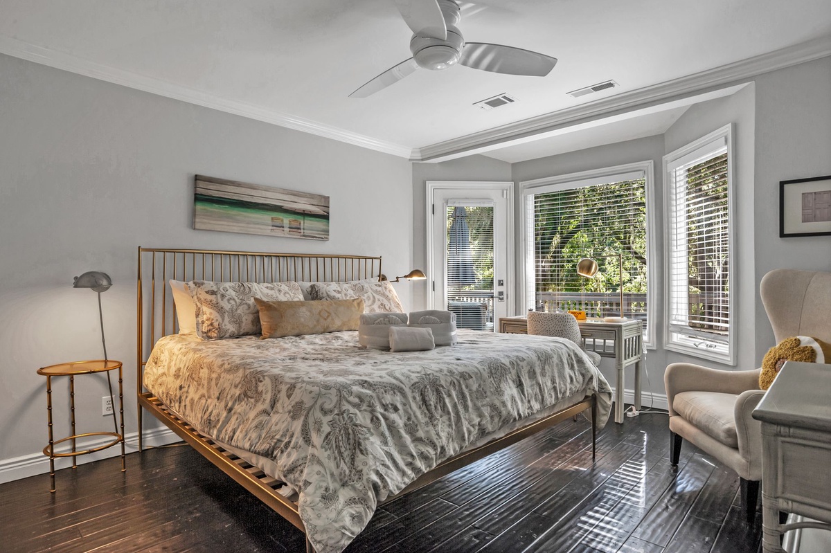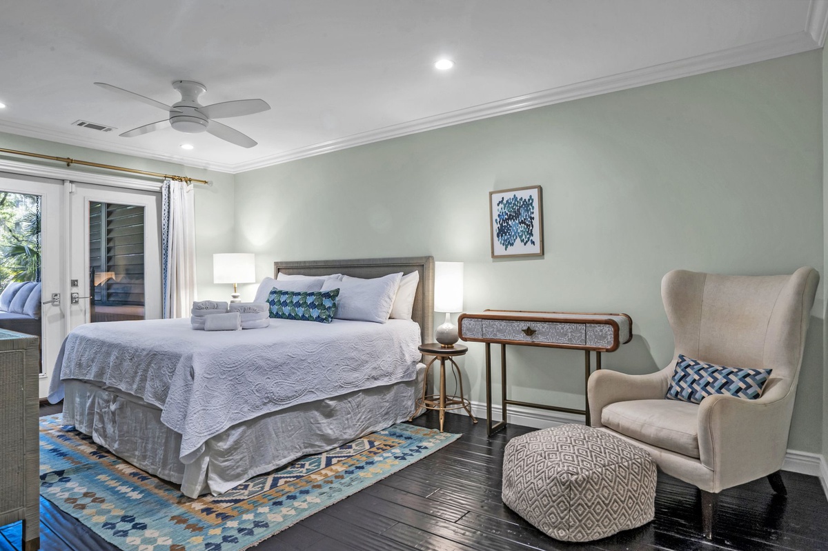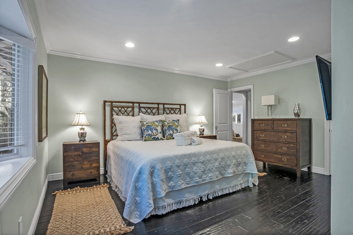 The home comfortably sleeps 8 with three king bedrooms and one queen bedroom, each thoughtfully designed for rest and relaxation.