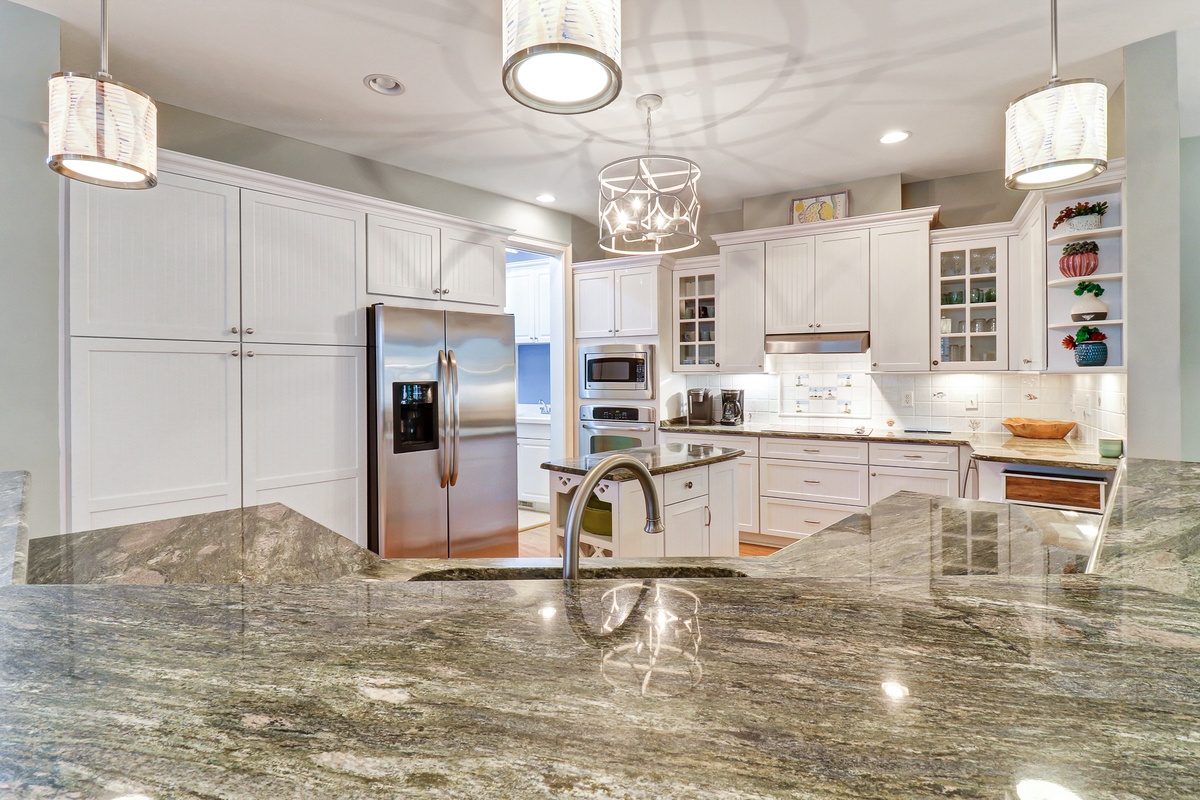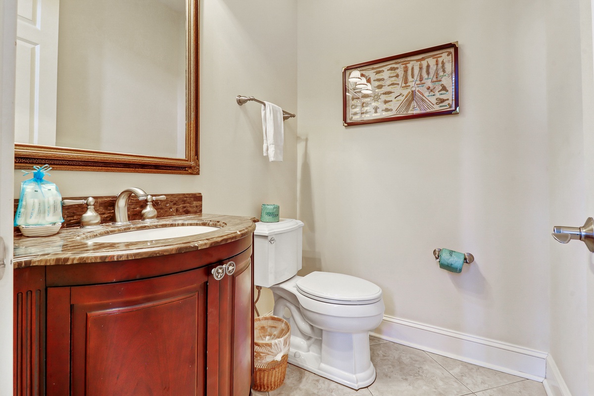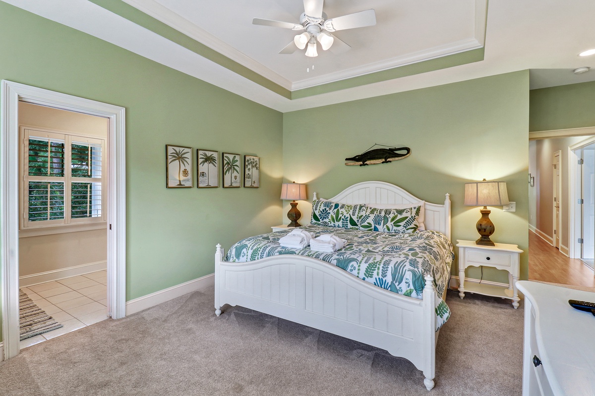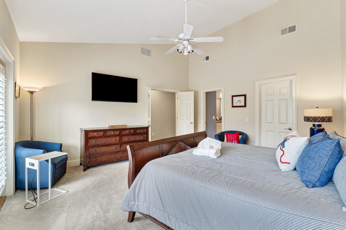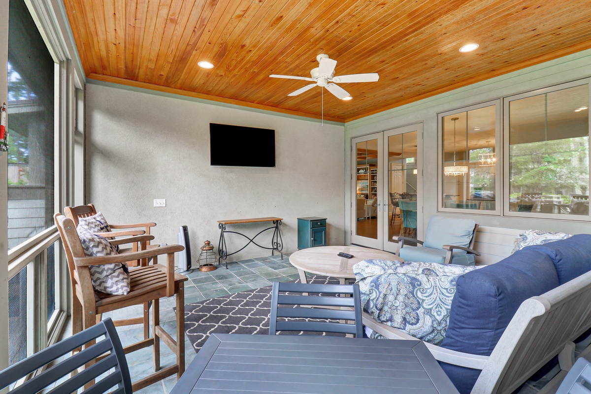 As you enter the home, you are immediately welcomed by the open living room and kitchen. There’s plenty of seating as well as a desk for working. The large flat screen TV above the decorative fireplace can be watched from either the living room or kitchen areas. The kitchen has a large wrap-around bar-height counter with seating for 6, and there’s loads of workspace and storage. All amenities are stainless steel. There is a laundry room with washer and dryer just off the kitchen. In addition to the bar seating, there’s a dining room table with seating for 8. Just beside the dining room, there’s a screened in porch with flat screen TV and plenty of comfortable seating.