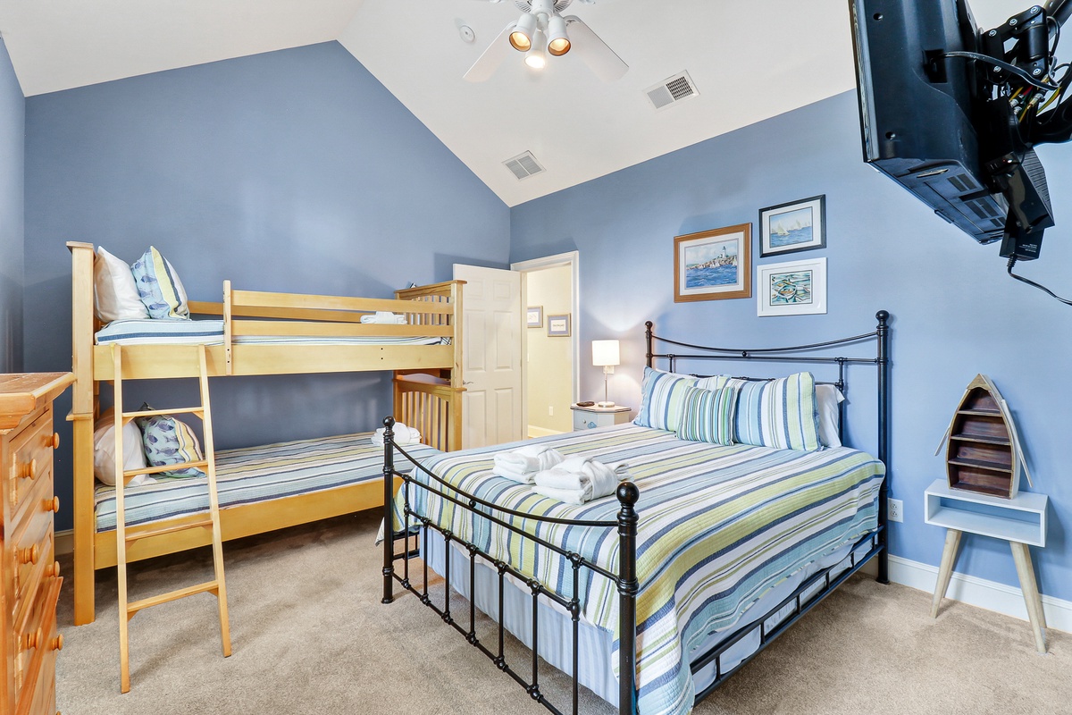 This home boasts four oversized bedrooms, each with a flat screen TV. YouTubeTV is provided for your viewing enjoyment throughout the home. Each bedroom has an ensuite bathroom. The first floor offers a king-sized bed, and there are two bedrooms upstairs, each with a king-sized bed. The fourth bedroom offers a queen-sized bed and a twin over twin bunk.