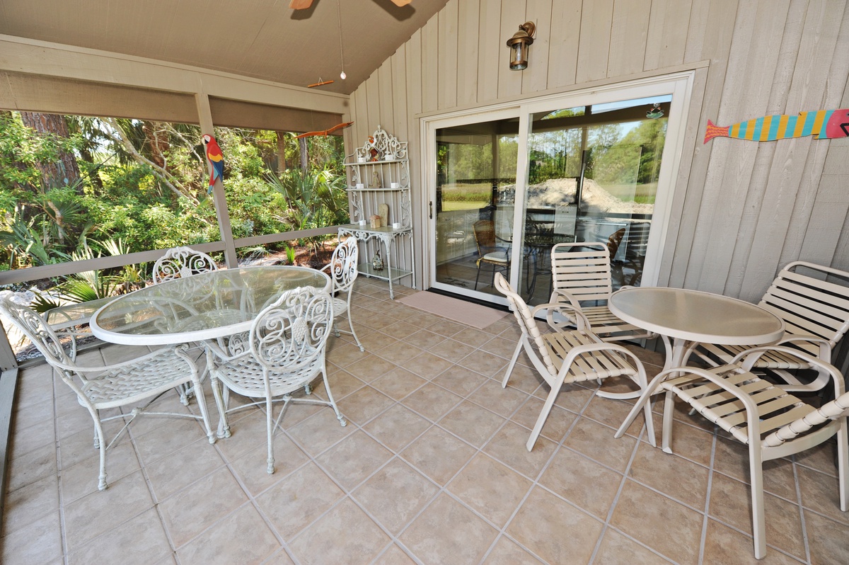 Sliding glass doors lead from the kitchen to the screened porch with two tables for outdoor dining, ideal for enjoying the relaxing pool and marsh views.