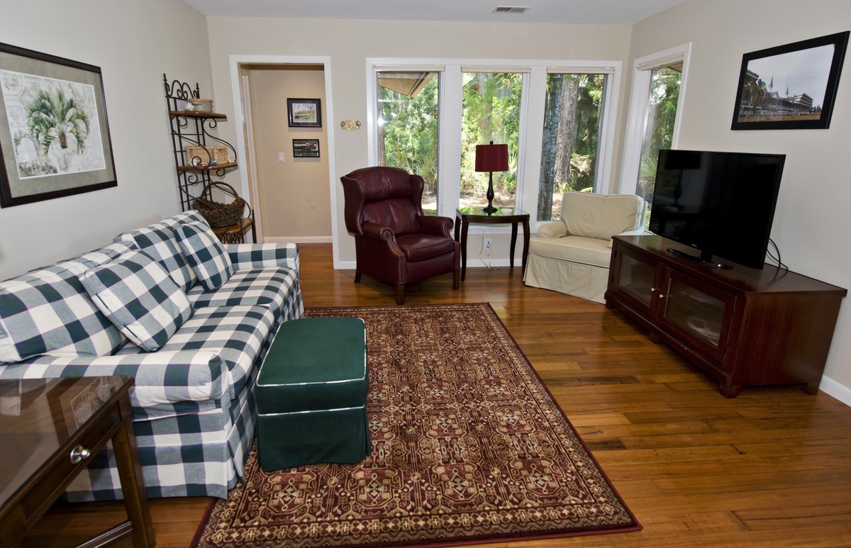 Cozy and inviting, the family room with hardwood floors offers built-in bookcases, a sleeper sofa, and a large flat screen TV with a DVD player.