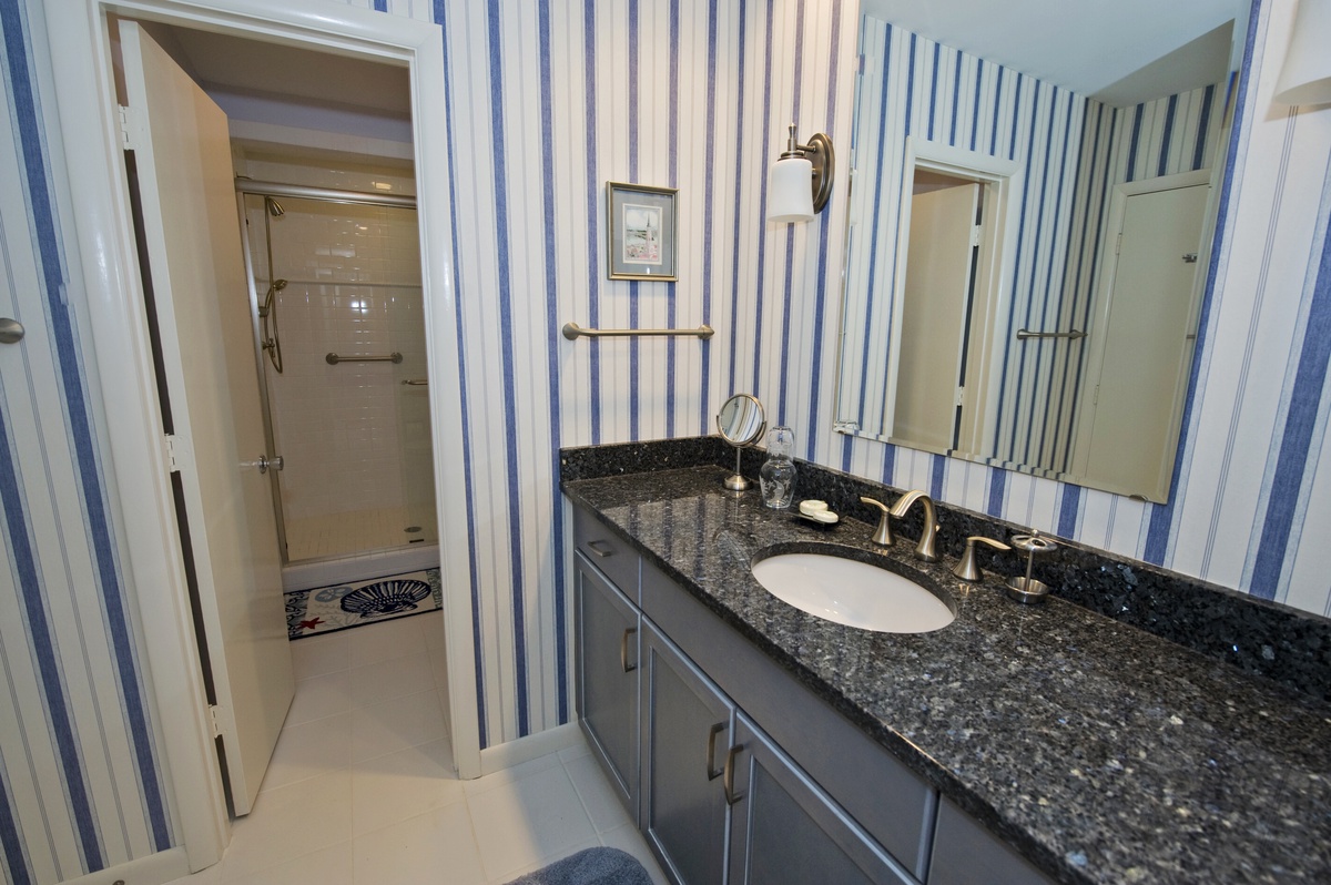In nautical blue and white, the third bedroom offers two twin beds and a flat screen TV. This room’s adjacent bathroom features a wide black granite vanity and a spacious glass door dual-head shower.