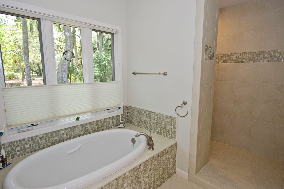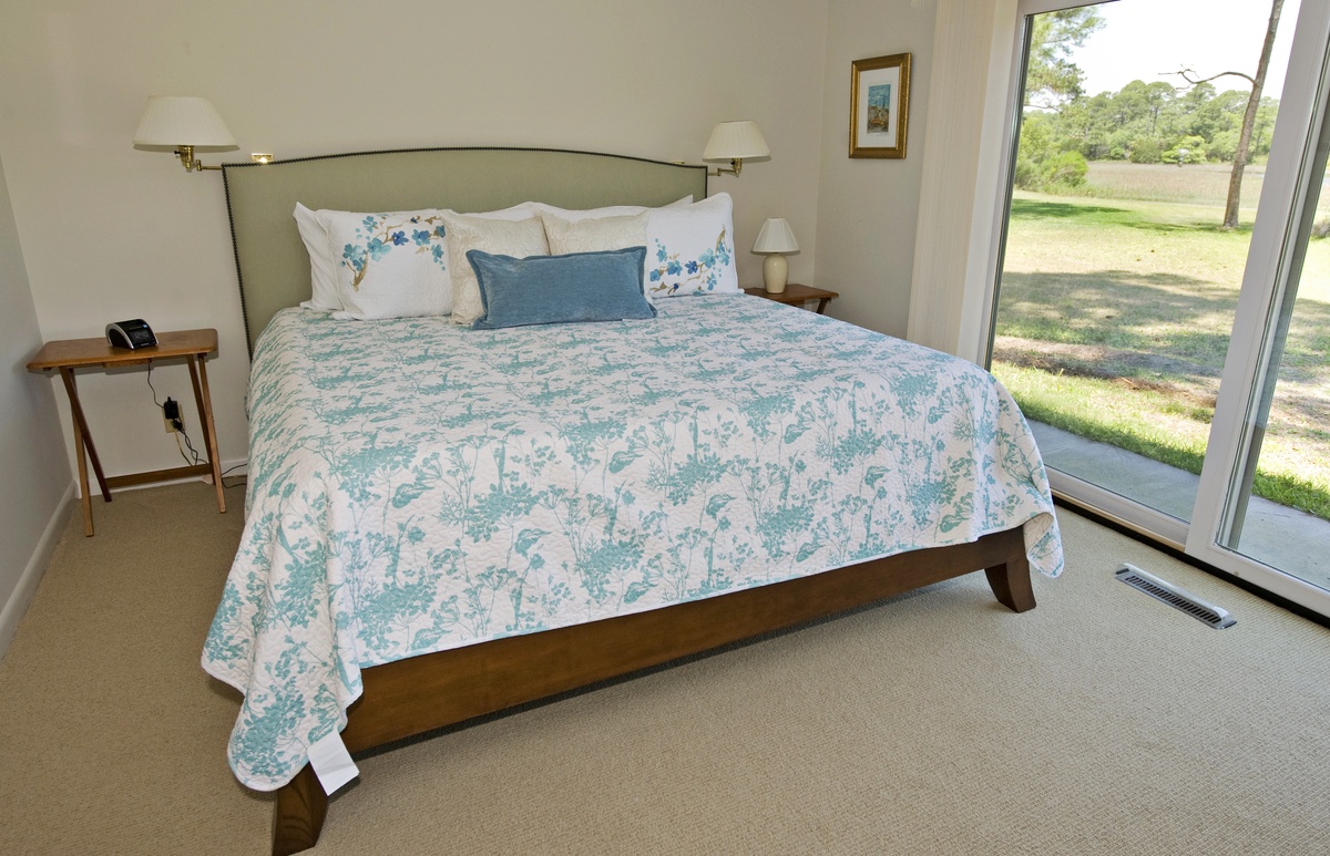 A wonderful feature of this home is that there are two master bedrooms. The first master, in pale seafoam green, features a king-sized four-poster bed, attractive cherry furniture, a flat screen TV, and a large window viewing the stunning marsh. This room’s bath offers a tan marbled-granite vanity, mosaic tiled stretch-and-soak bathtub, and a separate walk-in shower.