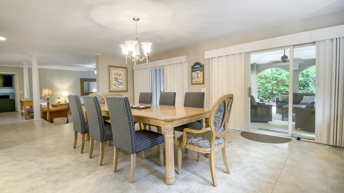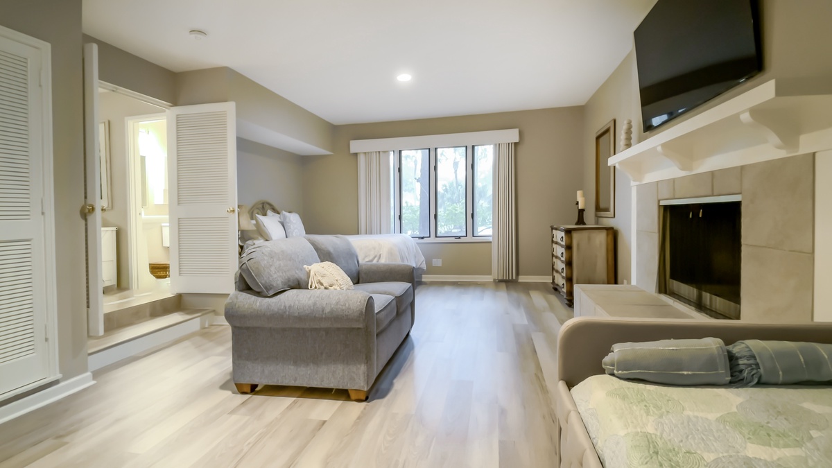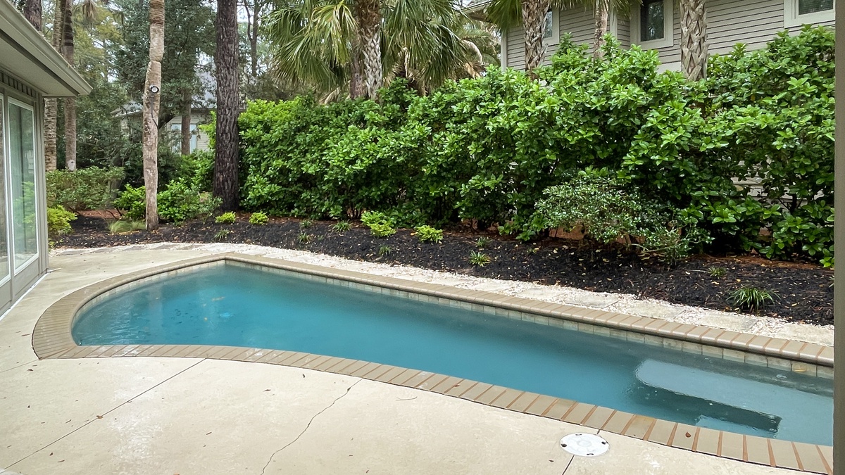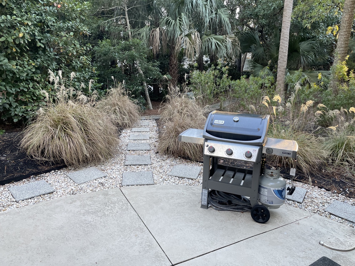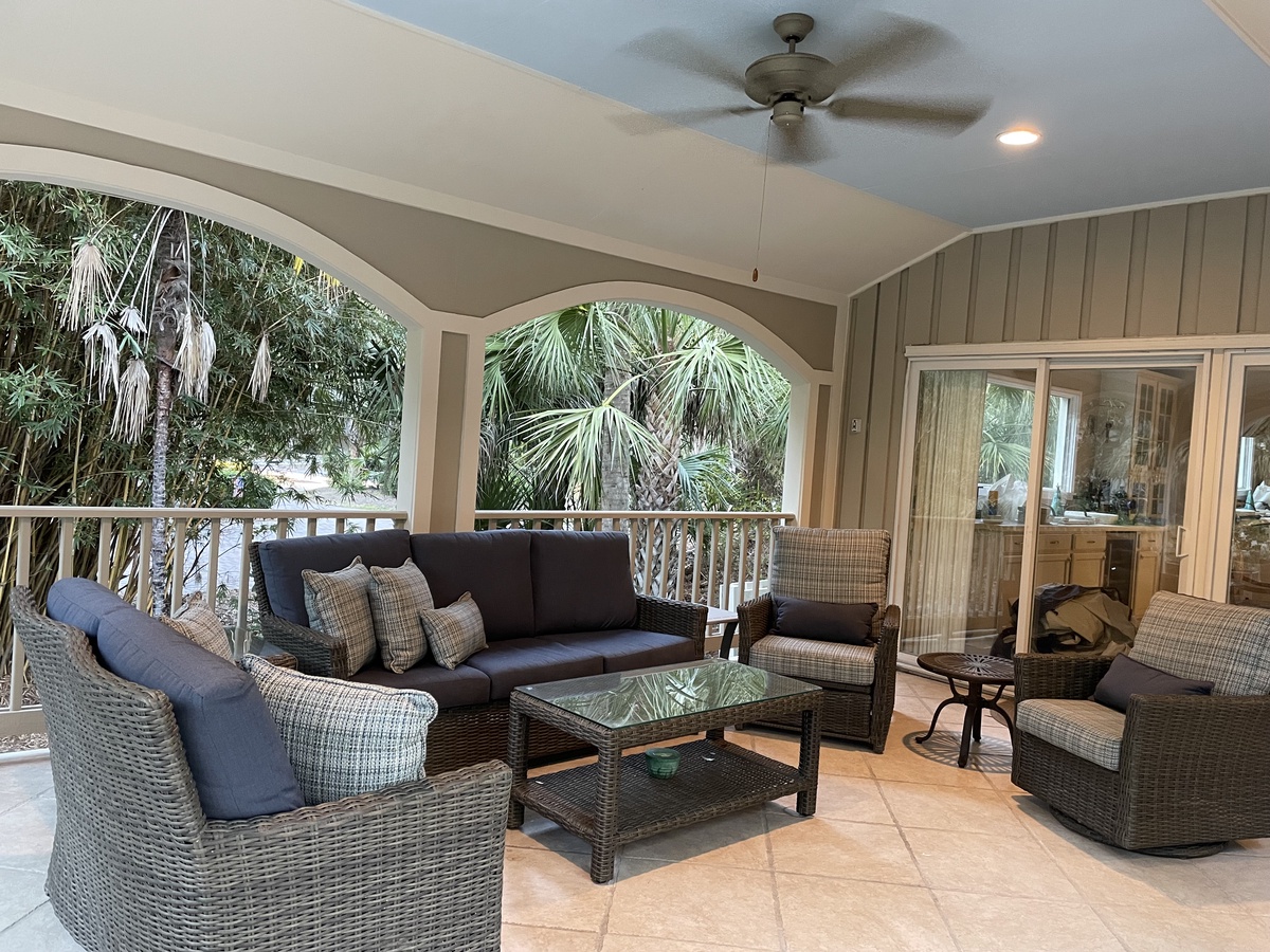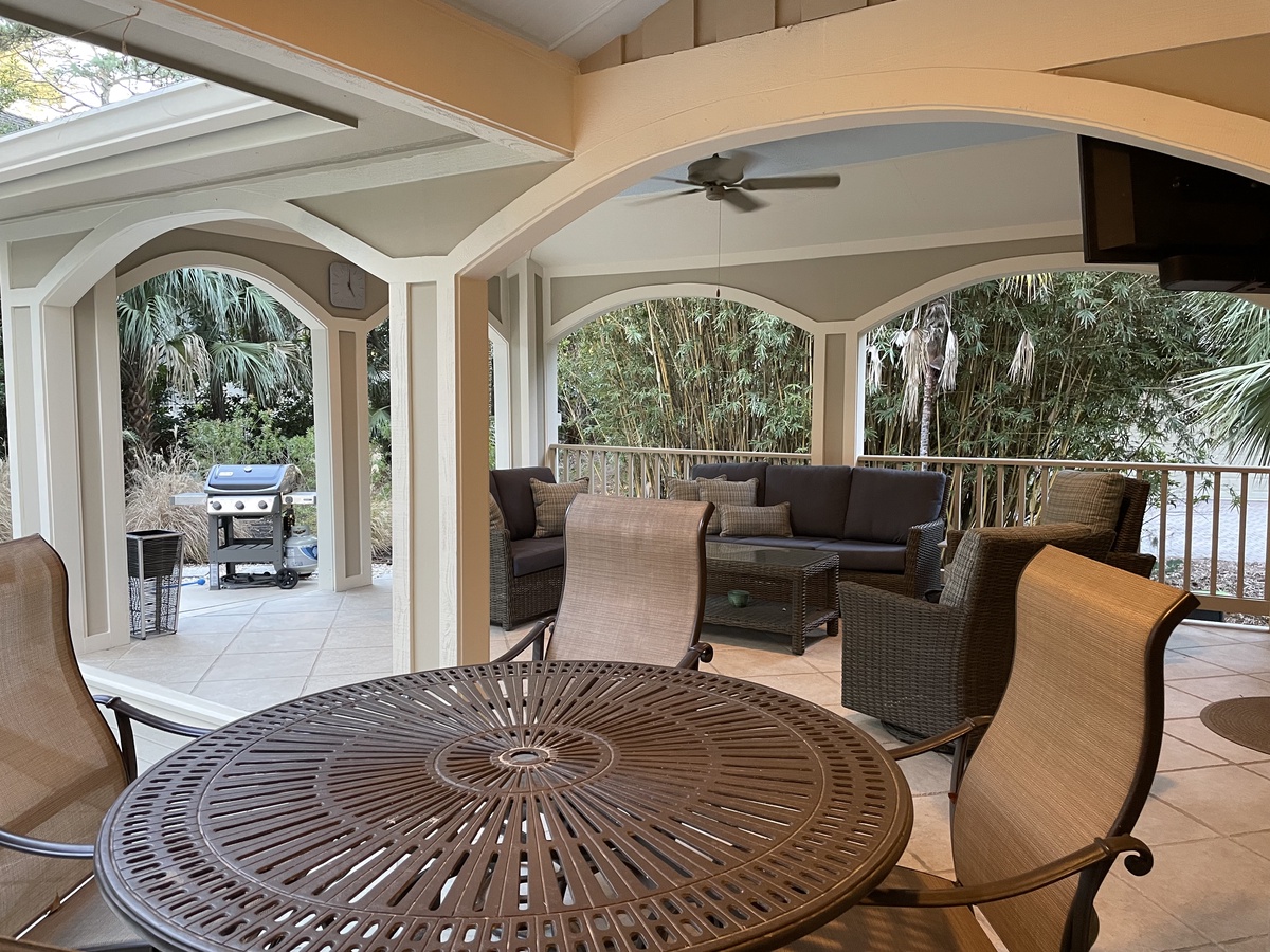 But in a place like Hilton Head Island, it can be hard to keep the party indoors. Simply open wide the sliding walls of glass that line the main living space and enjoy al fresco amazement in the lush backyard oasis. Splash in the waters of the wide swimming pool, ringed by greenery for privacy. Fire up the gas grill for all-day barbecues that last until nightfall, enjoyed on the wide covered patio with TV.