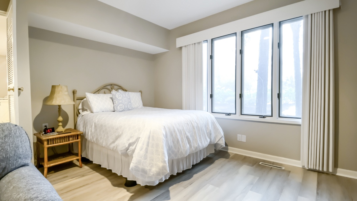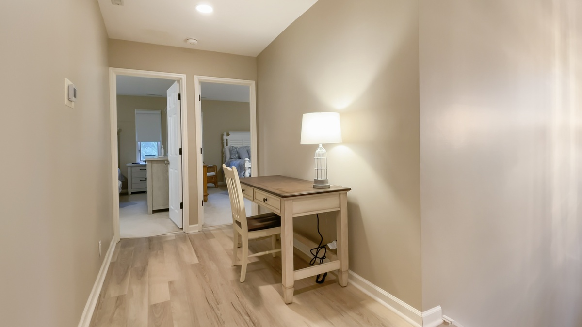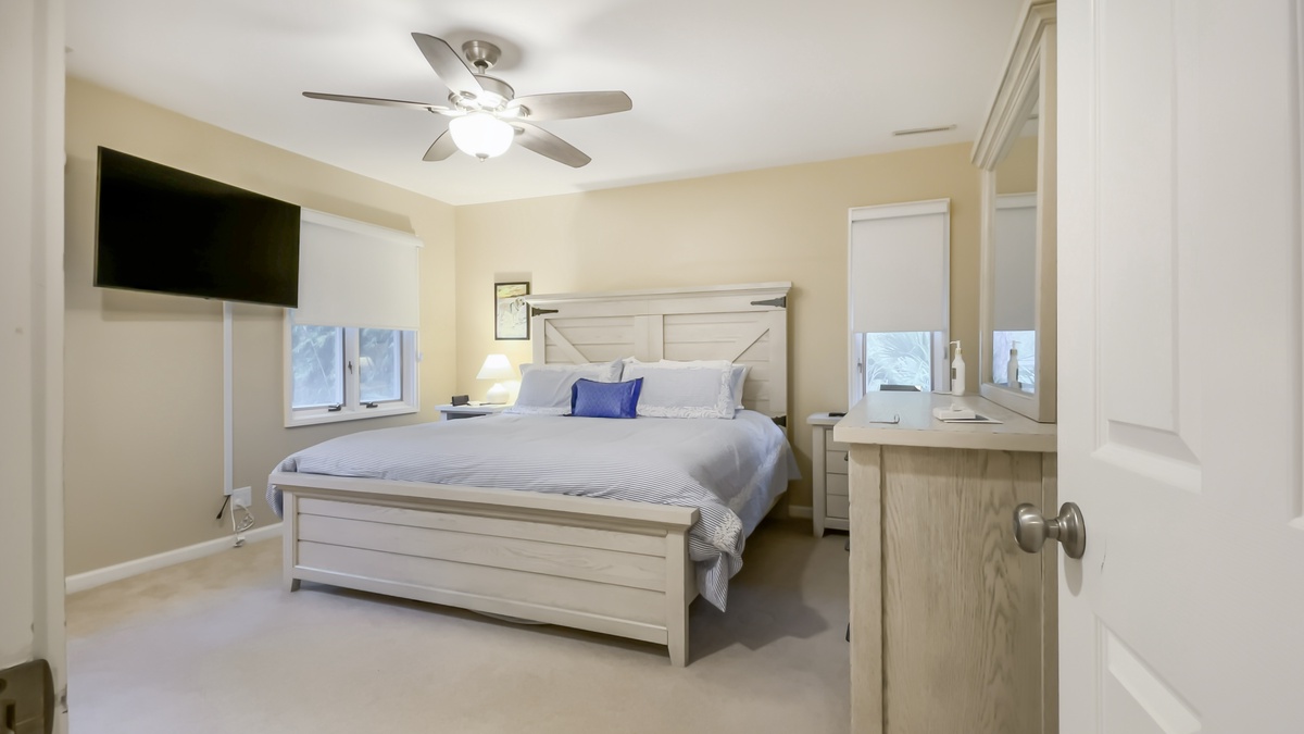 Set around a landing with private upstairs laundry and office space, each suite carries a theme of coastal relaxation. A pair of queen suites each enjoy their own flat-screen TV, plentiful windows and en suite bath with tub and shower. Finally, the elegant owners suite sets a king-size bed amid spacious closets, lush natural light and flat-screen TV, with en suite bath offering an expansive walk-in shower.