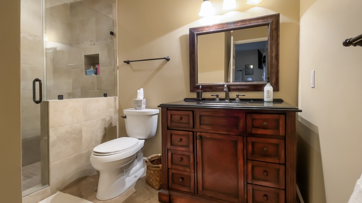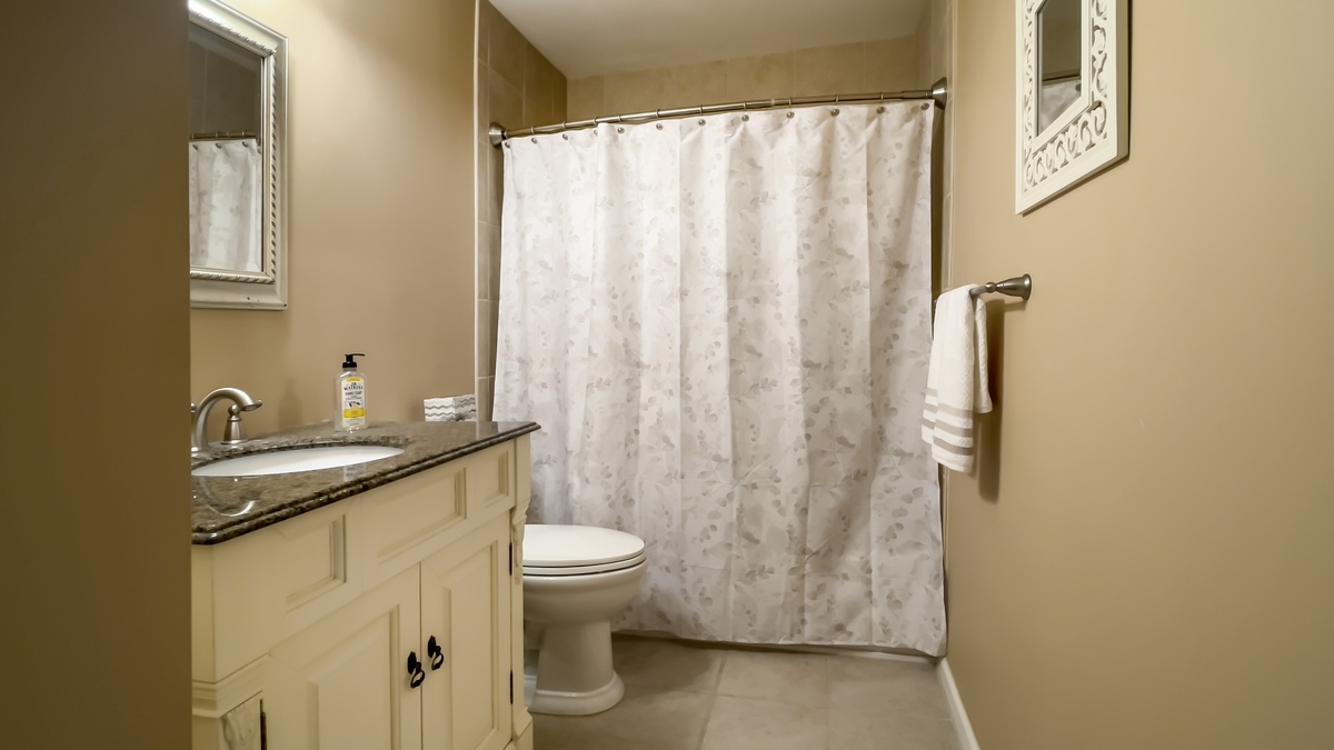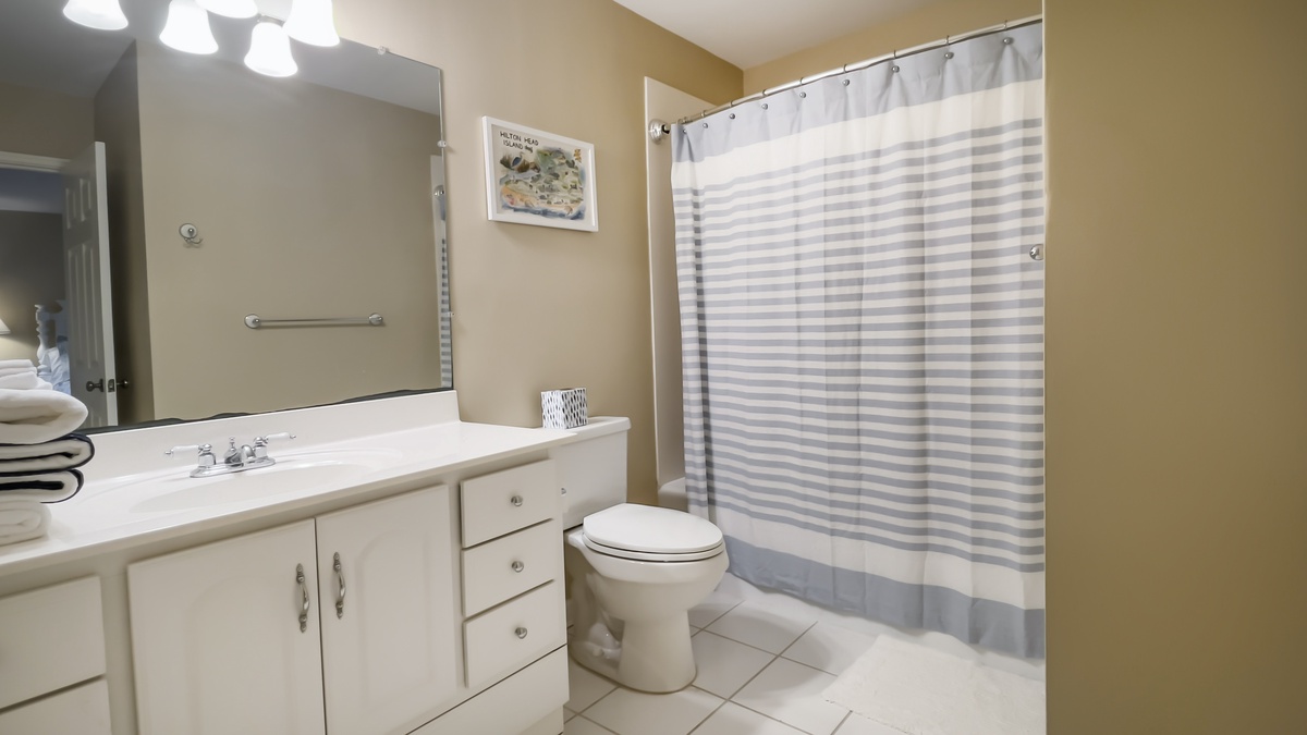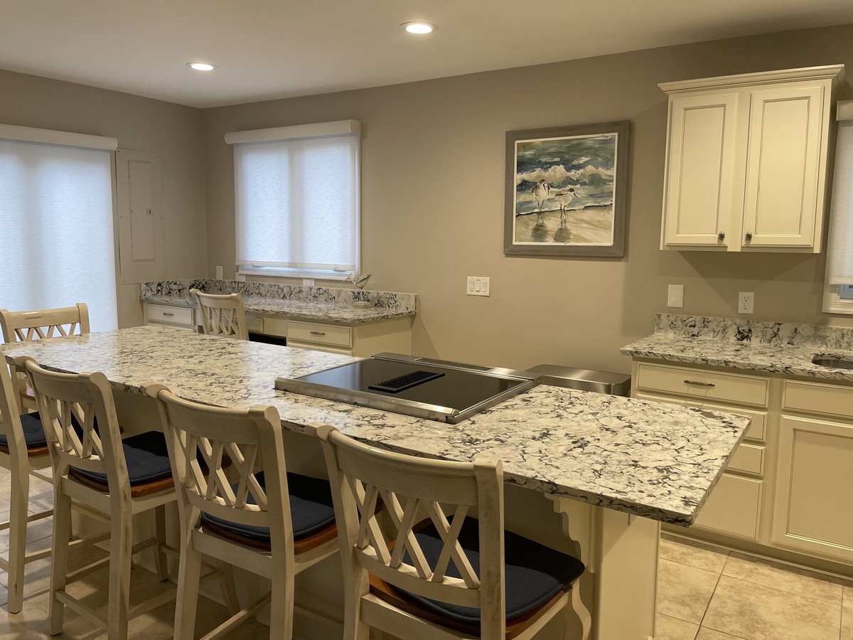 The guest rooms offer a variety of atmospheres to suit any visitor. A downstairs space is idea for families, with queen bed, twin with trundle bed, decorative fireplace and convenient full bath with tub and shower. The remaining rooms, all suites, can be found up the floating staircase which offers plenty of storage for beach chairs and golf clubs.