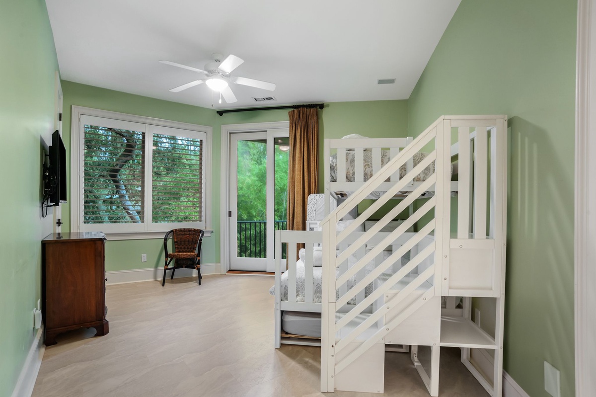 Two more bedrooms are on the second floor, one with a subtle jungle motif in pale blues featuring bunk bed (twin over double with trundle), a TV/DVD combo and private bath and balcony. Another bedroom upstairs has India-inspired bedding, with two double beds, a TV and DVD plus private bath.