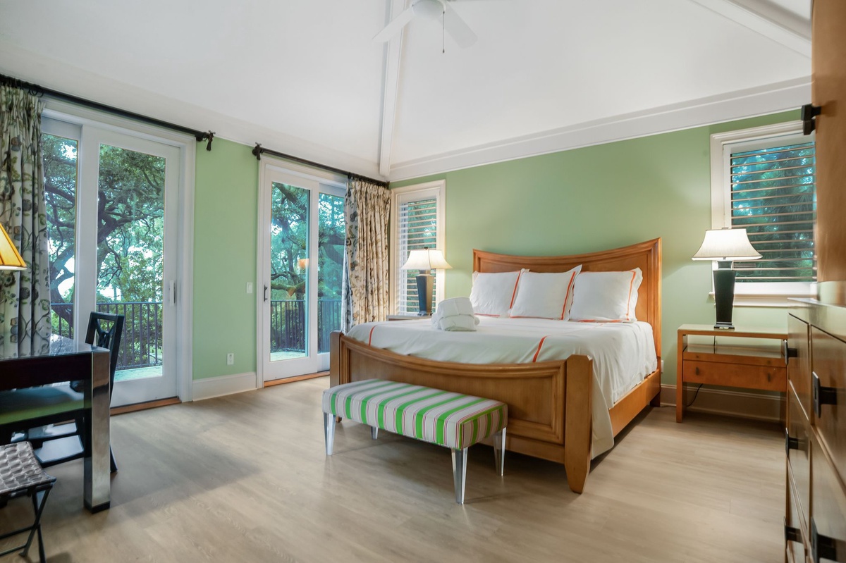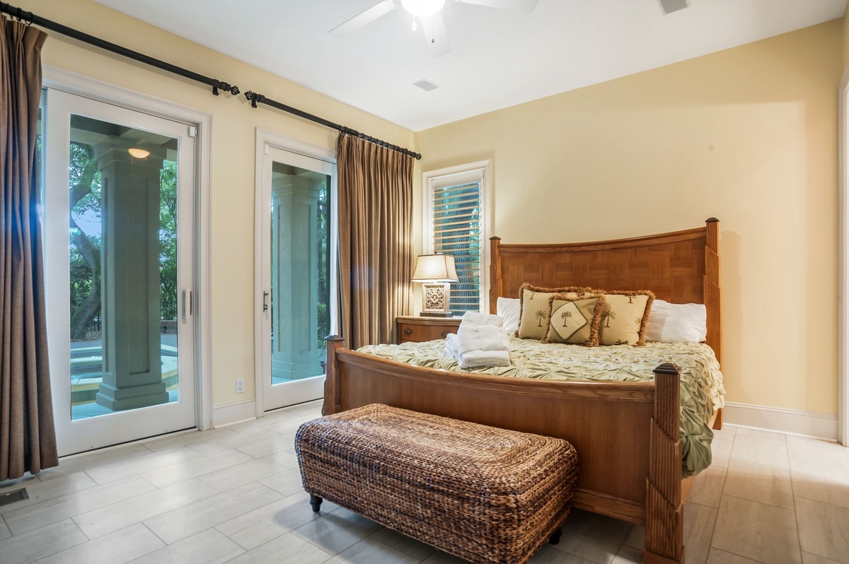 There are two bedrooms downstairs, one room, which is decorated in palm-colored greens and browns, has a king-sized bed, TV and DVD. There is a private bath adjacent to this bedroom, as is access to the back deck and pool. The other downstairs bedroom is architecturally dramatic with a curved wall of windows covered in plantation shutters, as the room’s entry. Also with a king-sized bed, a TV/DVD combo, generous walk in closet, and batik-inspired bedding, this bedroom could be considered a downstairs master.