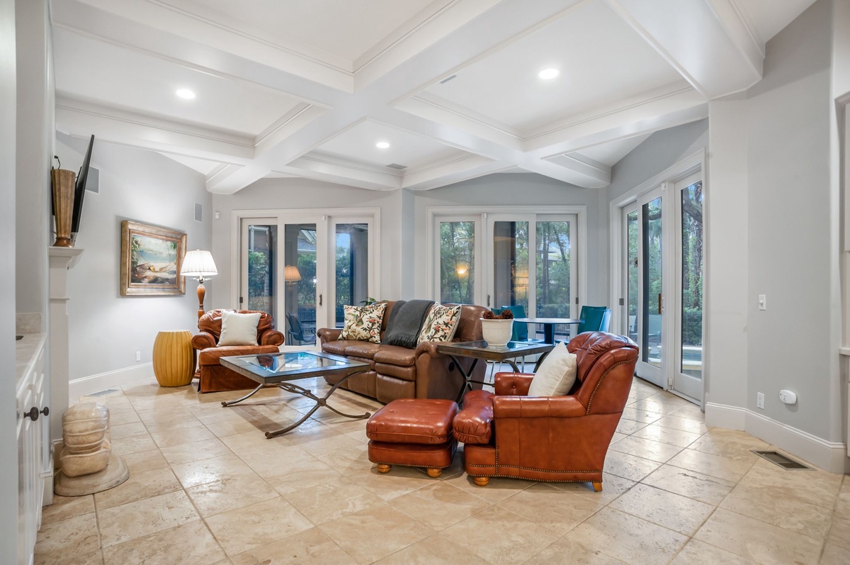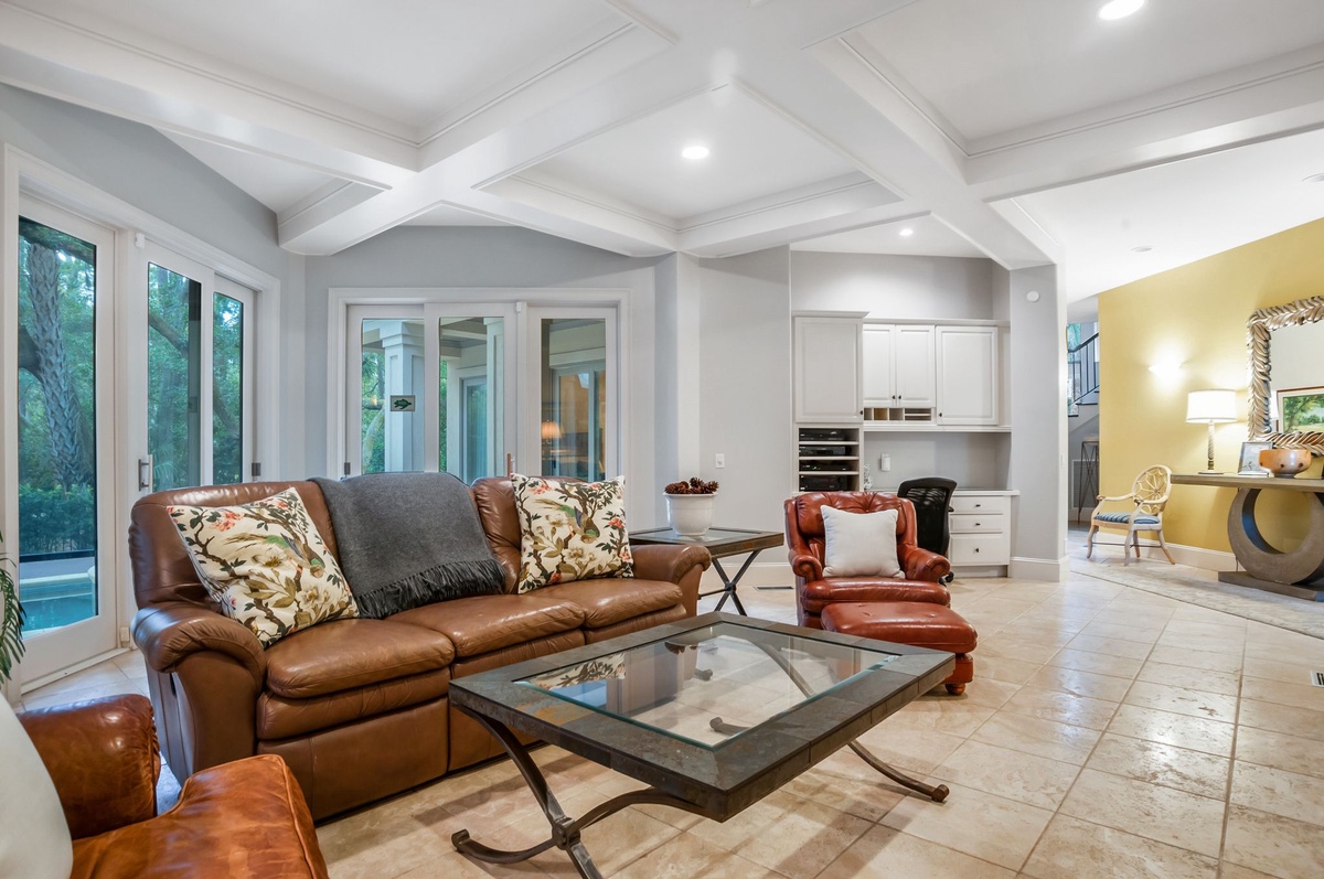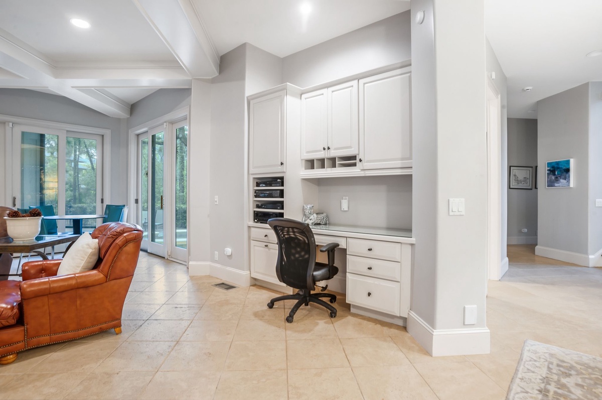 You’ll arrive at this 2nd row house and never want to leave. From the moment you open the front door, you are welcomed in hushed tones of beige, cream and warm tans, with island accents. Travertine flooring leads into the family room with flat screen TV, DVD, wetbar with mini-fridge . The family room, which has an office nook with internet access, is level with the pristine pool and deck, and has covered seating for shaded outdoor dining.