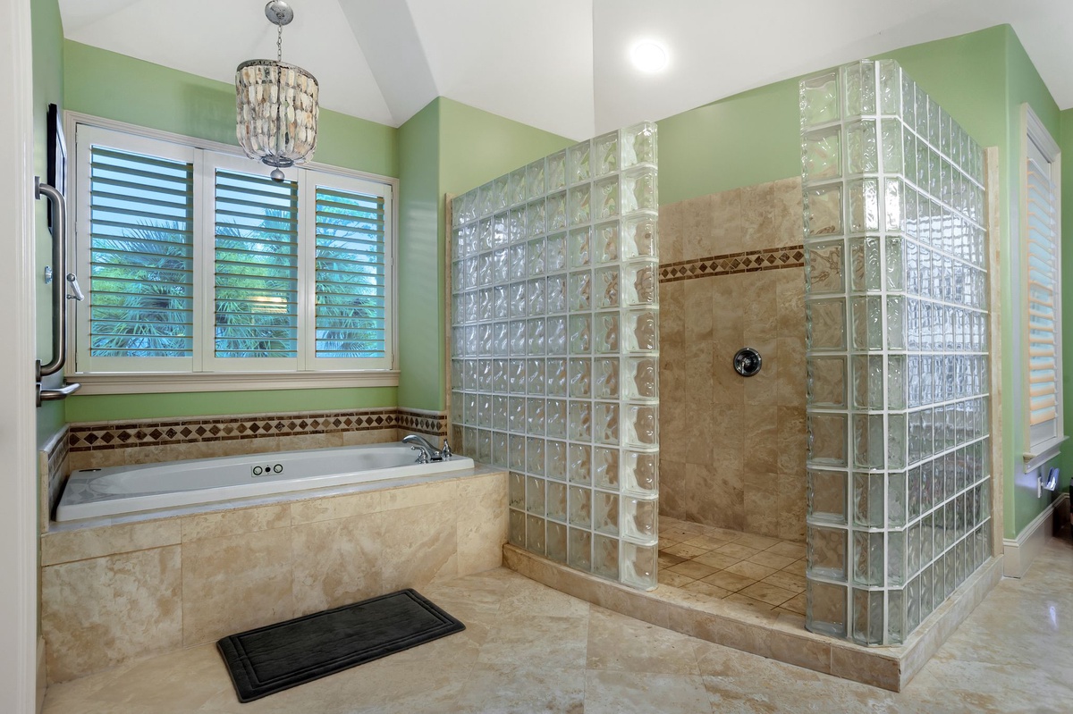 The master bedroom, also upstairs, has a king-sized bed, a TV, DVD, plantation shutters, a ceiling fan, a private oceanside balcony, a generous walk-in closet and an impressive master bath in both size and scope, showcasing massive glass block shower, a separate tub, saturnia flooring and granite double vanity.
