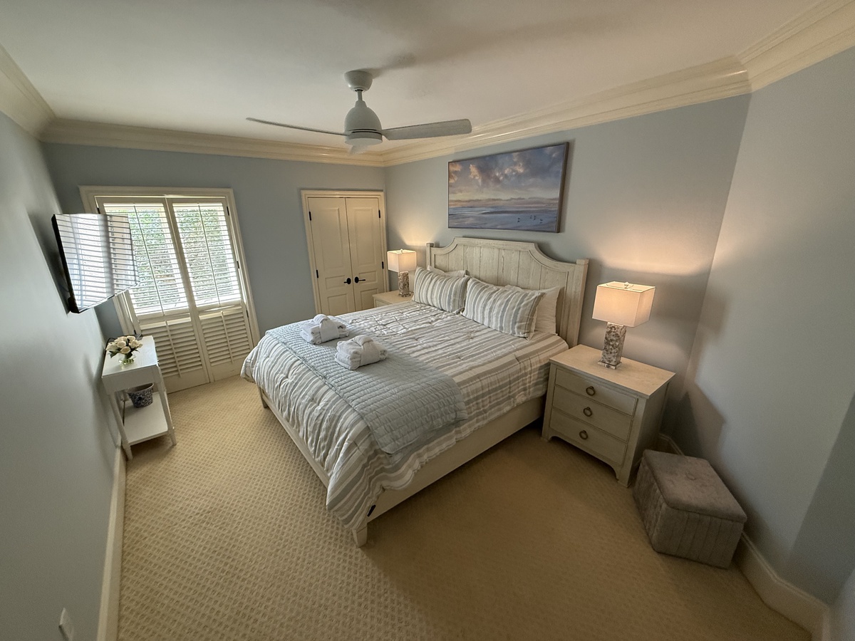 In elegant blues and beiges, the second bedroom features a king-sized bed, ceiling fan, TV plus its own bathroom in blue and white toile with a stone shower.