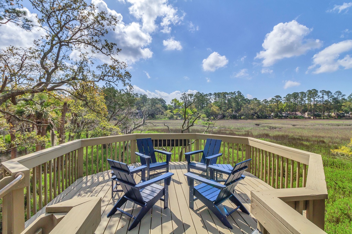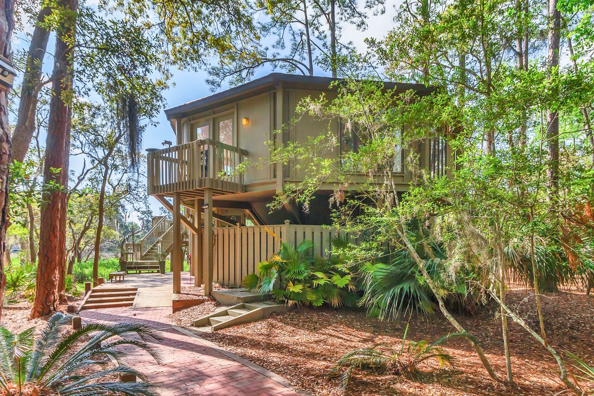 Set among the treetops with a layout that captures a jaw-dropping panoramic view across the marshes, this Deer Island villa offers a vacation experience like no other. Part of an enclave of uniquely geometric villas in a private island just a short walk from Harbour Town, this property adds to the blissful sense of place with updated finishes and furnishings.