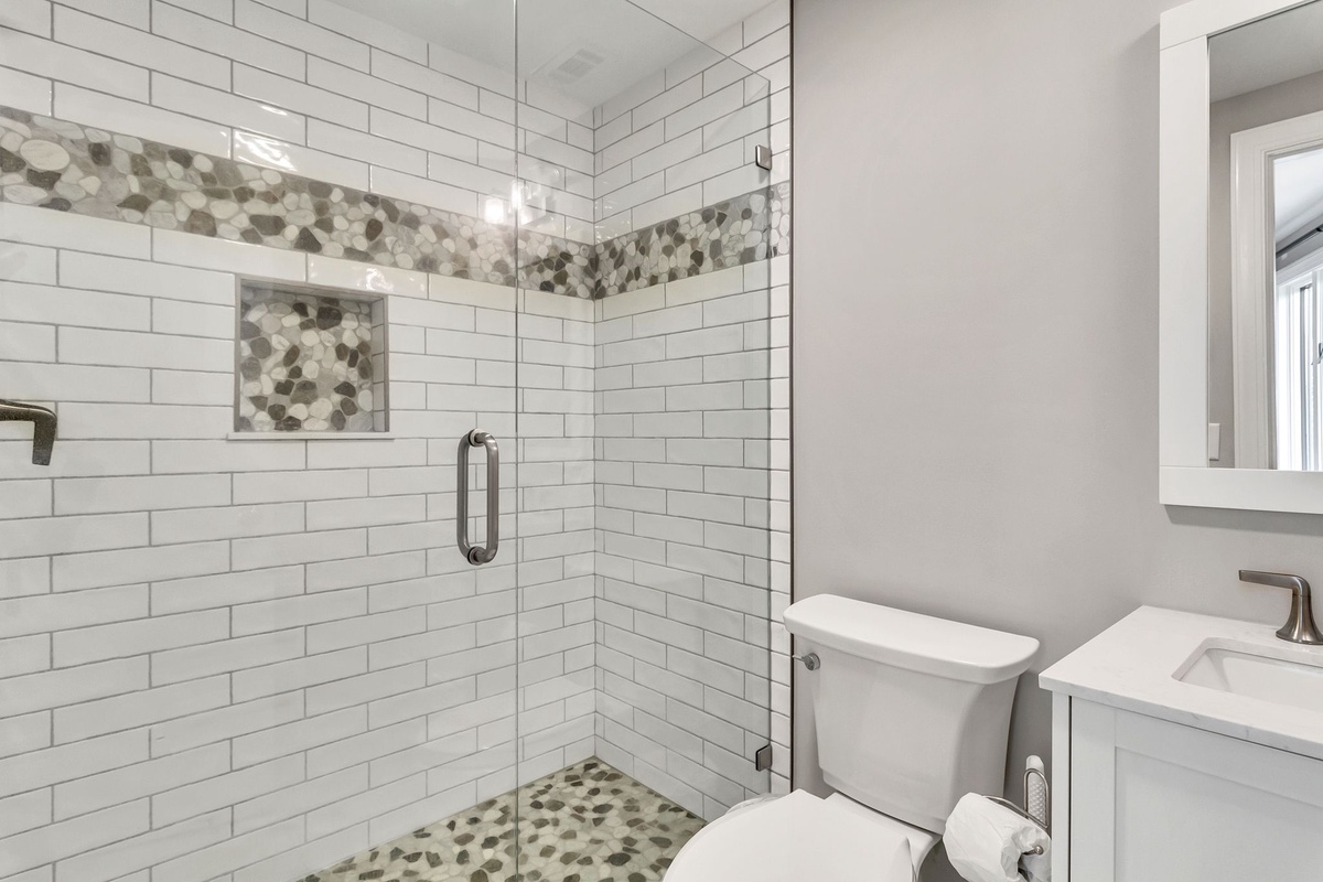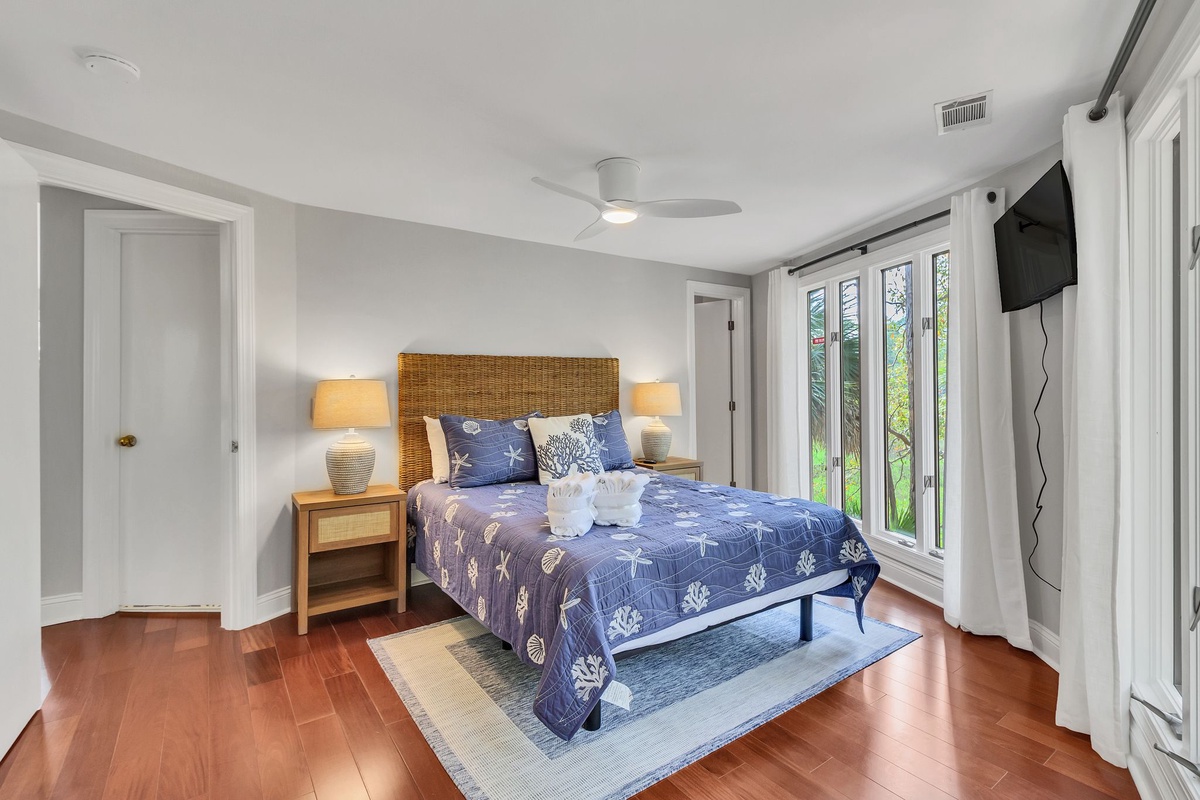 A pair of roomy suites carry this elevated atmosphere of wraparound views. Each boasts a queen-size bed, flat-screen TV, lush wooded views, plentiful built-ins and private baths with wonderfully updated walk-in showers.