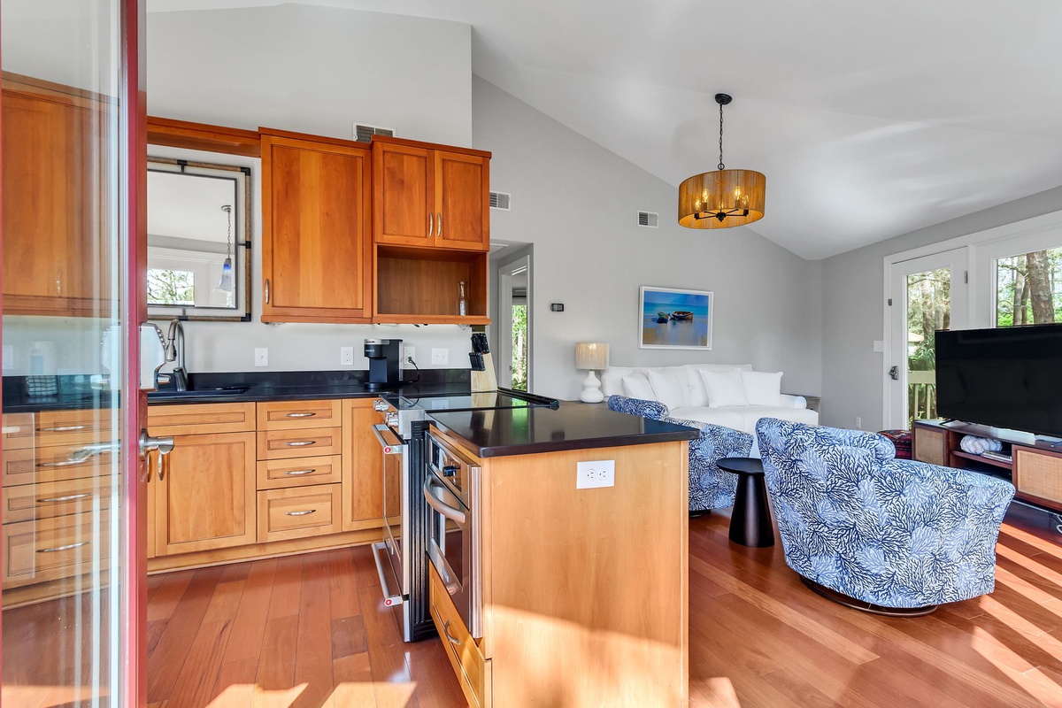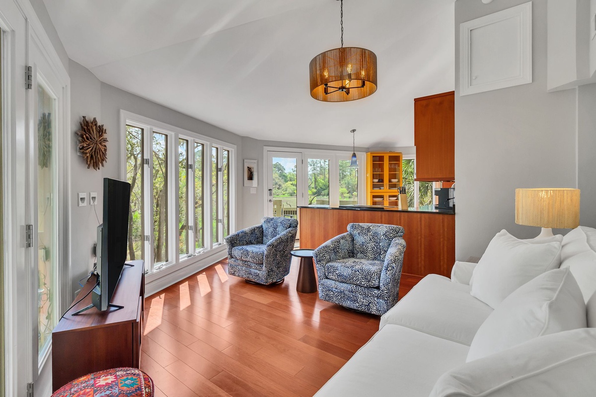 Letting you gaze out on the fields of Spartina grass from every spot, the wraparound open living space stretches from a living room with sofa, dual armchairs and flat-screen TV at one end toward the expansive kitchen at the other. Set in rich hardwood that complements the hardwood floors, this open kitchen’s upgraded appliances and stunning scenery make for a relaxed vibe for your morning coffee or family dinner.