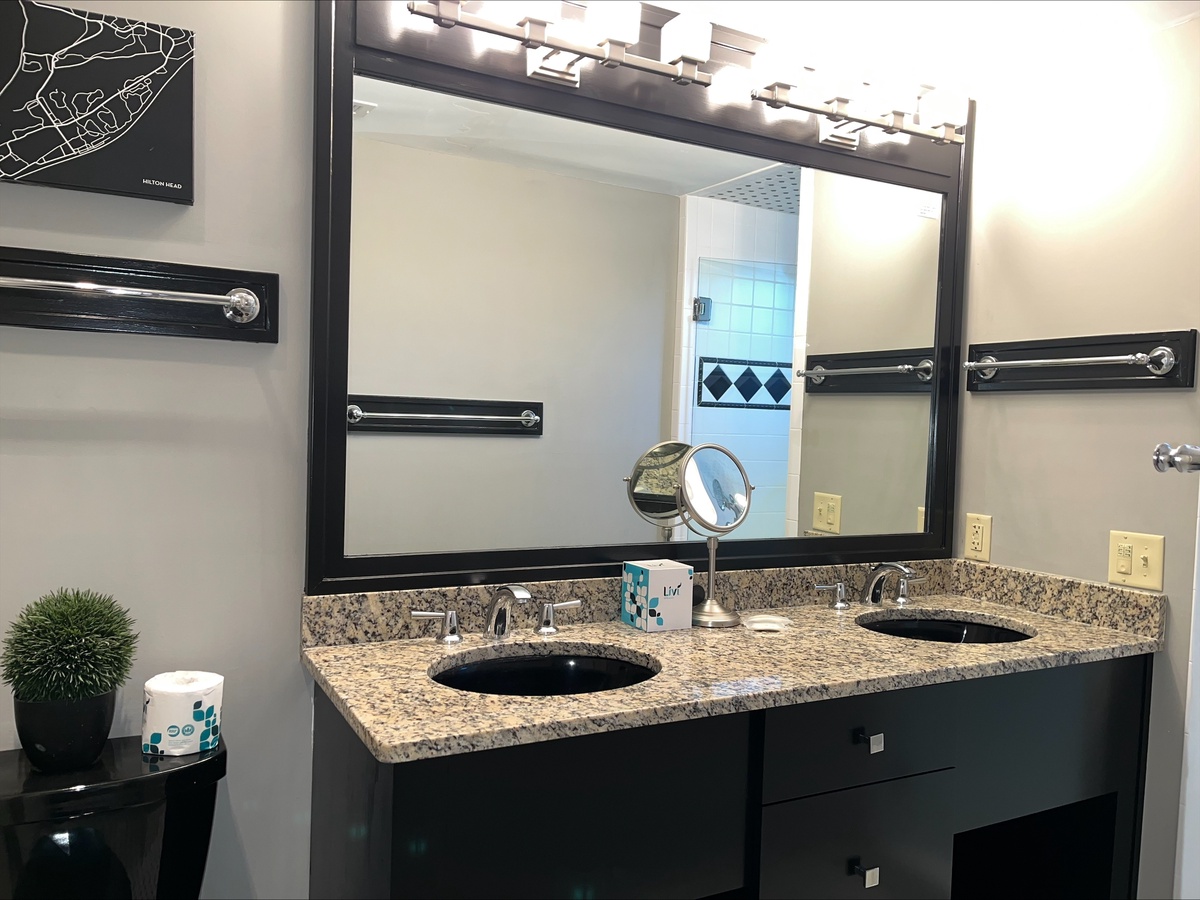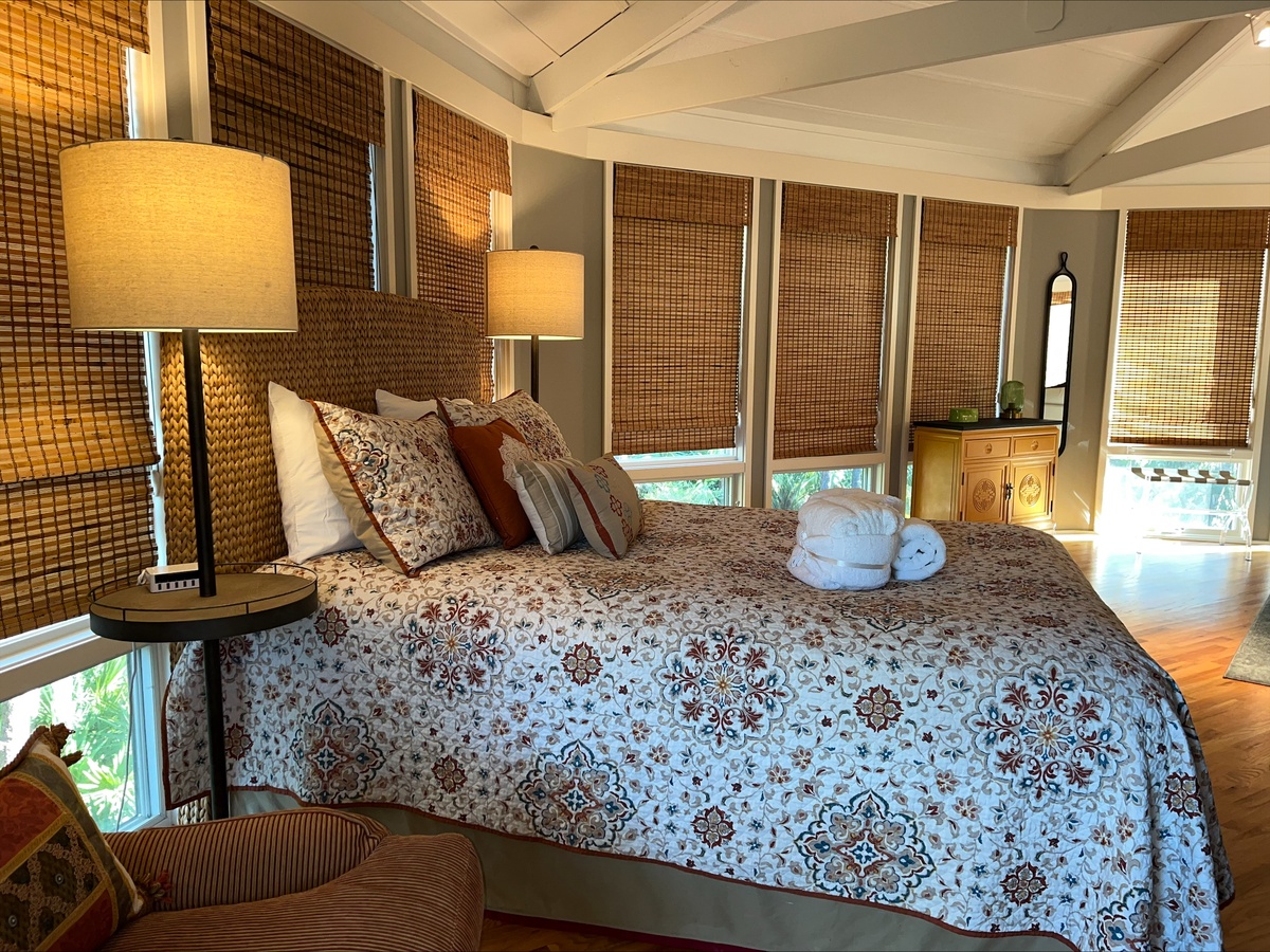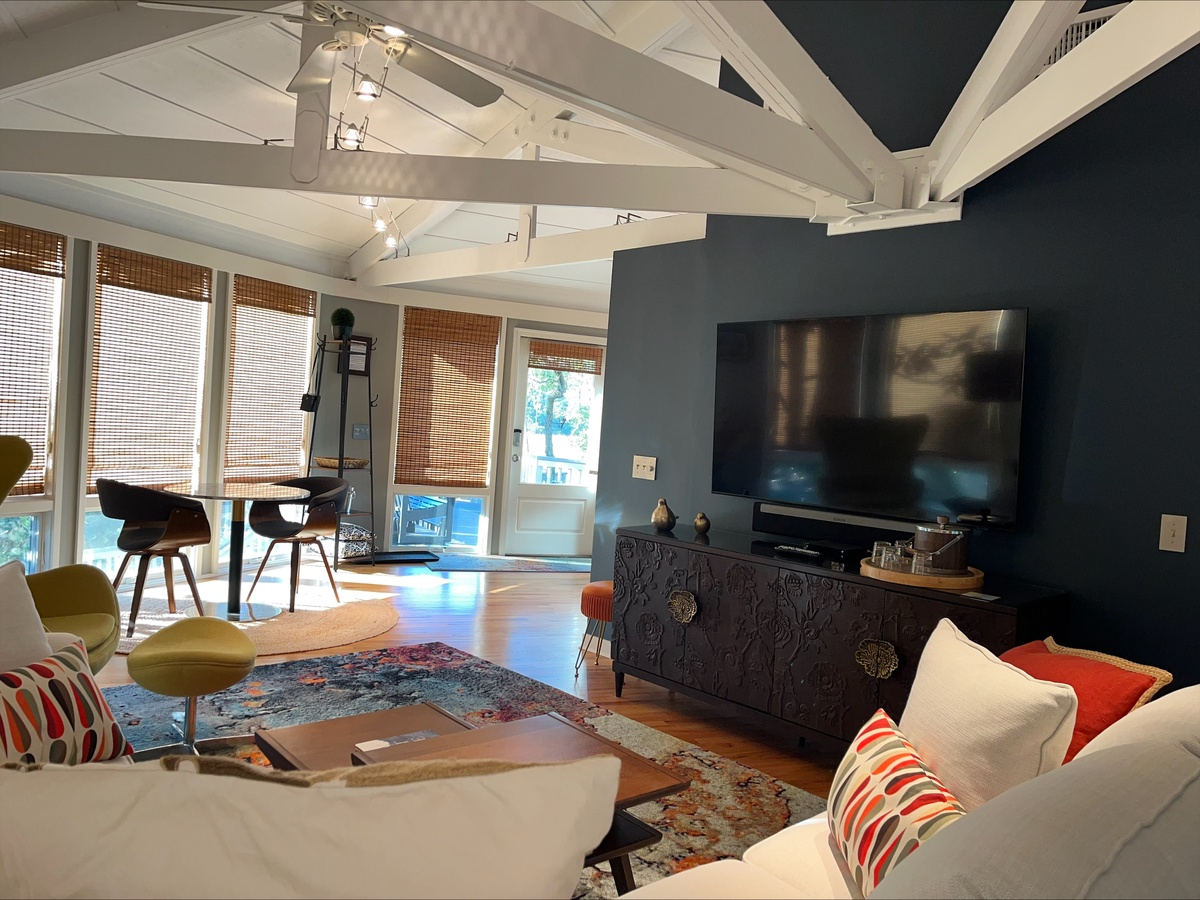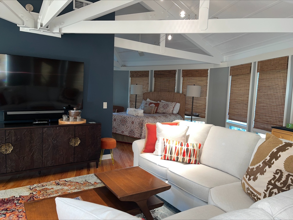 Arranged around a central pillar, the open floor plan of this ingenious design allows for unparalleled marsh views from any point in the villa. Whether you’re tucked into the plush queen size bed, lounging on the sectional sofa with its flat-screen TV or enjoying a meal at the cozy dining table for two, you’ll marvel at the scenery that surrounds you.