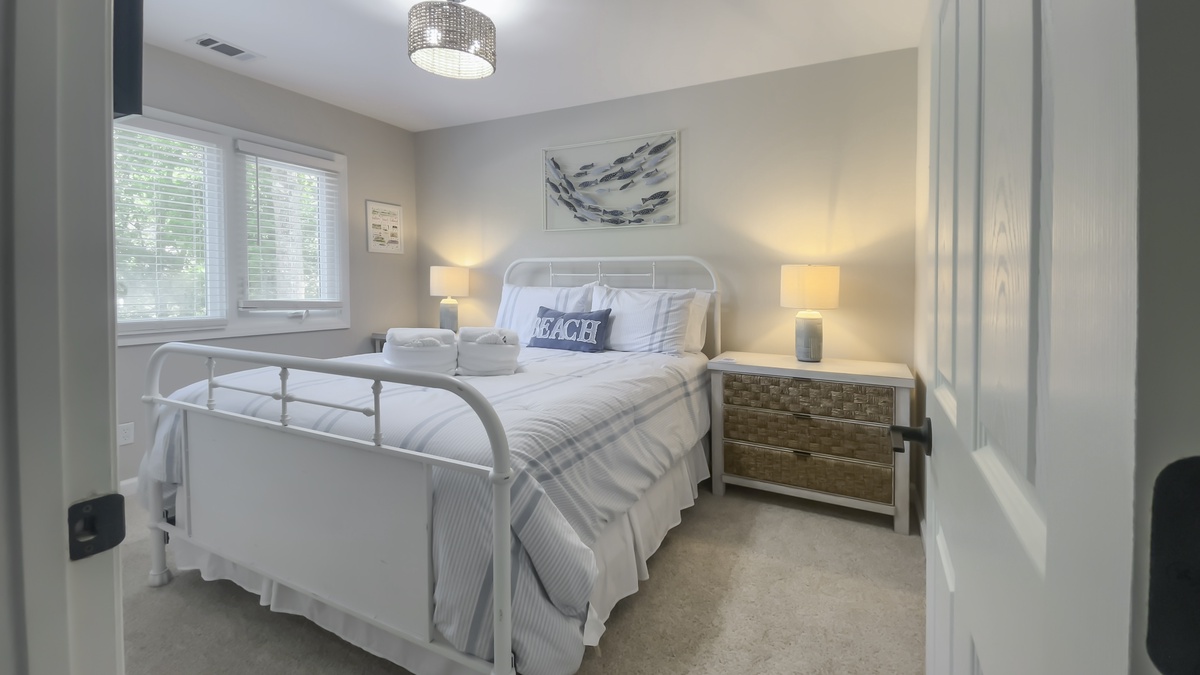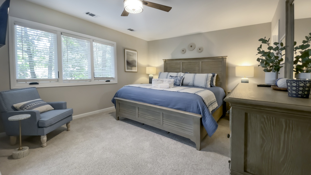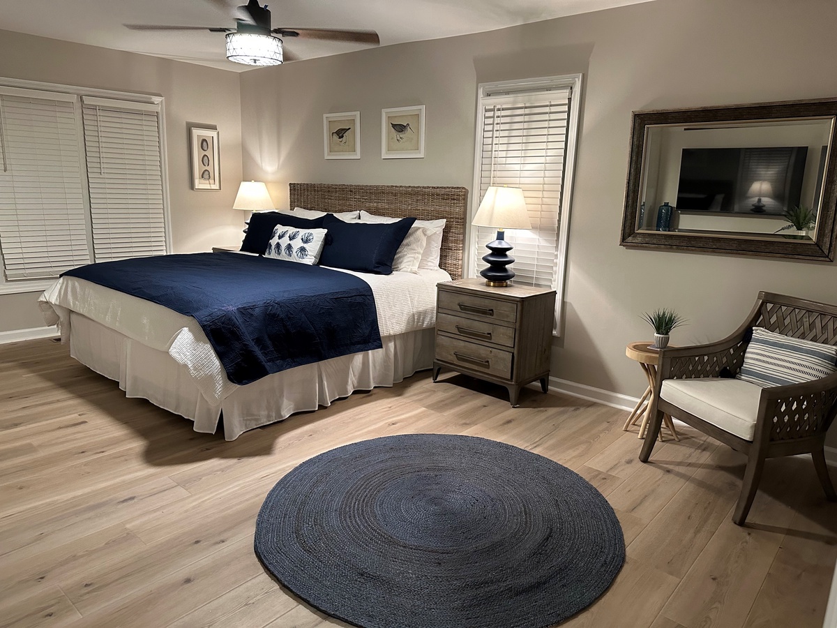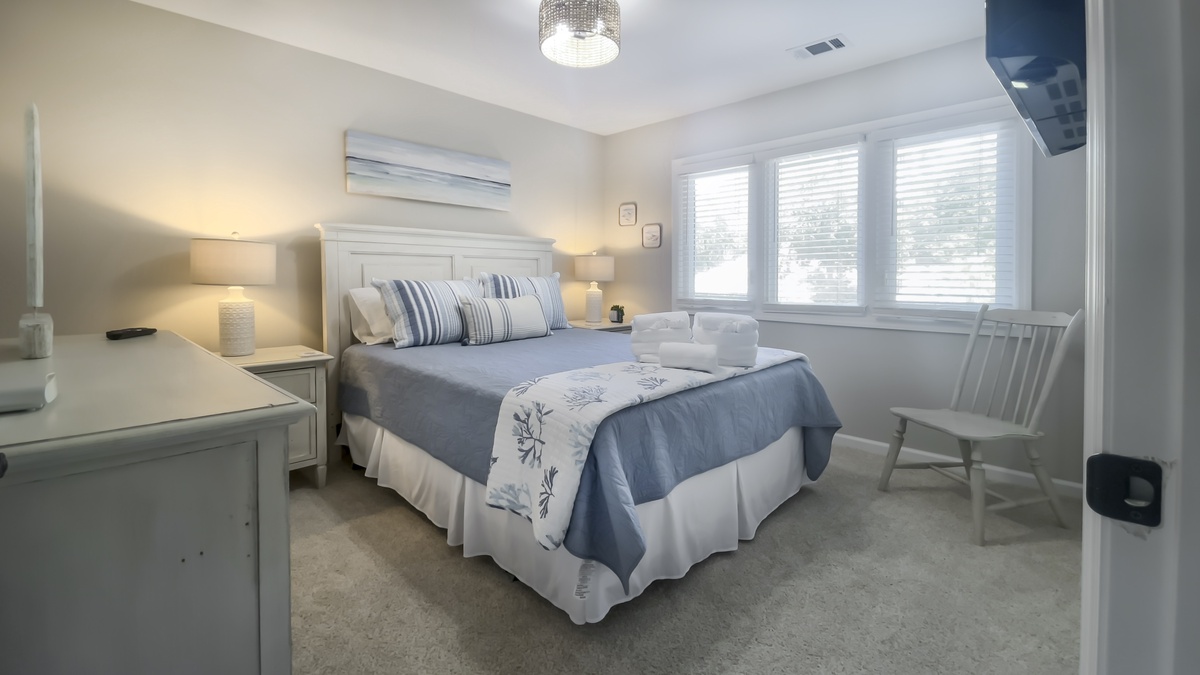 Two more bedrooms can be found on the ground floor. The first, just down a private hallway that includes washer, dryer and full bath with walk-in shower, enjoys a queen-size bed and comfortable ceiling fan. The second, the largest suite in the property, boasts a king-size bed, ceiling fan, flat-screen TV, windows on two walls and wonderfully updated en suite with dual-basin vanity and walk-in shower.