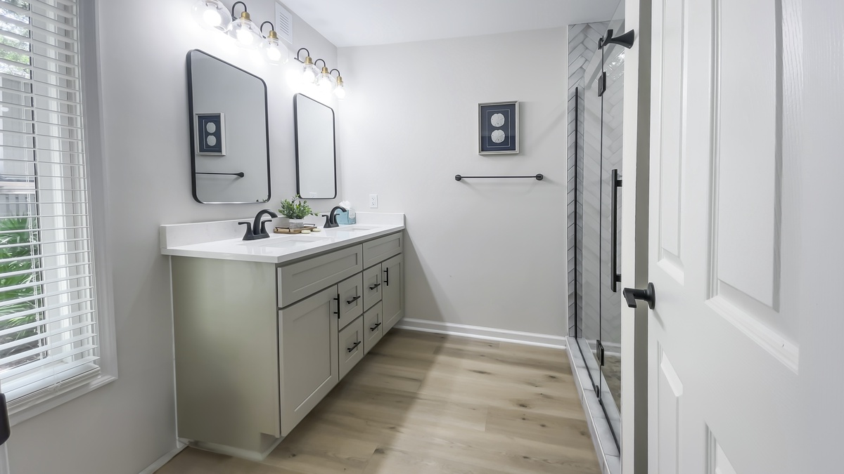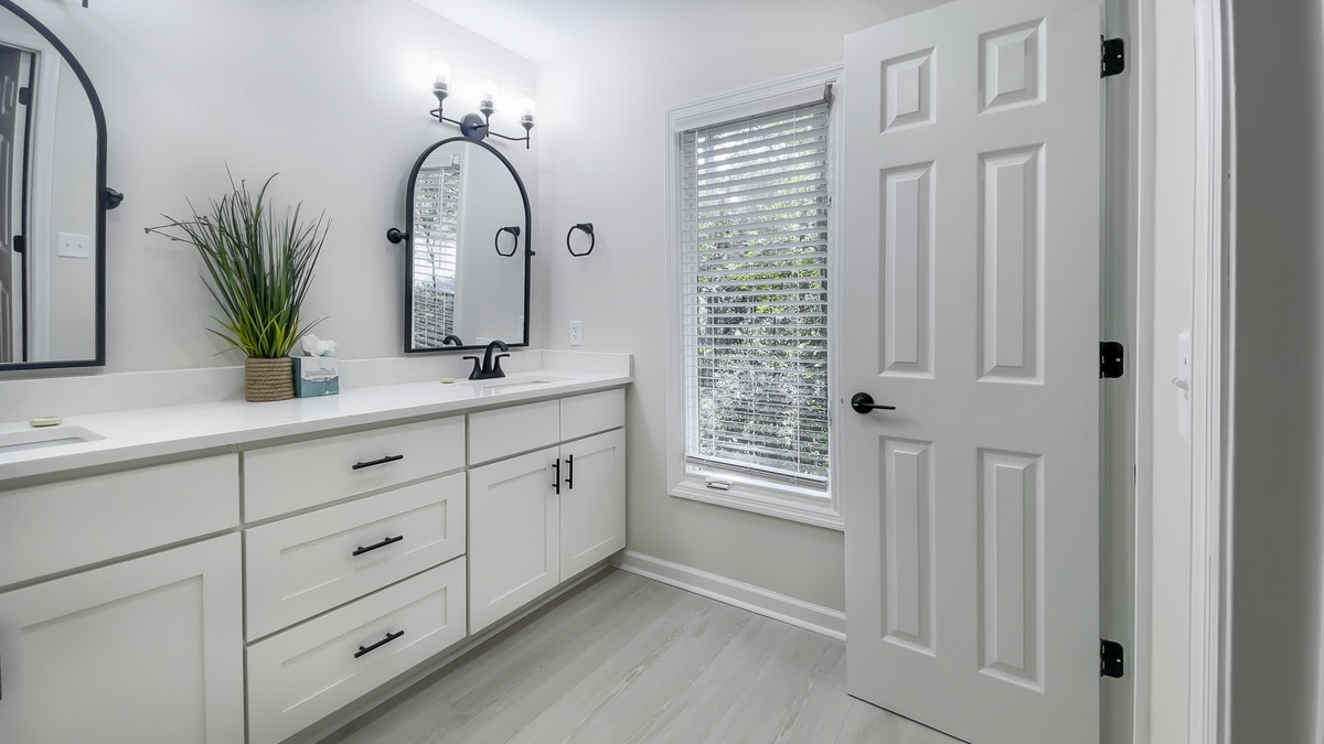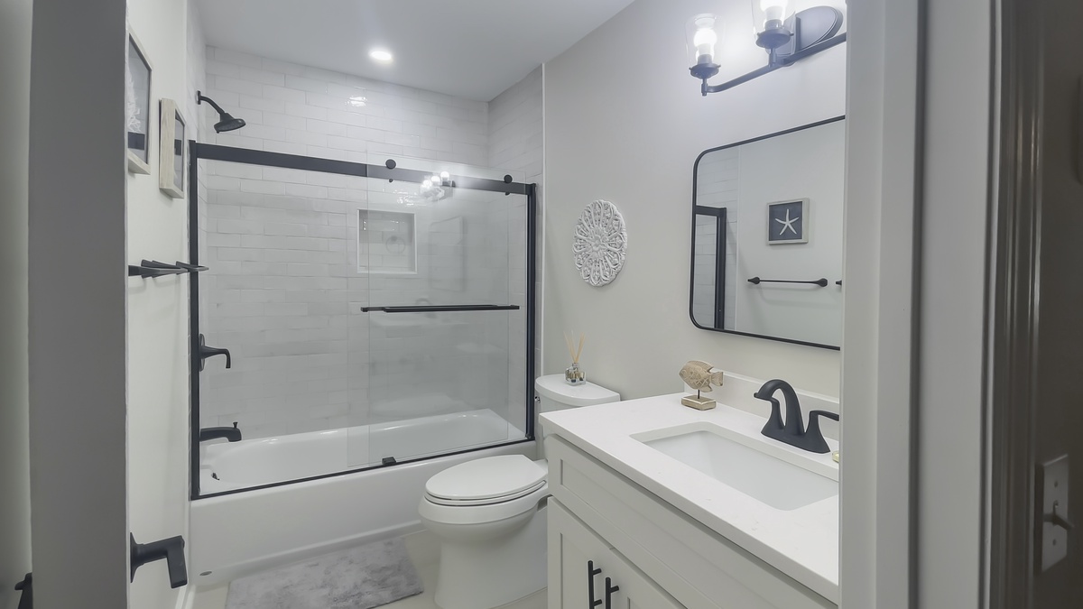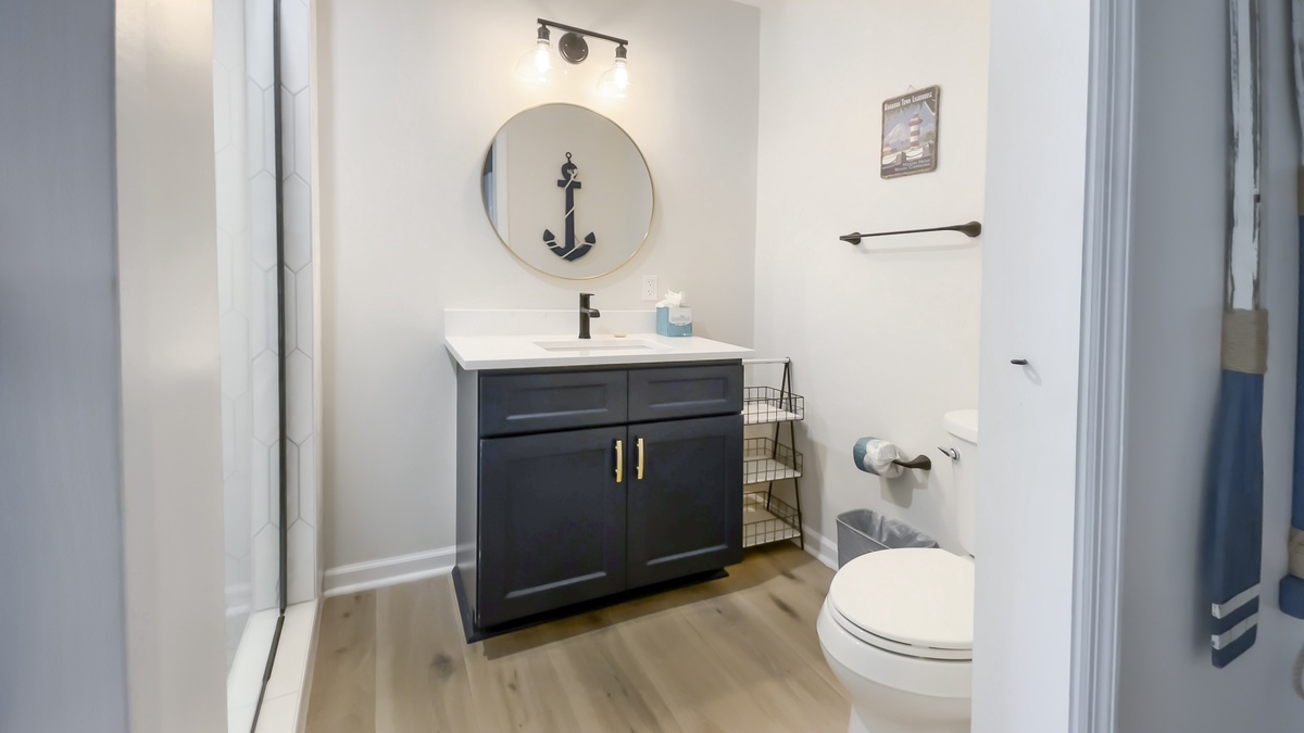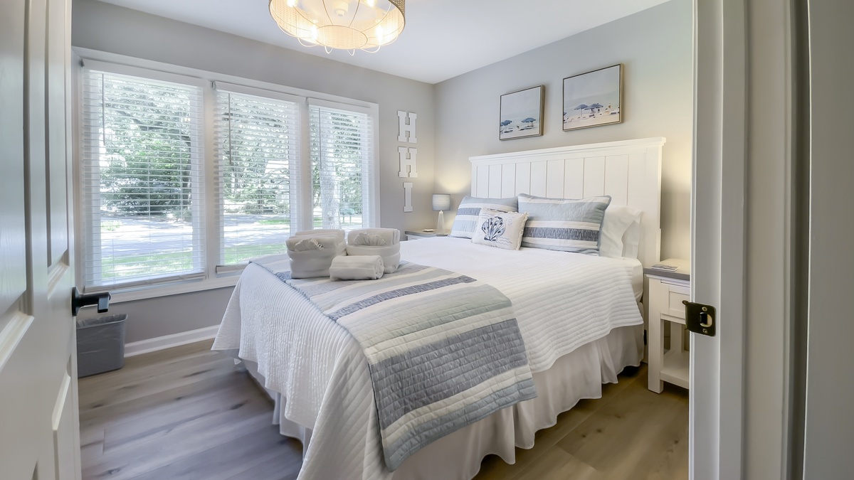 Two more bedrooms can be found on the ground floor. The first, just down a private hallway that includes washer, dryer and full bath with walk-in shower, enjoys a queen-size bed and comfortable ceiling fan. The second, the largest suite in the property, boasts a king-size bed, ceiling fan, flat-screen TV, windows on two walls and wonderfully updated en suite with dual-basin vanity and walk-in shower.