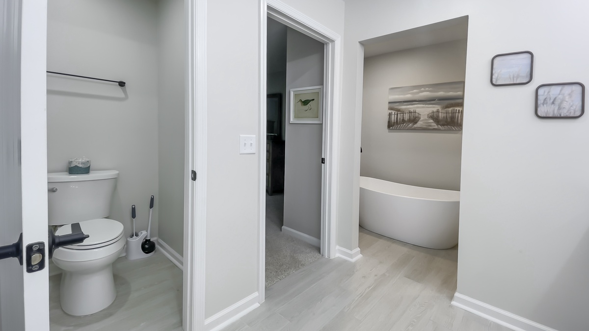 So many grand spaces create a majestic getaway for a crowd, and the five bedrooms found throughout the home offer comfort and convenience for everyone. Upstairs, a pair of spacious rooms mirror one another with plush queen beds and wide windows, sharing access to a full bath with tub and shower. An upstairs suite ups the ante with a king-size bed, ceiling fan, flat-screen TV, triple windows gazing out on the gardens and spacious en suite bath with walk-in shower.