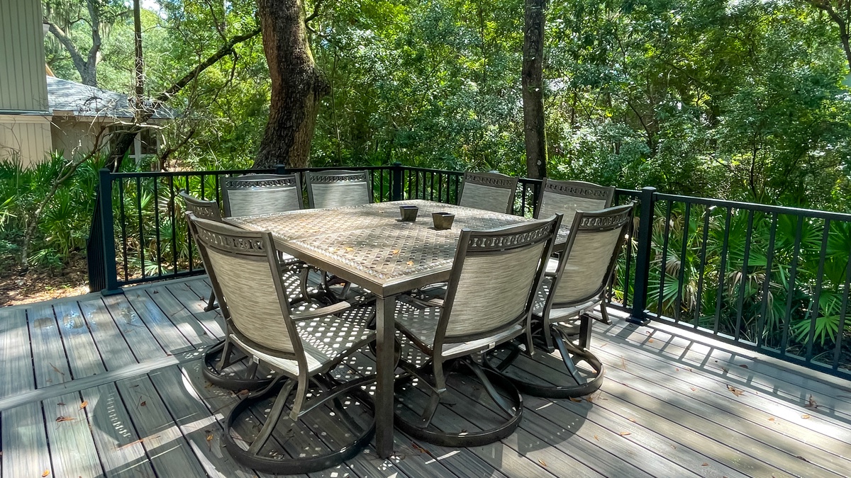 As mesmerizing a space as renovations have created inside, it’s the outdoor areas that truly benefited from updates. Open wide the great room’s French doors or the den’s sliders and you’re in a sun-dappled oasis ringed with lush vegetation for privacy. Along the wide wooden deck, you can lounge in the sun, enjoy a meal al fresco at the wide patio table or cook up something delicious on the gas grill.