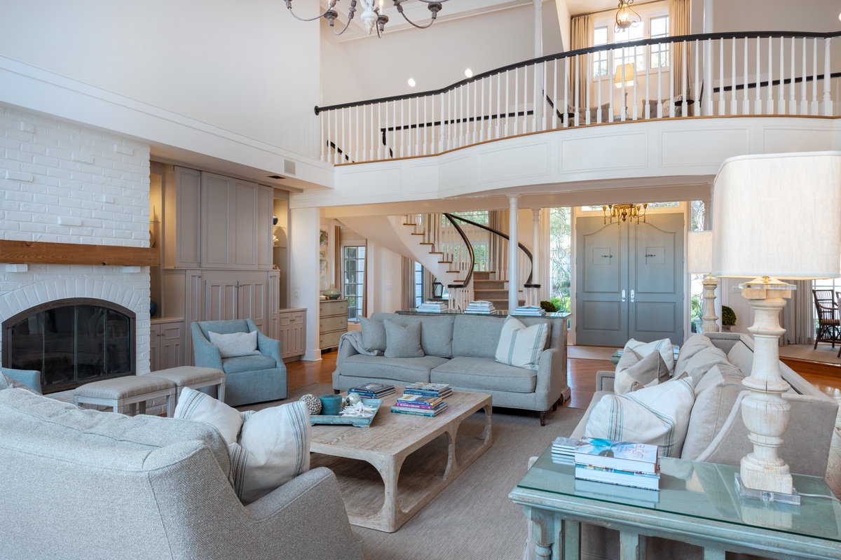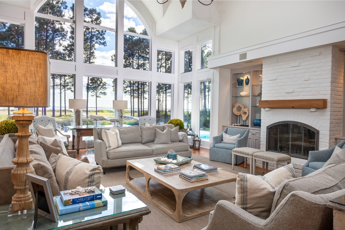 Exult in the sightlines that stretch across grassy dunes toward the sea from every point in the massive great room, an expansive setting blessed with updated built-ins framing a flat-screen TV, decorative fireplace and trio of plush sofas. Situated around this space, elevated platform dining and an open kitchen create an airy, breezy space for the whole party to come together.