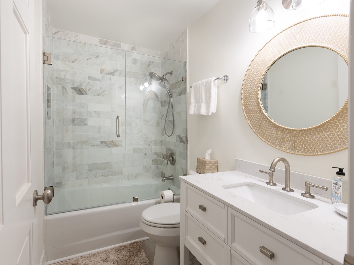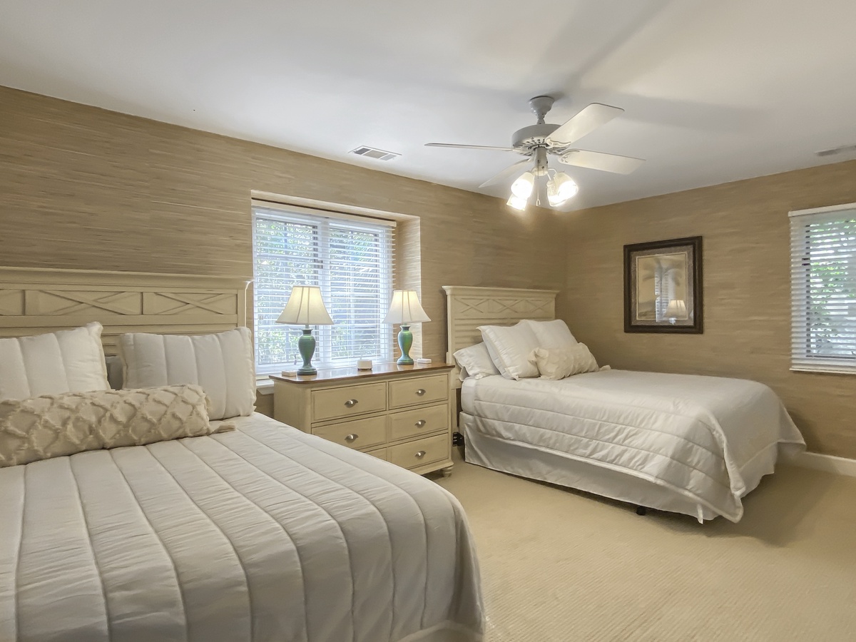 On the second floor, up the graceful staircase, you will find two additional bedrooms. One guest room features a lovely view of the marsh out the front window. The furnishings include a beautiful Henry Link wicker king size bedroom set along with a lovely Tommy Bahama themed bunk bed (twin over full), and ample closet space. This room's updated private bath features bright lighting, a blue vanity with marble top and shower. The second guest bedroom features lovely grasscloth covered walls and also provides a view of the marshlands. It holds two queen sized beds covered in a neutral cream, a ceiling fan, and a private updated bath with bright lighting, a lovely marble top vanity, and a tub/shower combination.