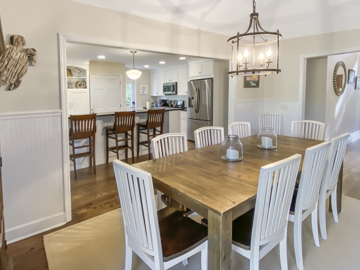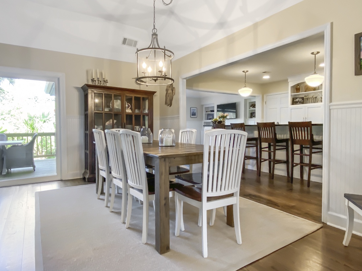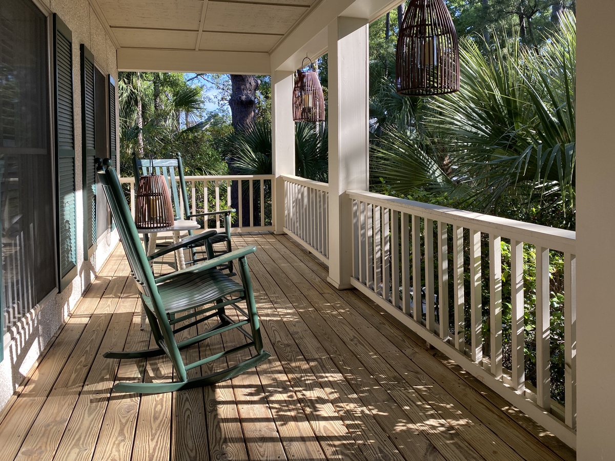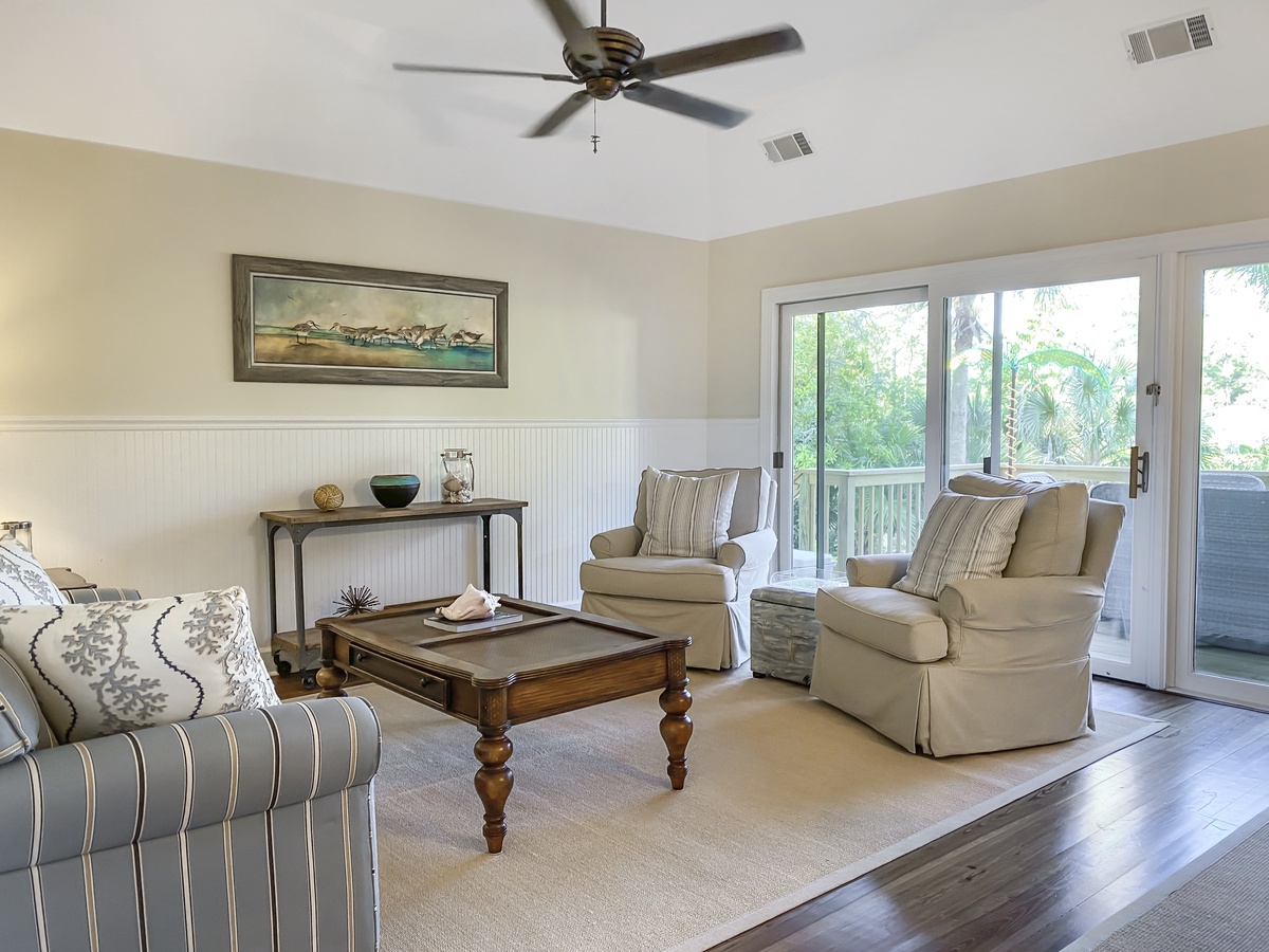Located in the heart of South Beach at the end of a quiet cul-de-sac and nestled next to Tower Beach, this charming Lowcountry home is warm and welcoming with a wide front porch and rocking chairs. Every single detail is beautifully attended to in this incredible home. Heart-of-pine floors greet you in the entry, which expands into tranquil and open living and dining rooms. The dining room seats eight and overlooks a quiet lagoon, palmettos and native wildlife. With southern-inspired furnishings and beadboard wainscoting, the living room features comfortable seating including a sleeper sofa in tones of soft blues and sand.